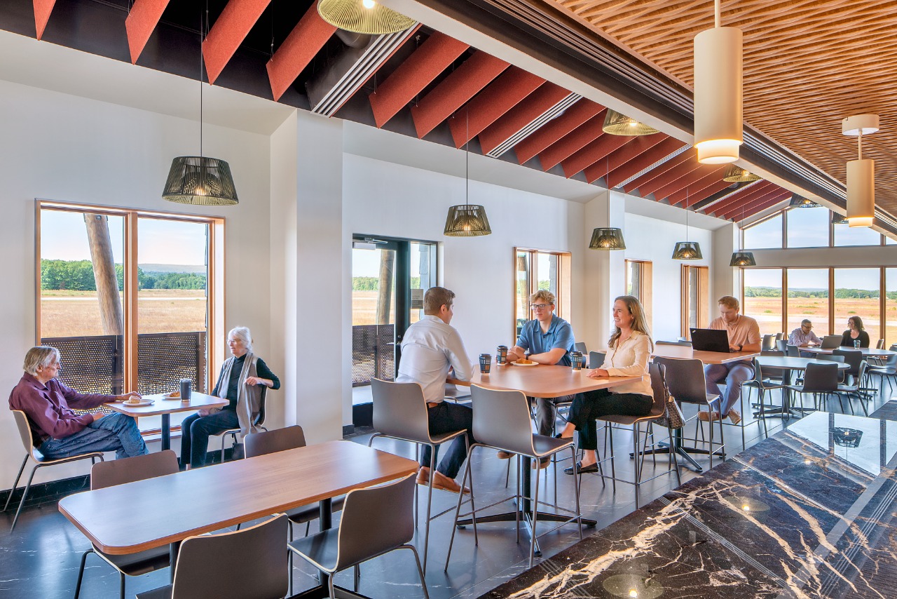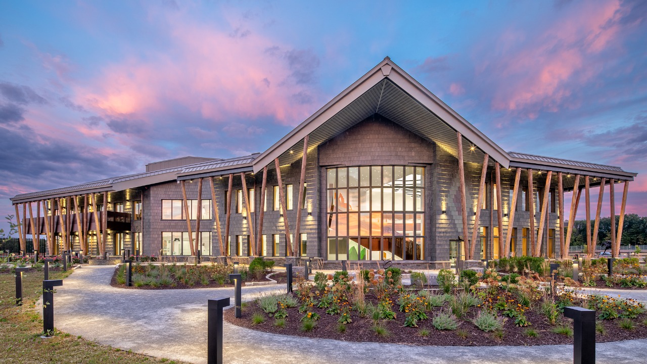 Victorian-era porches and the lodge architecture of the nearby Adirondack mountains inspired the building’s form and materials to create a contemporary yet familiar presence. A wrap-around porch, timber columns, slate wall cladding, and ashlar slate base grounds the building in its regional context by using historically relevant and locally sourced materials to reinforce a sense of place.
