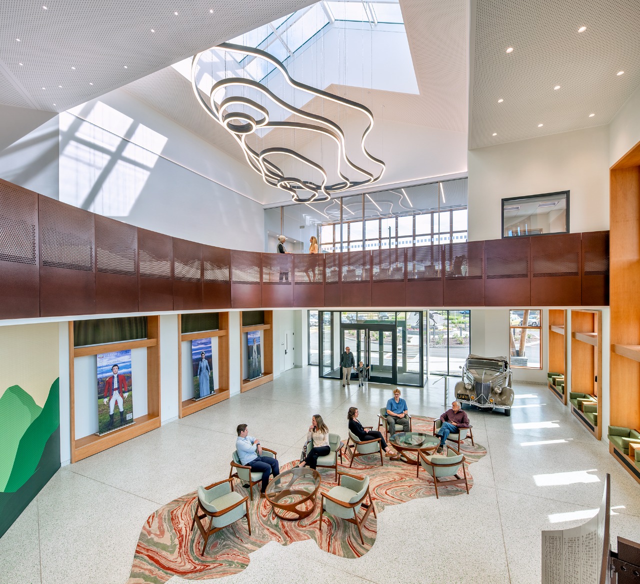 Visitors are welcomed into a light-filled lobby anchored by a custom carpet shaped like Saratoga Lake. The spacious lobby features locally inspired wall graphics, with space to display art and historic items such as antique cars from the Saratoga Automobile Museum. A grand staircase leads to a second-floor multi-media community meeting space and a dining area with views to the newly rehabilitated and expanded apron, while a balcony and courtyard further connect interior spaces to the site. The terminal includes two spacious passenger waiting areas, concessionaire tenant spaces that open onto the landscaped courtyard, a restaurant, rental car lease space, pilots’ room with weather information access station, and connected 20,000 SF hangar.