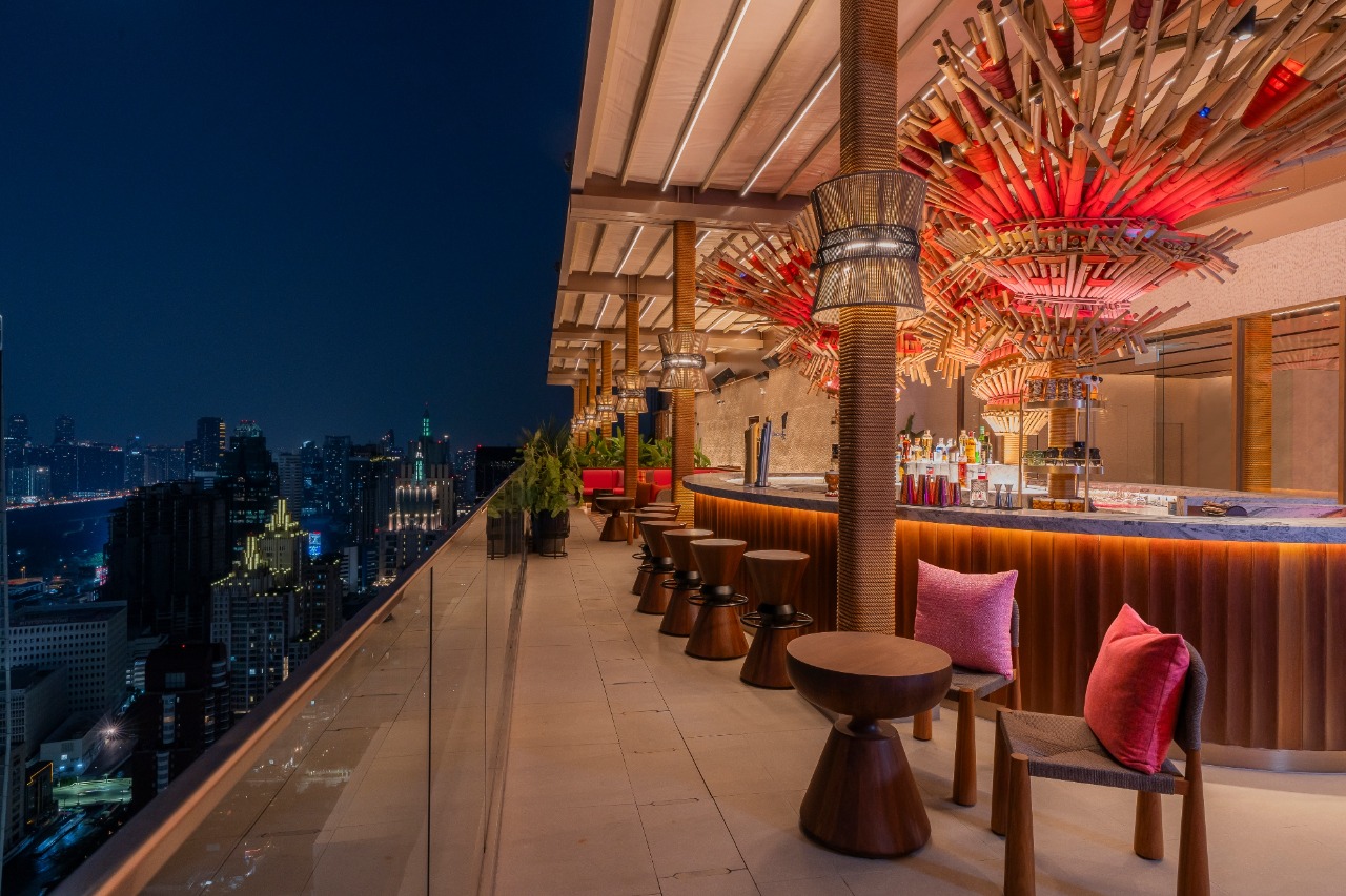 At the heart of the project is “The Hive.” Inspired by collective energy, the design translates this into a spatial language of rhythm, texture, and interaction. The rooftop becomes a layered environment of discovery and framed views, where guests move fluidly between zones. This aligns with its positioning as a high-energy destination where Thai-Isaan vibrancy meets Japanese precision in both design and culinary expression .
