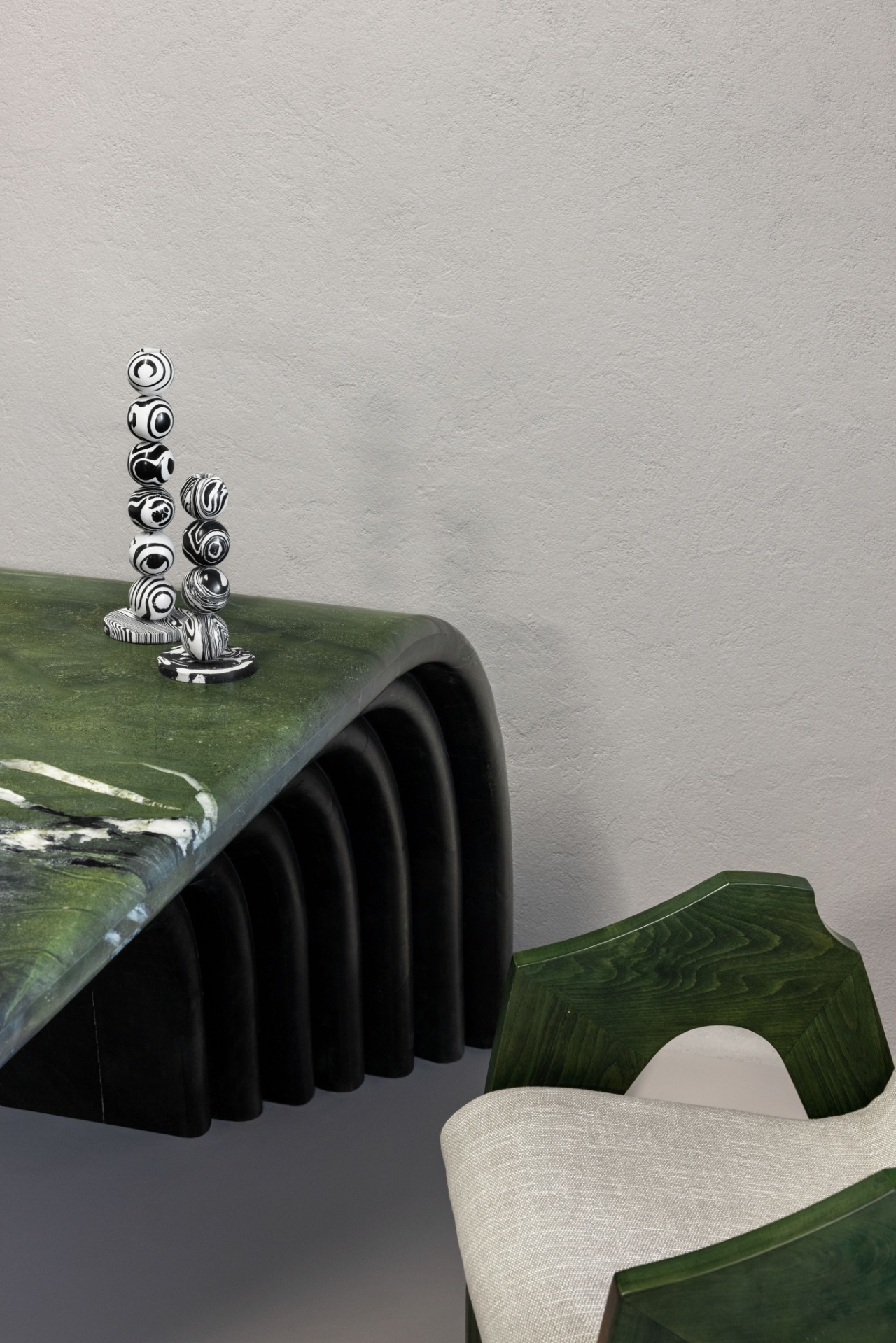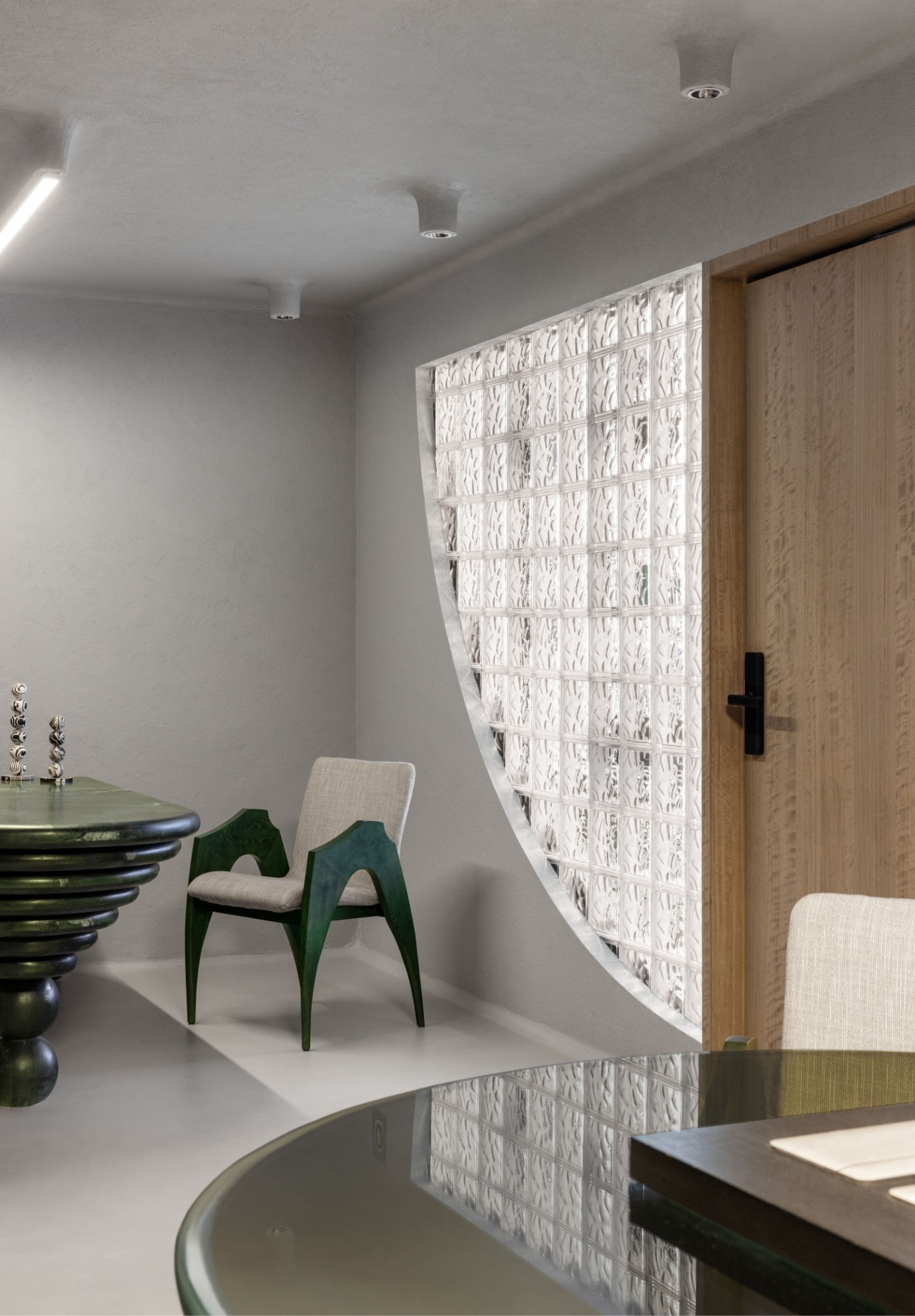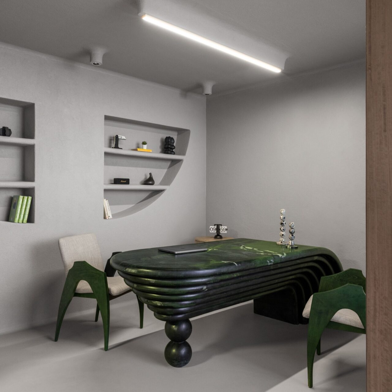 At the heart of the office, a green avocado stone-carved table anchors the space as both functional workstation and sculptural centrepiece. Quarter curves choreograph flow and proportion throughout, while carved details and architectural miniatures embed symbolic references to the craft and identity of a property broker. Even the meeting room table base emerges as a metaphorical architectural form, reinforcing the spatial ethos.