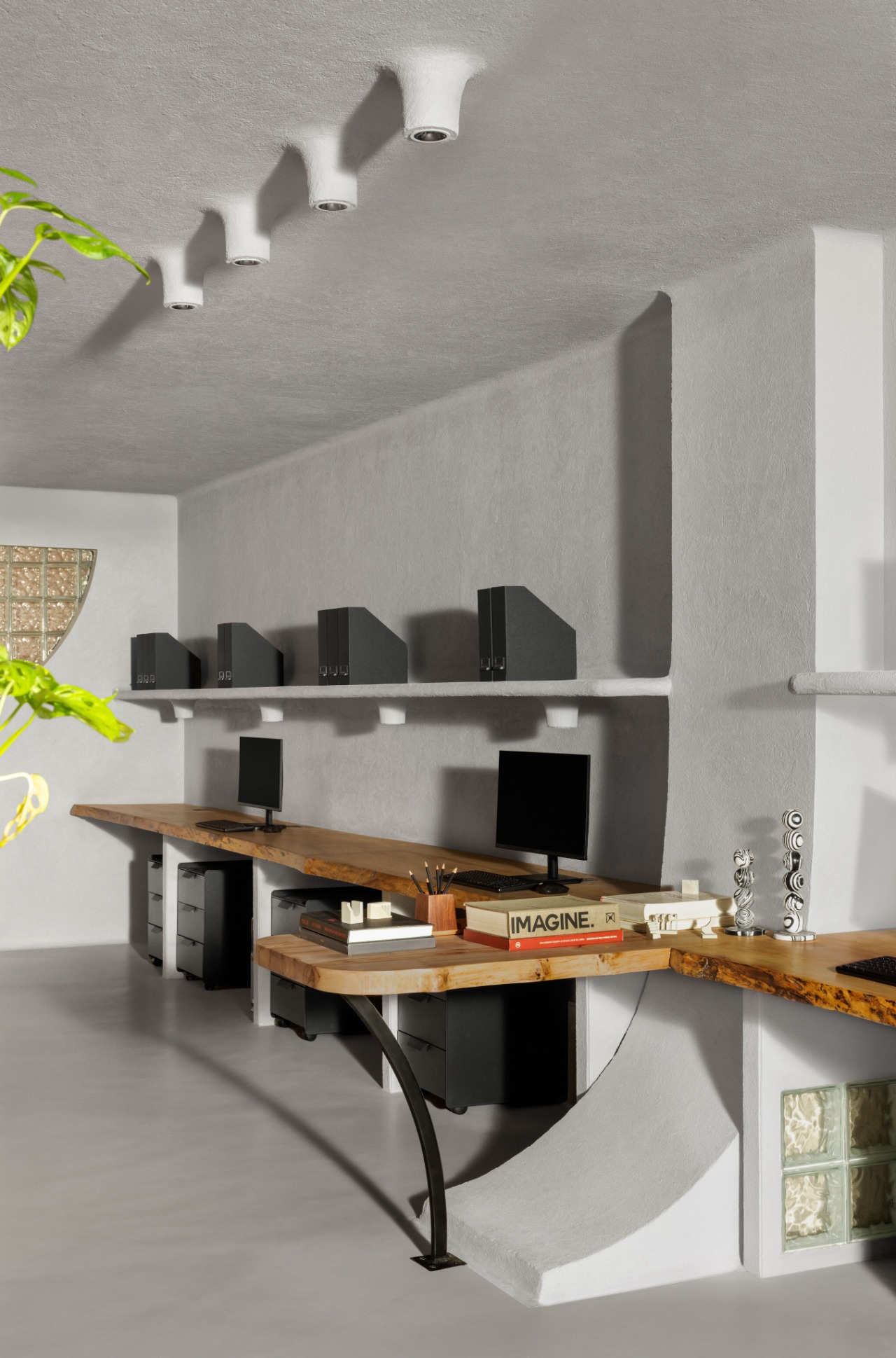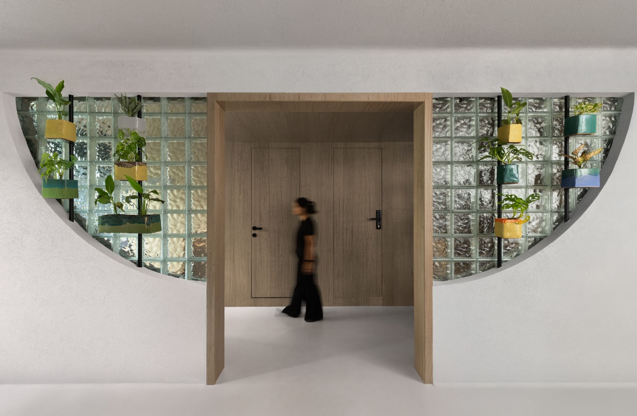 Sustainability is not a layer but the very skeleton of the project. Its biophilic dimension softens the tactile austerity of concrete — partitions double as vertical gardens, animated by “grow” LED lighting, while handmade ceramic planters punctuate the space with organic warmth.