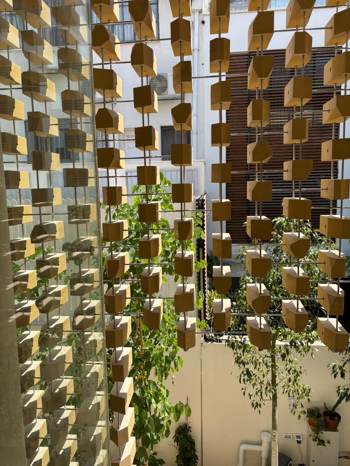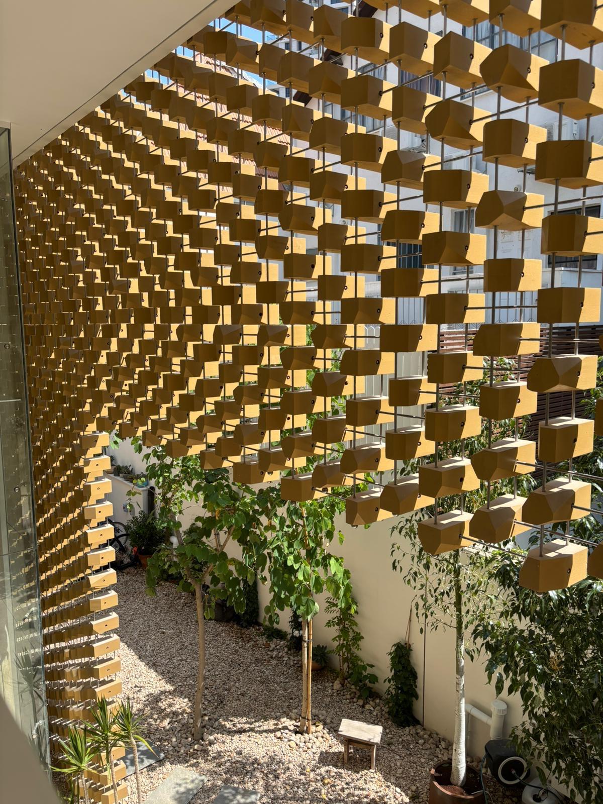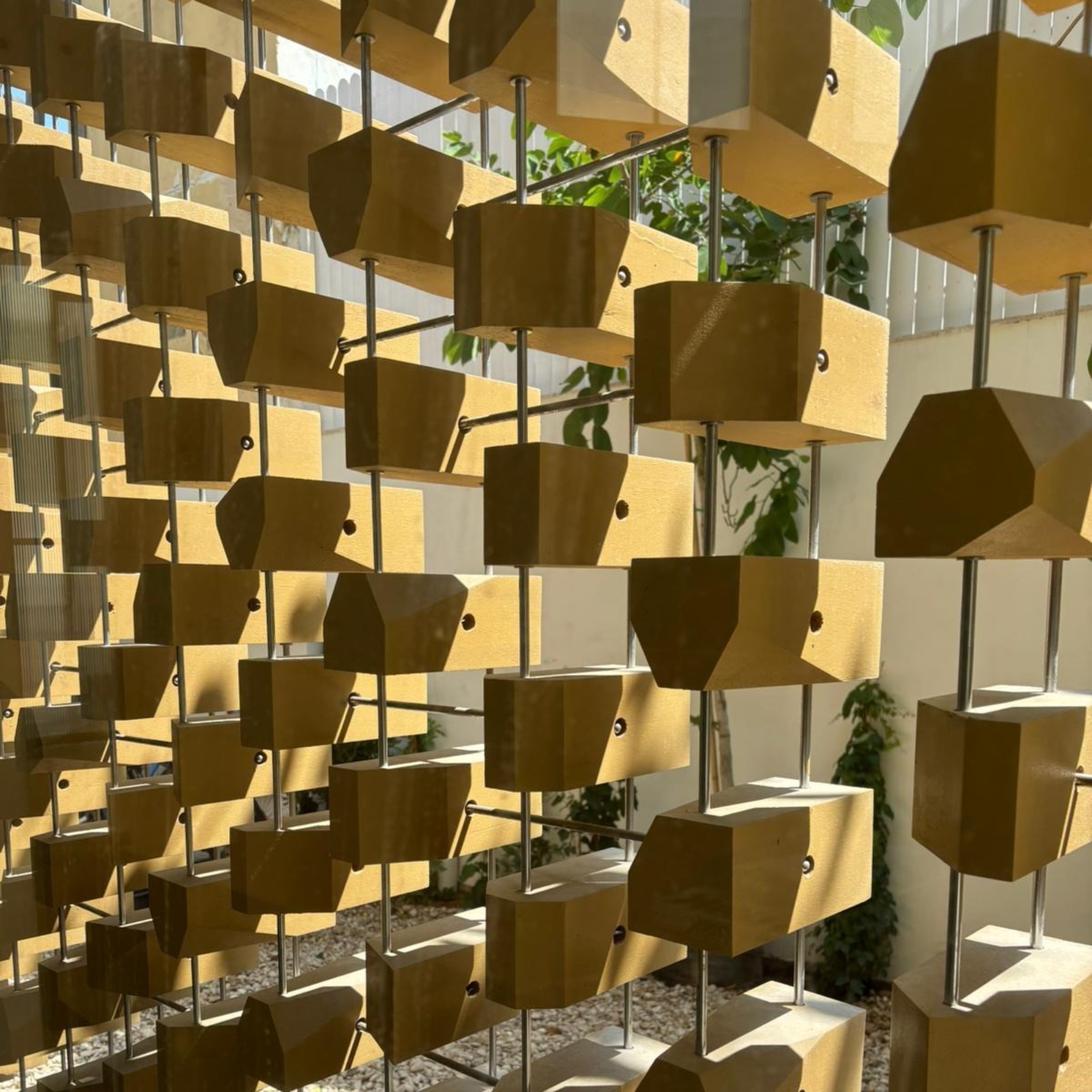 Conceptually, the project draws inspiration from Japanese aesthetics, particularly the notions of Wa (harmony) and Ma (the space between things). These ideas guided the balance between order and randomness, fullness and void, structure and light. The seemingly irregular inner cuts of each cube evoke an organic rhythm, where shadow, air, and silence become part of the composition. Through this approach, Secondskin becomes not only a functional shading device but also a poetic expression of spatial harmony and crafted precision.
