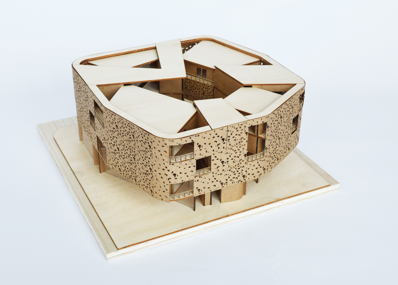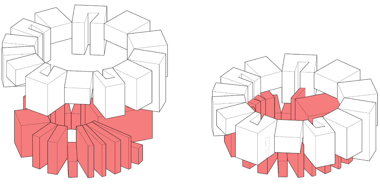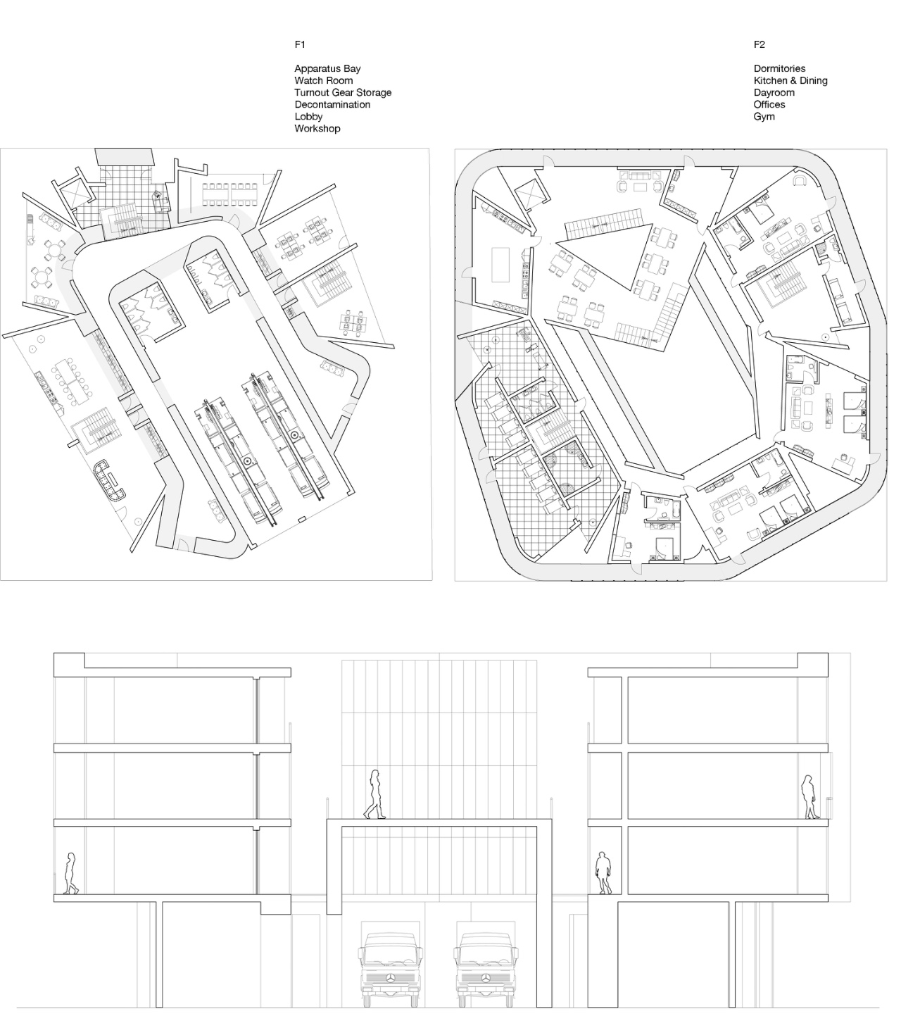 This duality is spatially manifested through a foundational morphology of two concentric rings. Through an extensive physical modeling process, the massing was refined into a larger, heavier outer ring enveloping a smaller inner ring. By intersecting these distinct volumes at offset angles, the design generates entirely new spatial conditions, forming precise vertical drops for rapid-descent fire poles alongside unique angular vantage points and transitional passageways.
