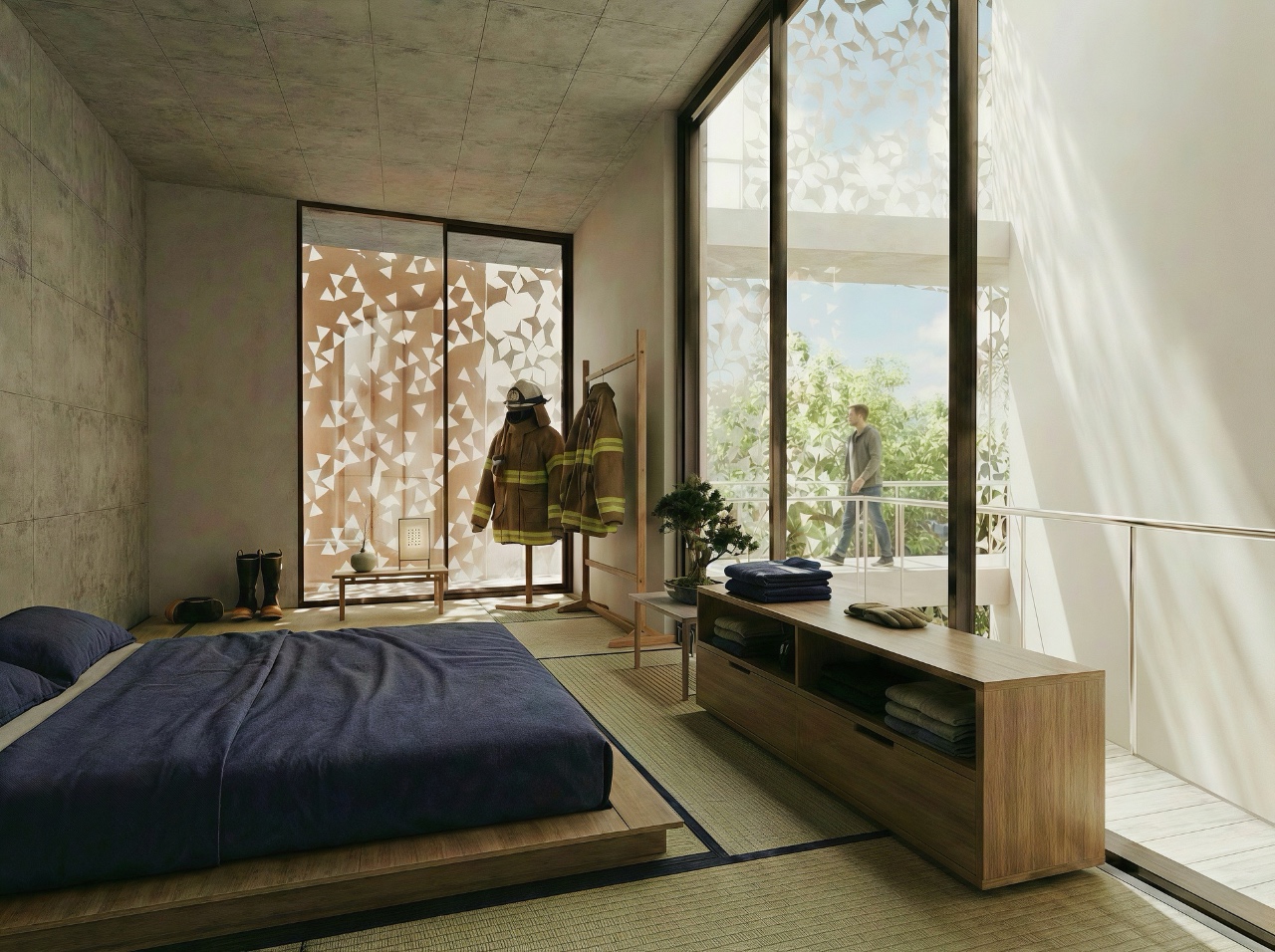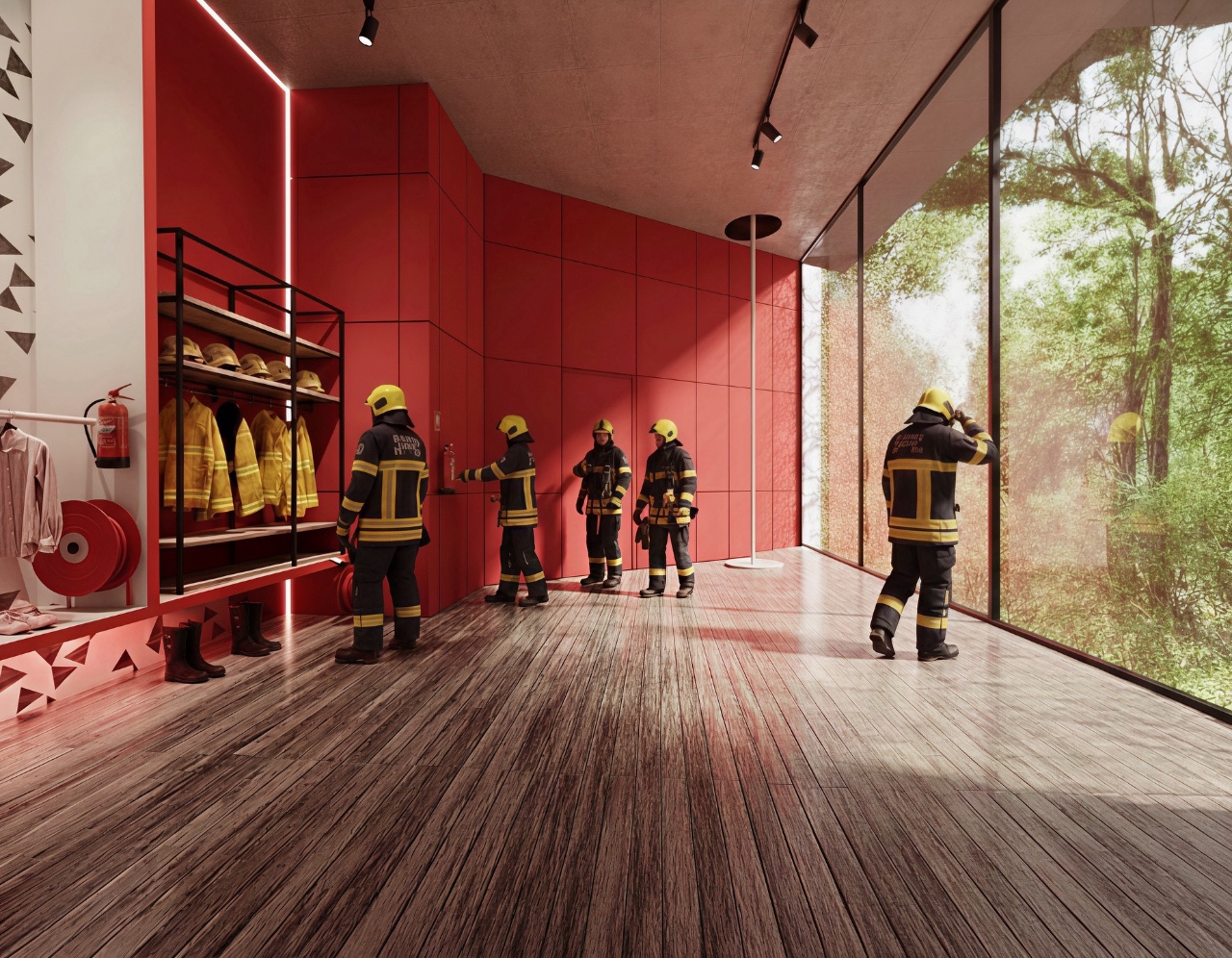 The project is driven by the design thesis of “Dual Protection,” acknowledging the reciprocal relationship of care inherent in firefighting. The architecture must facilitate both outward protection—defending the natural environment and surrounding communities—and inward protection, acting as an impenetrable sanctuary to safeguard the physical and psychological well-being of the inhabitants returning from the front lines.