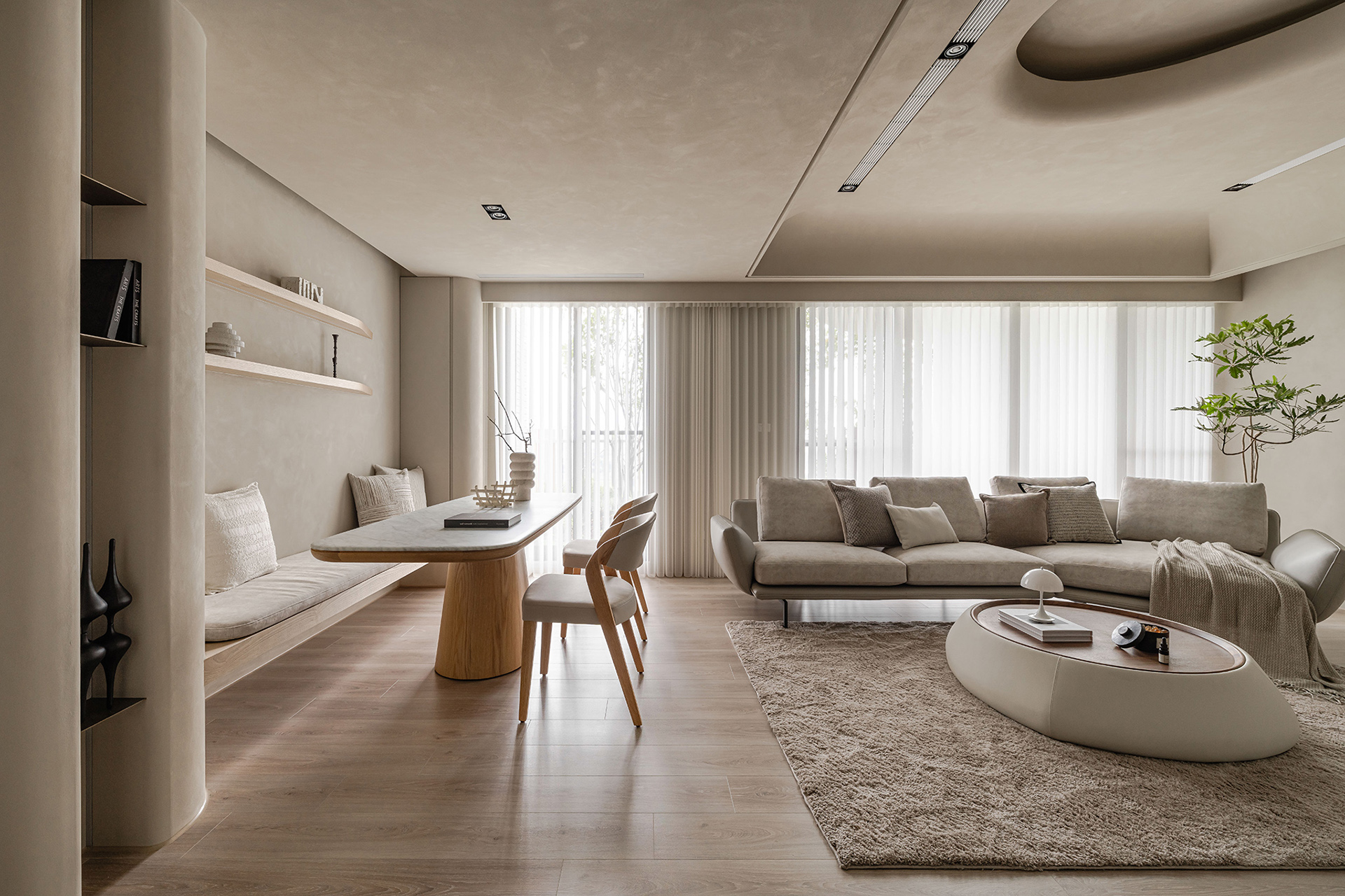 Carefully curated furnishings in organic shapes complement the curvilinear motif, as seen in the kidney-shaped coffee table and curved sectional sofa. Textural layering through plush rugs, woven throws and embroidered pillows adds depth and coziness to the serene aesthetic.Innovative lighting solutions, including cove lighting and recessed ceiling fixtures, create a warm ambiance while emphasizing the sculptural ceiling details. Floor-to-ceiling sheer curtains diffuse natural light, enhancing the ethereal quality of the space.