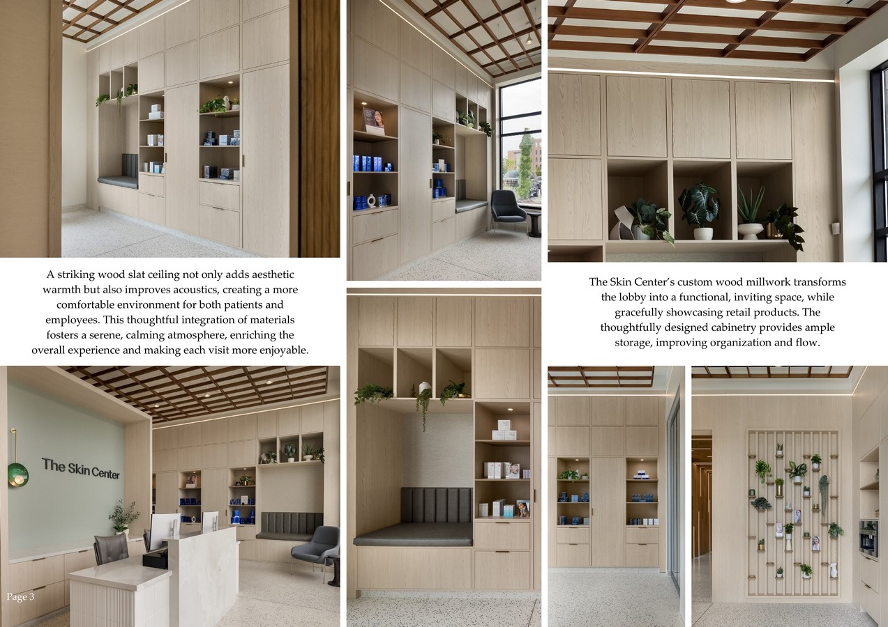 A central design challenge was maintaining this serene, natural aesthetic while navigating the strict requirements of commercial medical codes and project budget constraints. Creative material choices and compliance strategies were implemented to preserve the intended look and feel.Laminate wood-look millwork offered the visual warmth of natural wood with the durability and affordability necessary for a high-use medical environment.