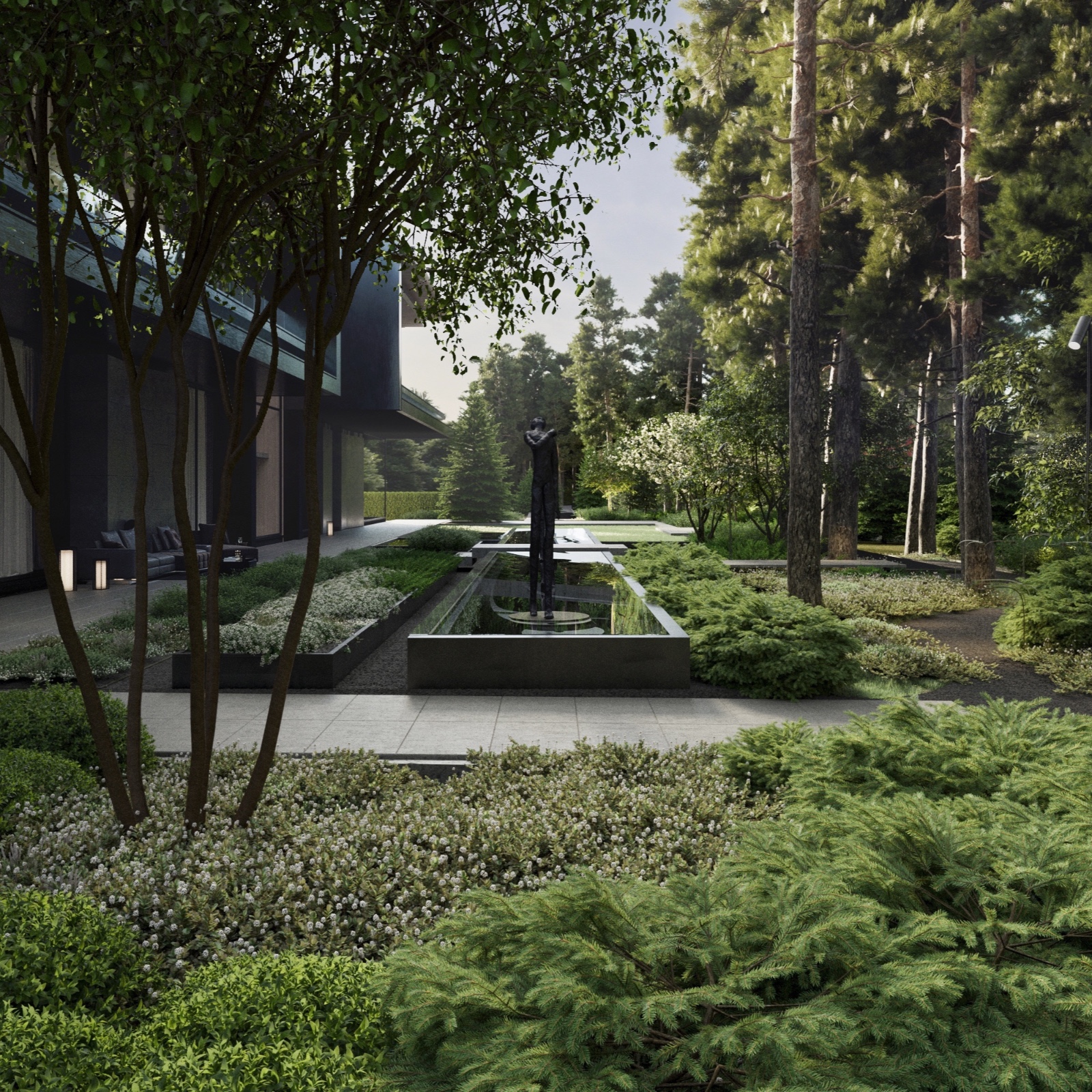 The garden is located in a quiet village in the Moscow region and covers an area of just over one hectare. The client will reside there not alone but with his extended family. He envisioned a place where every family member would feel at ease and each person could discover a secluded spot amidst the wilderness. In this way, the concept of calmness and tranquility became intertwined with our garden symbolizing a journey, which, although it appears to contrast with movement, actually establishes a balance, like yin and yang.