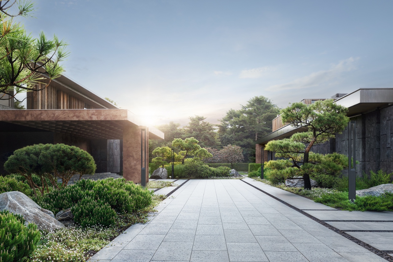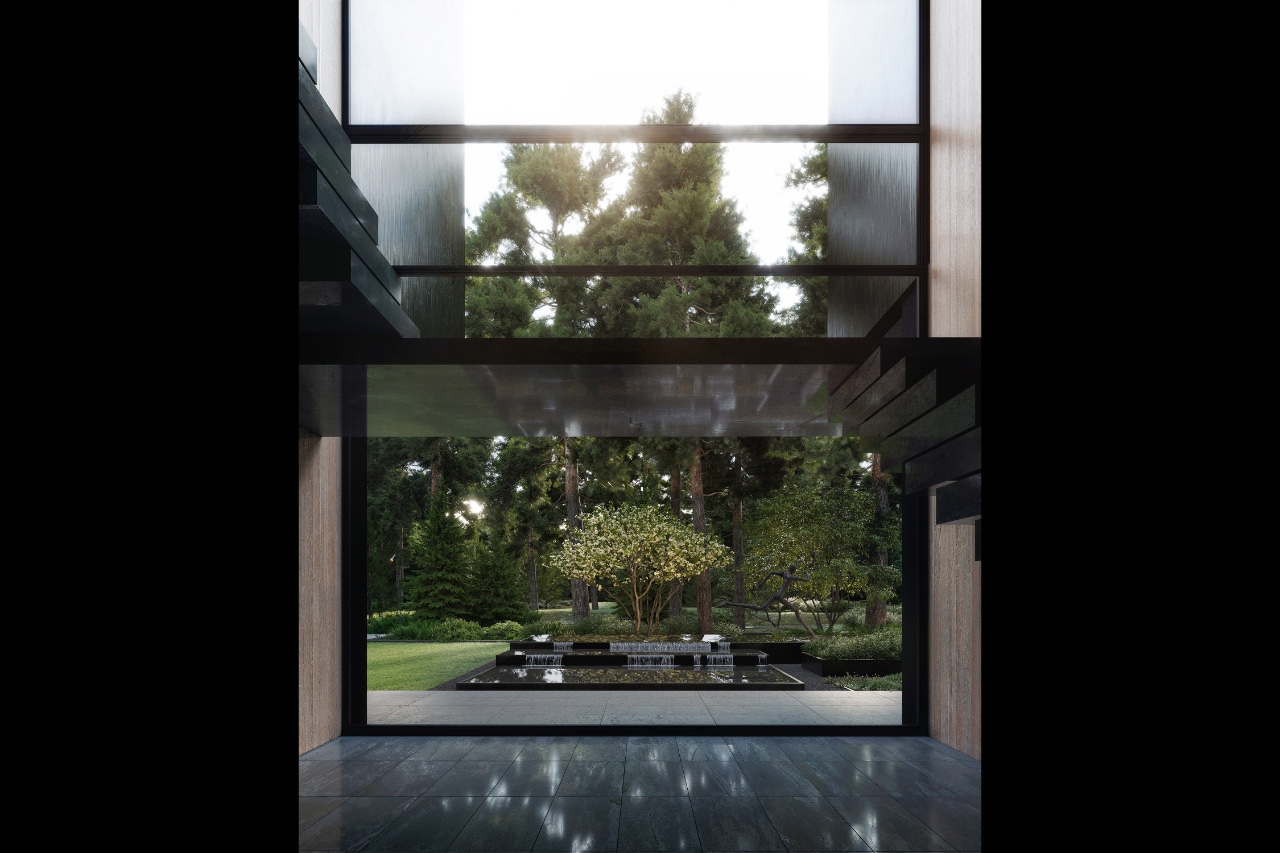 The main visual and semantic axis of the garden runs from the front door of the house to a 20-meter-long, elongated water feature via a glass atrium and stairway. By reflecting the forest and enlarging the area, the water enhances the terrace’s architectural design and gives it a sense of depth.
