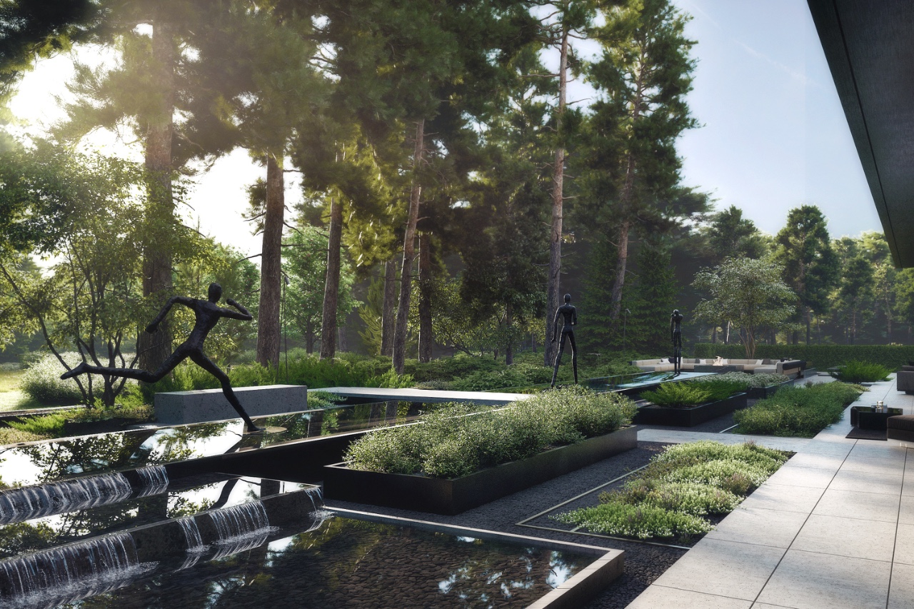The garden’s visual centerpiece is a composition of three-meter sculptures on the water: a running, walking, and standing figures, symbolizing the various paces of life, movement, and slowdowning.