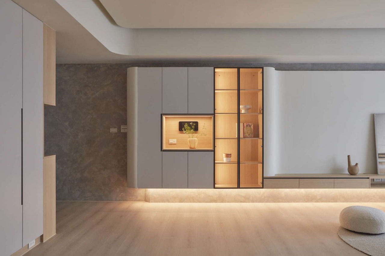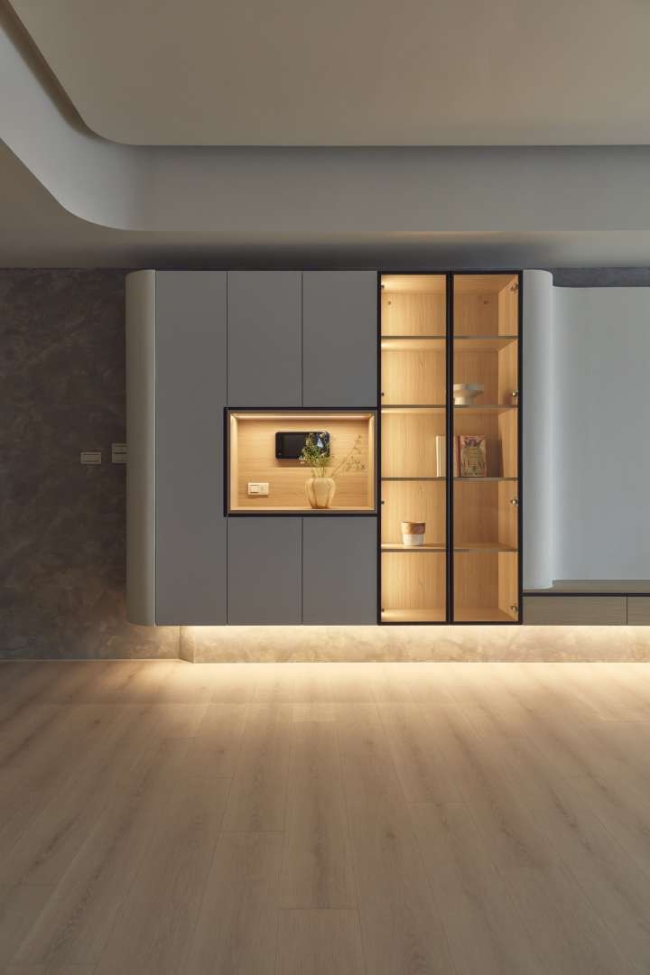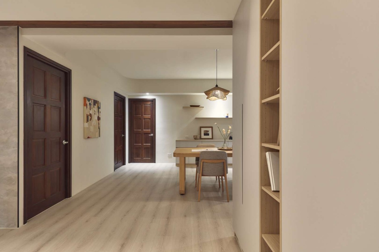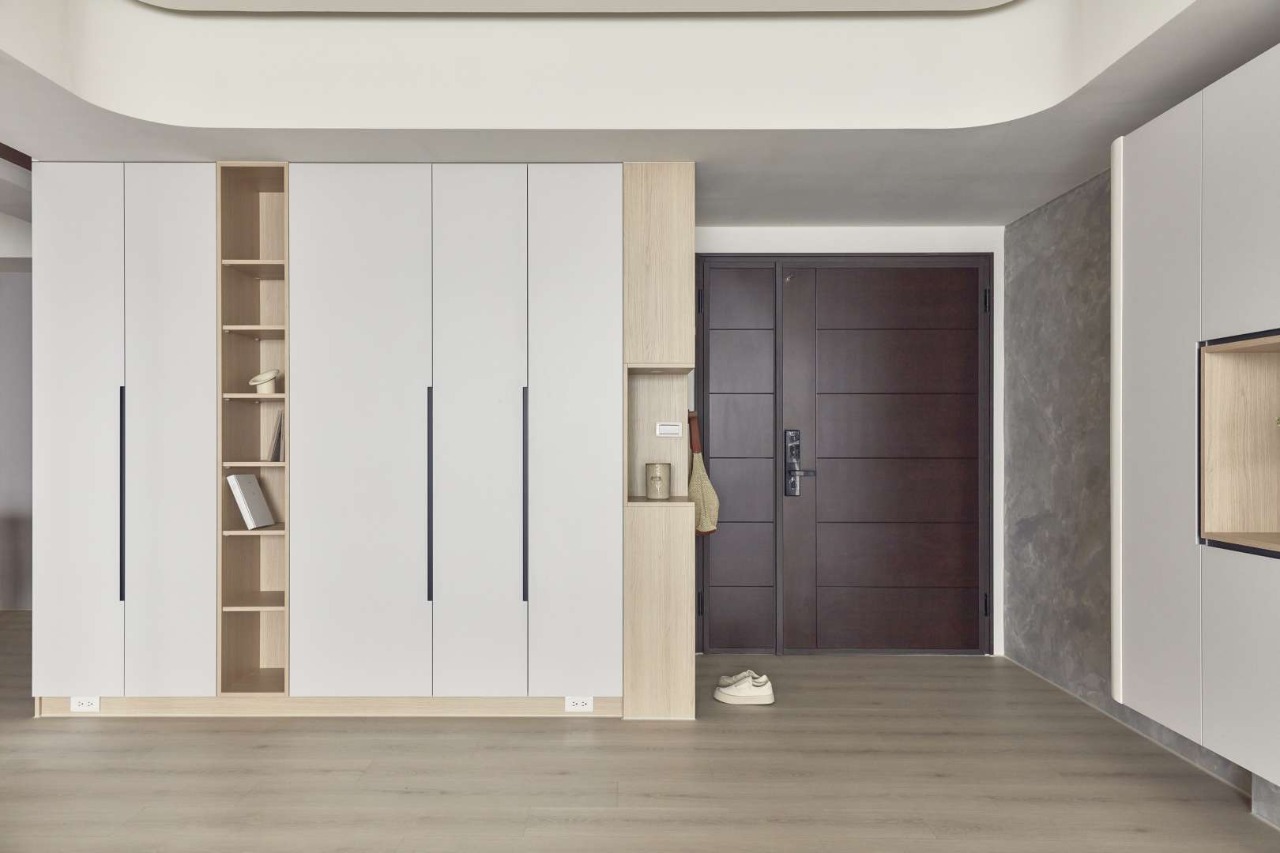 The TV wall’s semi-floating design, aligned with the main beam, enhances both storage and visual continuity. Functional details, such as entryway hooks, reinforce the home’s balance between order and convenience. With deliberate zoning and design, the first impression upon entering is one of calm clarity.