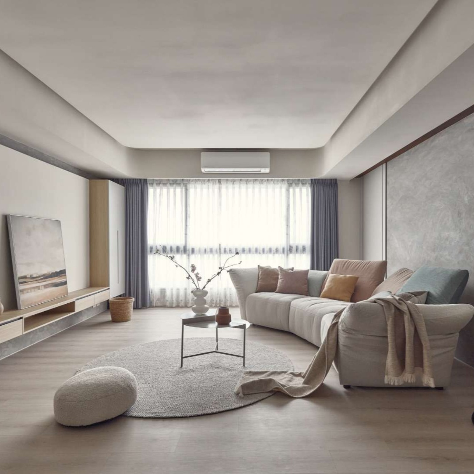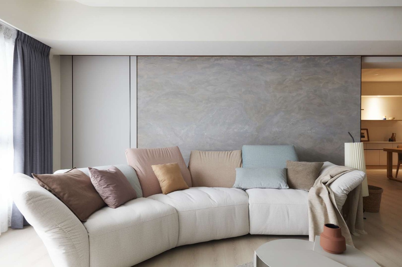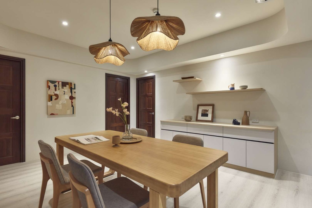 The TV wall’s semi-floating design, aligned with the main beam, enhances both storage and visual continuity. Functional details, such as entryway hooks, reinforce the home’s balance between order and convenience. With deliberate zoning and design, the first impression upon entering is one of calm clarity.