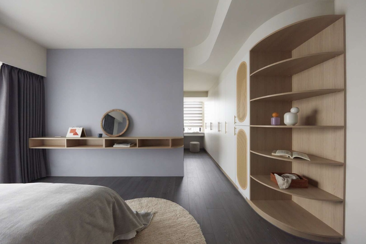 Curved elements unify the composition, extending the living room’s TV wall to the entryway foyer to strengthen storage, while visually softening lines and creating a dialogue with the sofa backdrop. The kitchen integrates display-ready storage cabinets in a sleek black-and-gray palette, contrasted with curved glass that resonates with the living area’s tones. A dedicated storage room augments the functionality of the four-bedroom home. In the master suite, the entrance discreetly avoids a direct line of sight to the bed, while semi-transparent grilles and curved forms ensure both privacy and spatial fluidity.
