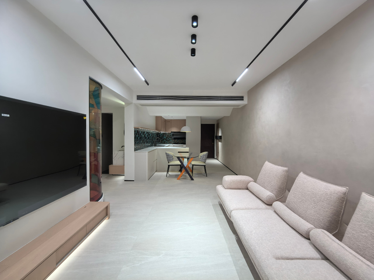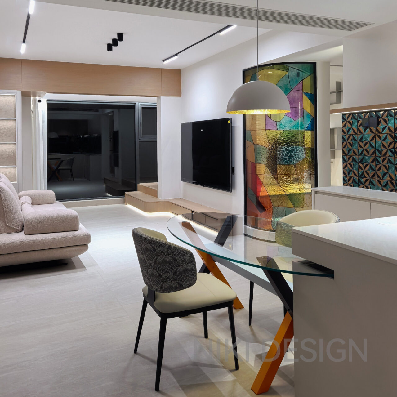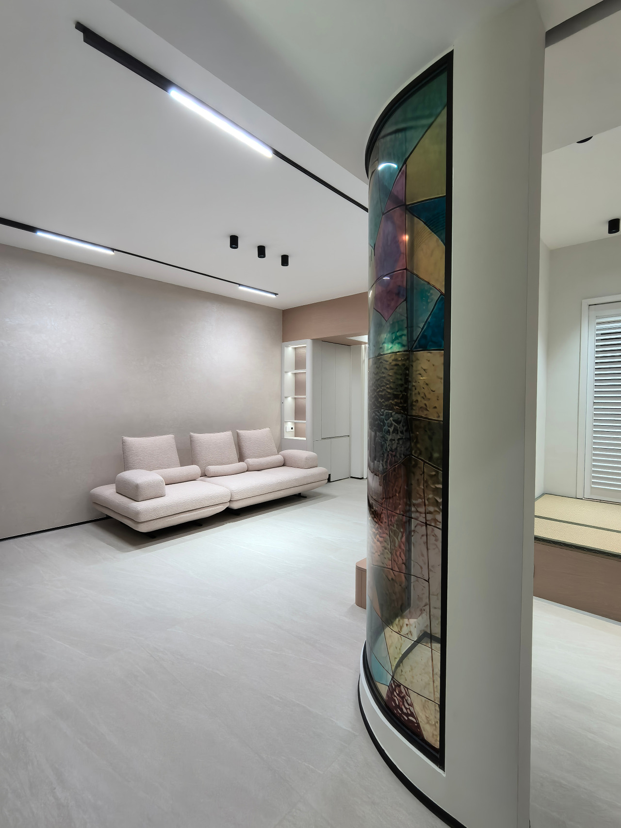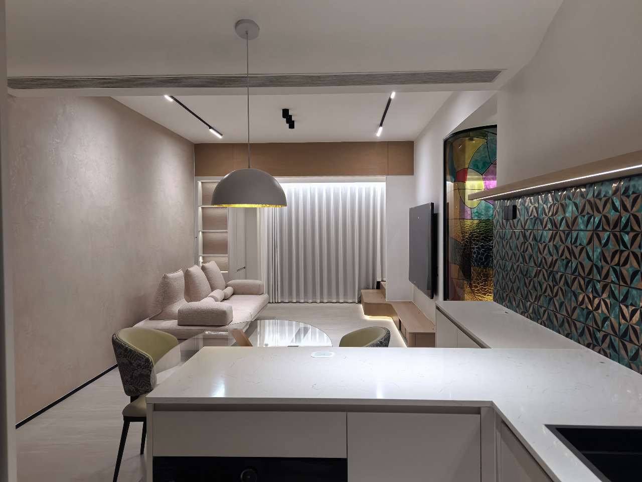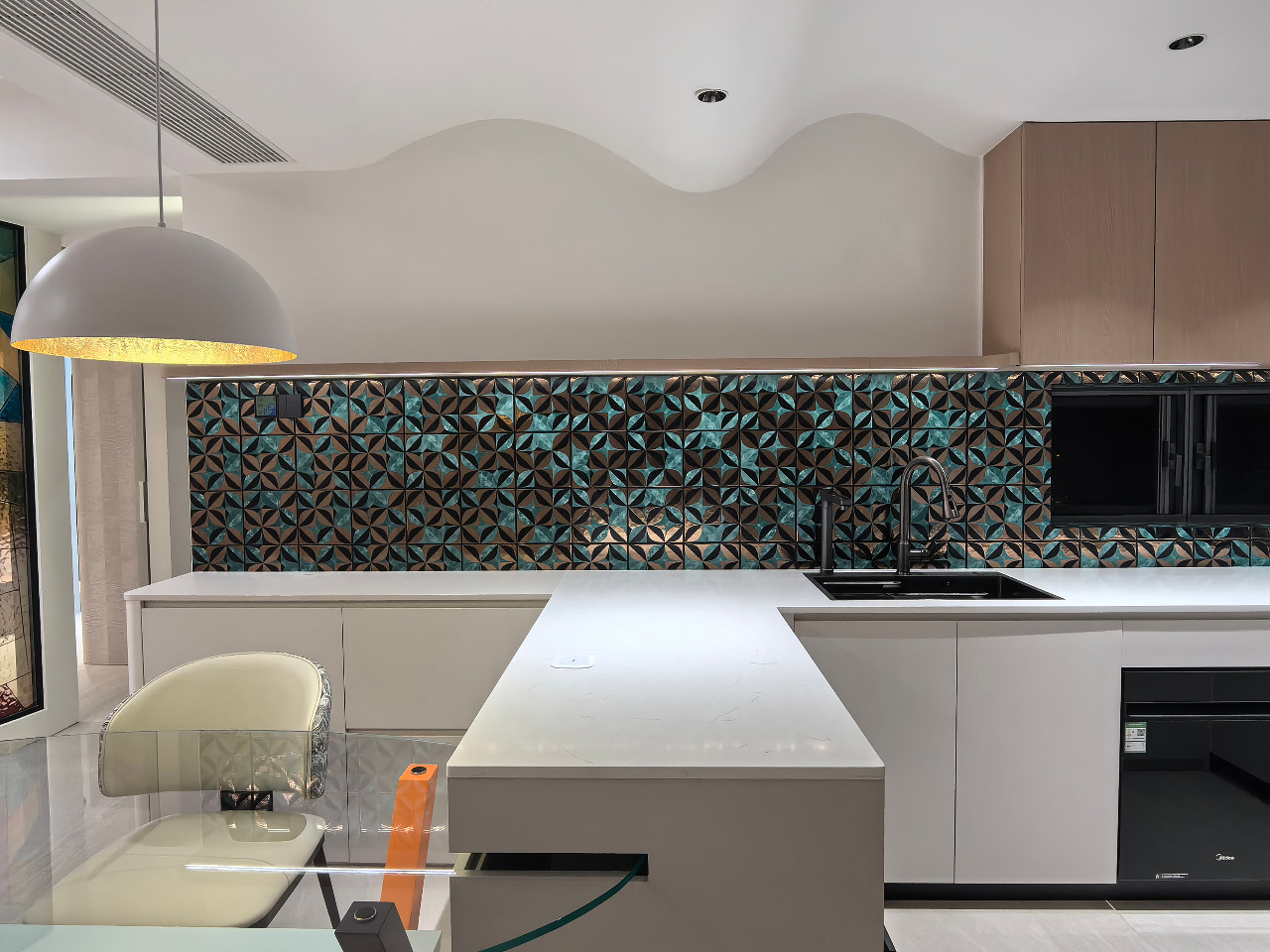 The project defies the surrealistic stereotype of “absurd exaggeration,” instead employing colored curved glass and geometric metal tiles as a new symbolic language. Water-ripple patterned glass, combined with color-blocking techniques, casts fluid patches of light, weaving dreams and reality together. The repetitive rhythm of peacock-green four-leaf tiles creates a subtle tension with the glass’s free-form color blocks. Curved lines soften the room’s angles, outlining a retro-modern aesthetic with a hint of light luxury. A light gray base anchors the space, allowing artistic elements to stand out, while textured chairs and a glass dining table add warmth and comfort. The result is a hazy poetic quality that evokes a “daydream”, transforming the home into an inhabitable surrealistic art installation.