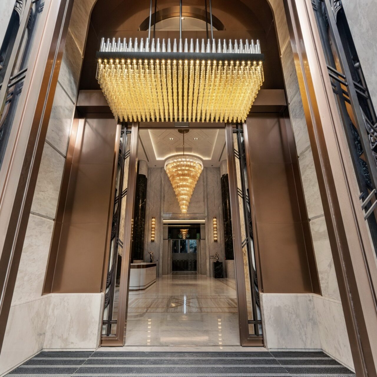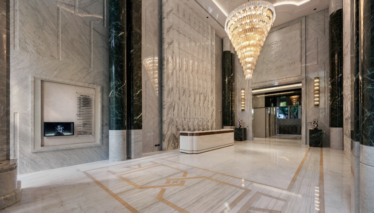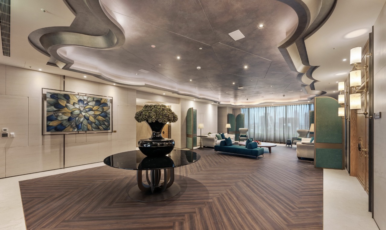 Within the soaring atrium, green natural stone columns stand proud and tall like trunks of a forest, embodying rooted growth and lasting vitality. From the center descends a cascading crystal chandelier, flowing like a luminous waterfall, a wellspring of energy that infuses the heart of the tower with the rhythm of life.