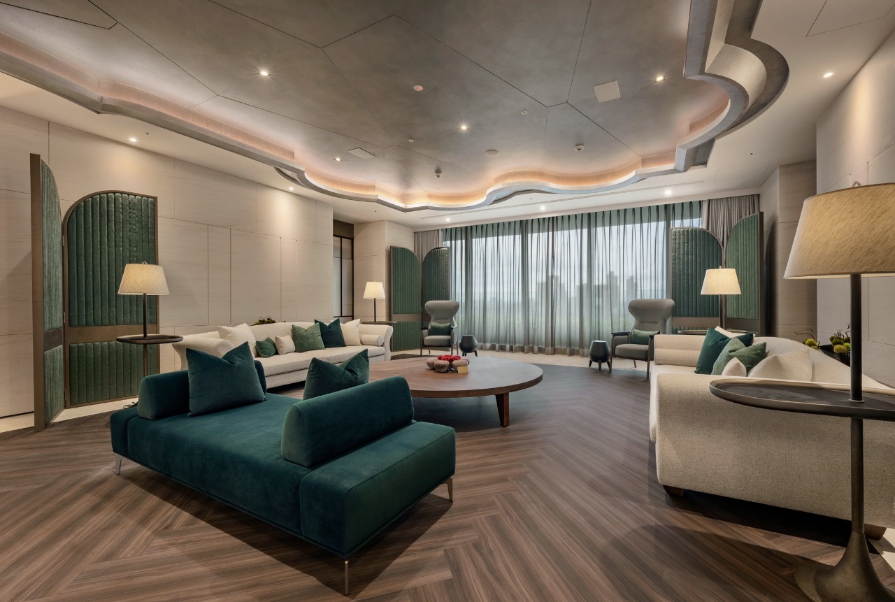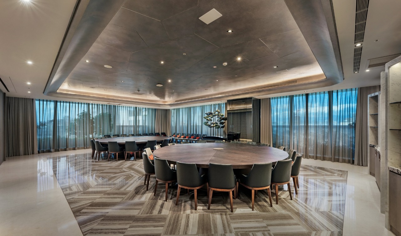 The 13th-floor VIP Club is conceived under the theme “Where Classic and Contemporary Meet in the Bloom of the Golden Rain Tree,” paying tribute to laureate poets while creating a refined and effortless setting for dialogue and connection. The ceiling shimmers like platinum clouds, revealing auspicious patterns within its flowing contours. Round tables celebrate the beauty of Eastern seasonal cuisine. Rhythmic floor patterns dance across the room, enlivening the space with color and contemporary flair.