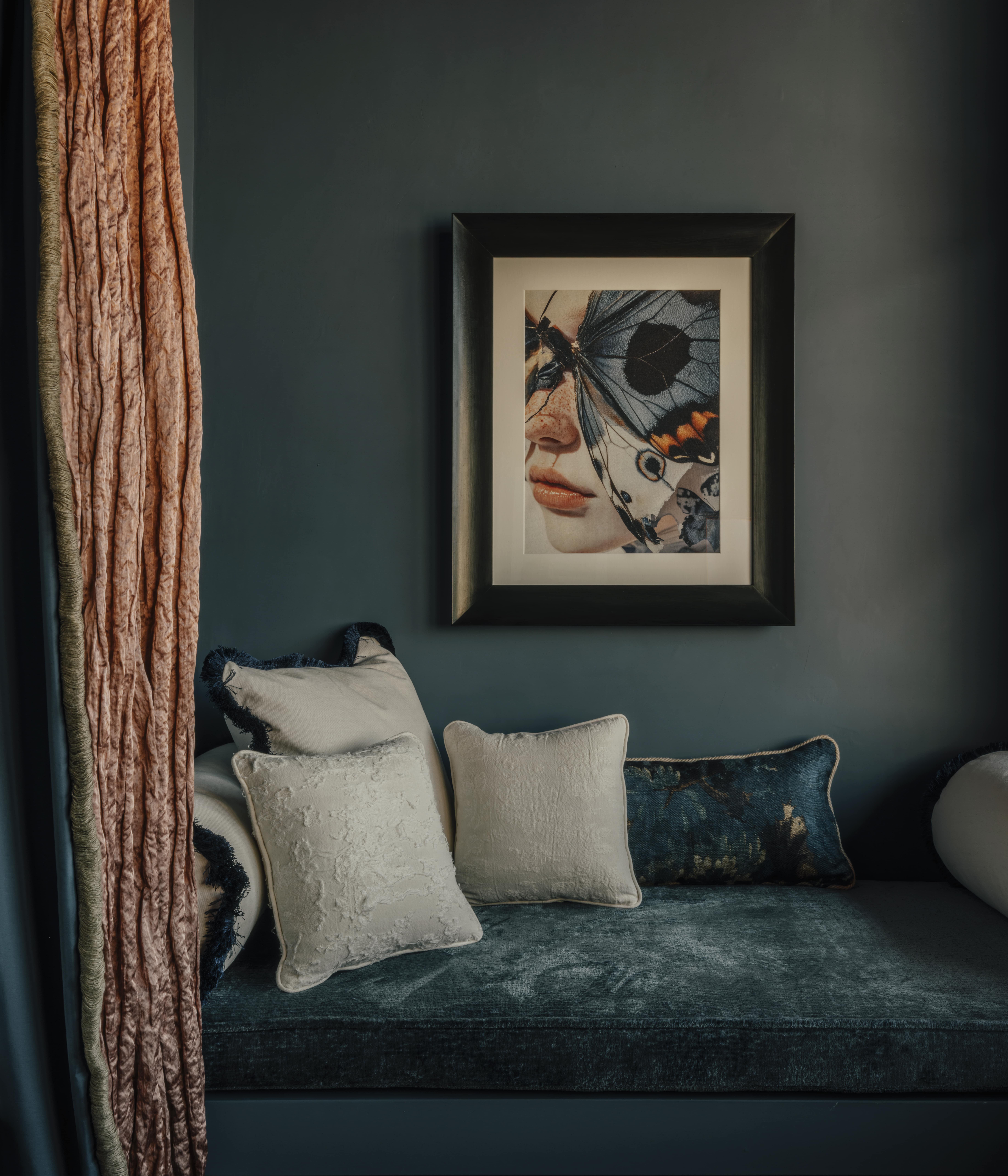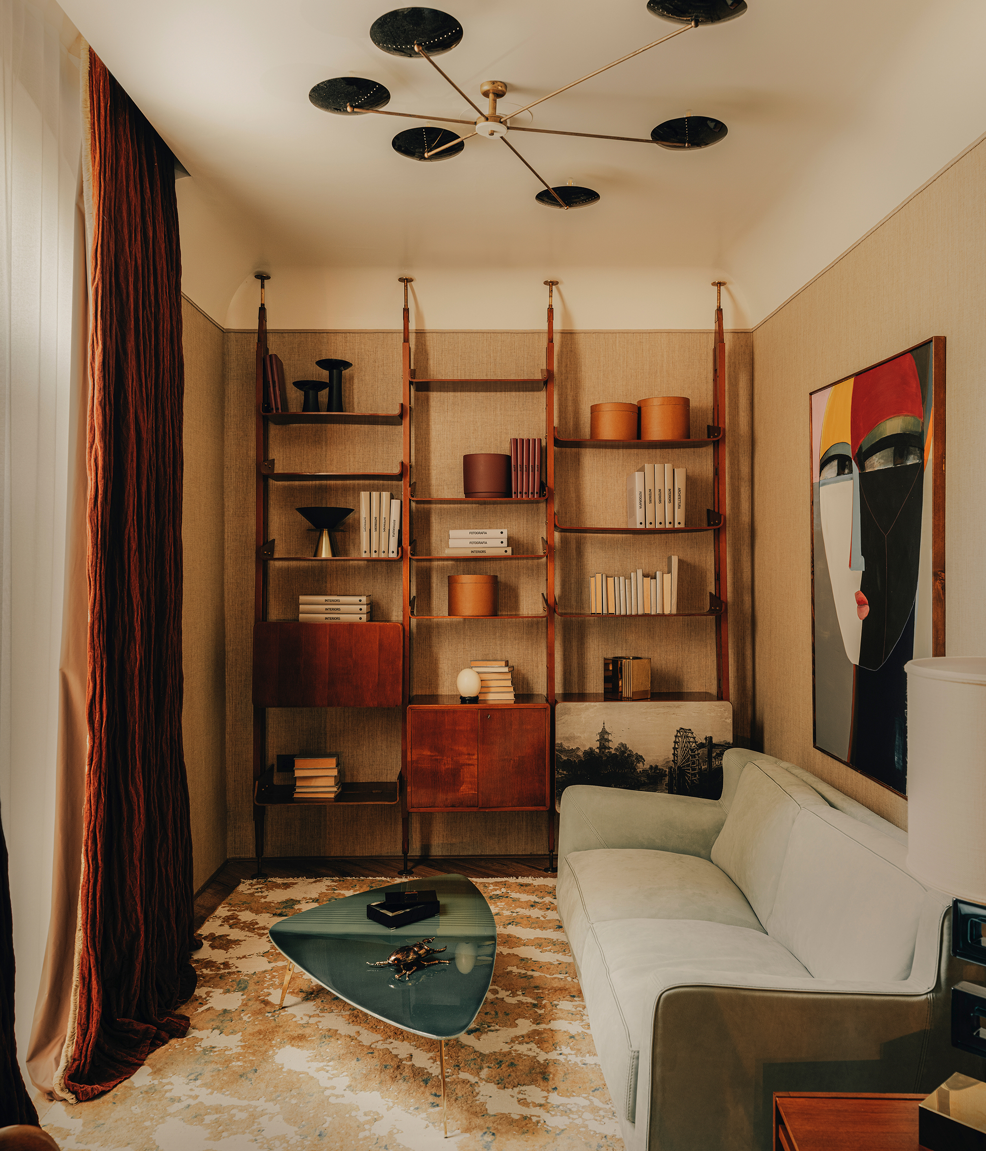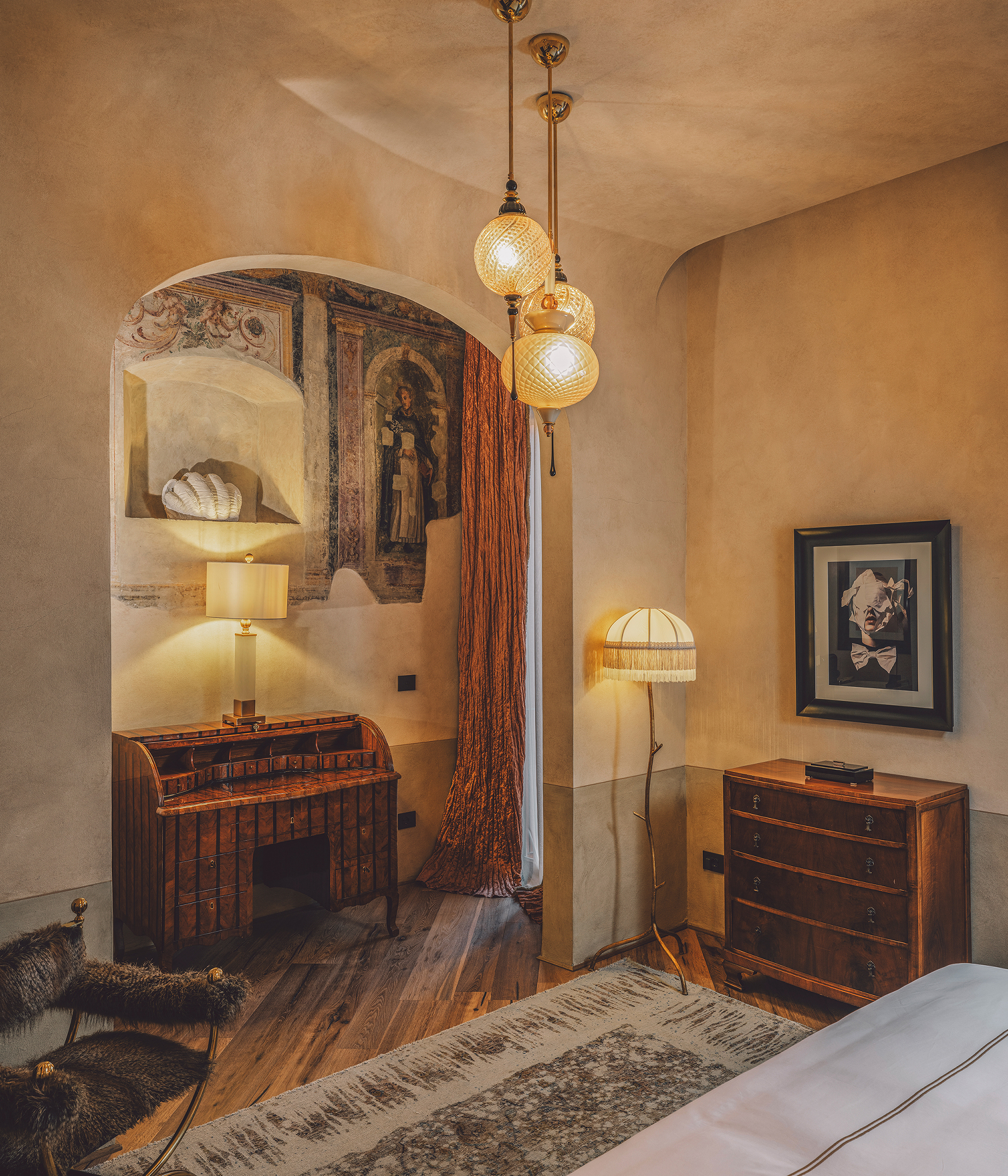 The project’s artistic dimension unfolds through a dialogue between commissioned works, restored frescoes, and one-of-a-kind design pieces, each contributing to the narrative of space. Living areas unfold seamlessly into serene sleeping spaces, while bathrooms gleam like hidden jewels, finished with handcrafted ceramics, brushed metals, and sculptural lighting. Subtle shifts in palette and proportion create a rhythm throughout the building, enhancing its Renaissance bones while introducing a quiet, contemporary elegance. Every surface, detail, and furnishing was individually designed and handmade – from custom joinery and patinated brasswork to woven textiles and marble inlays.