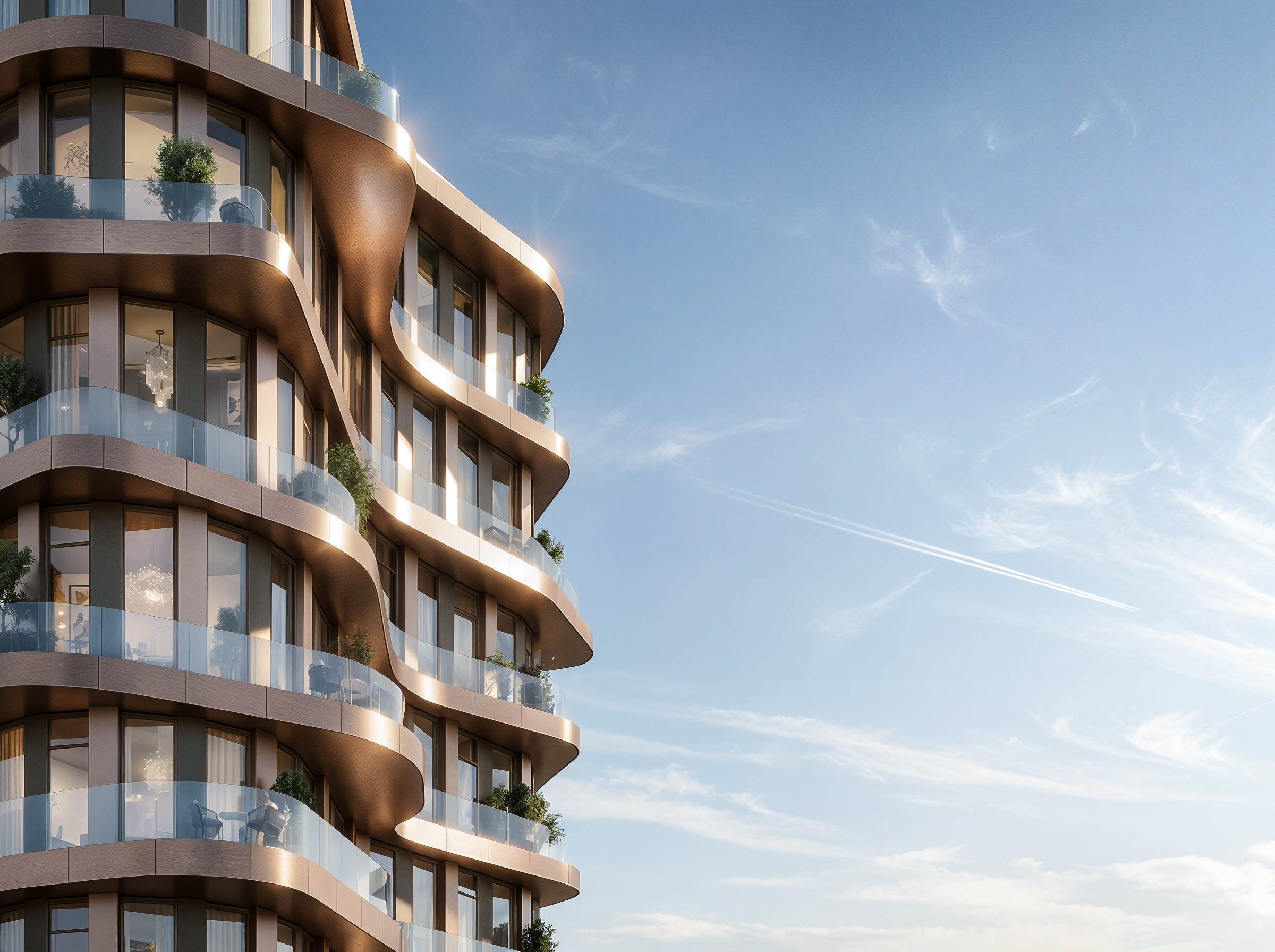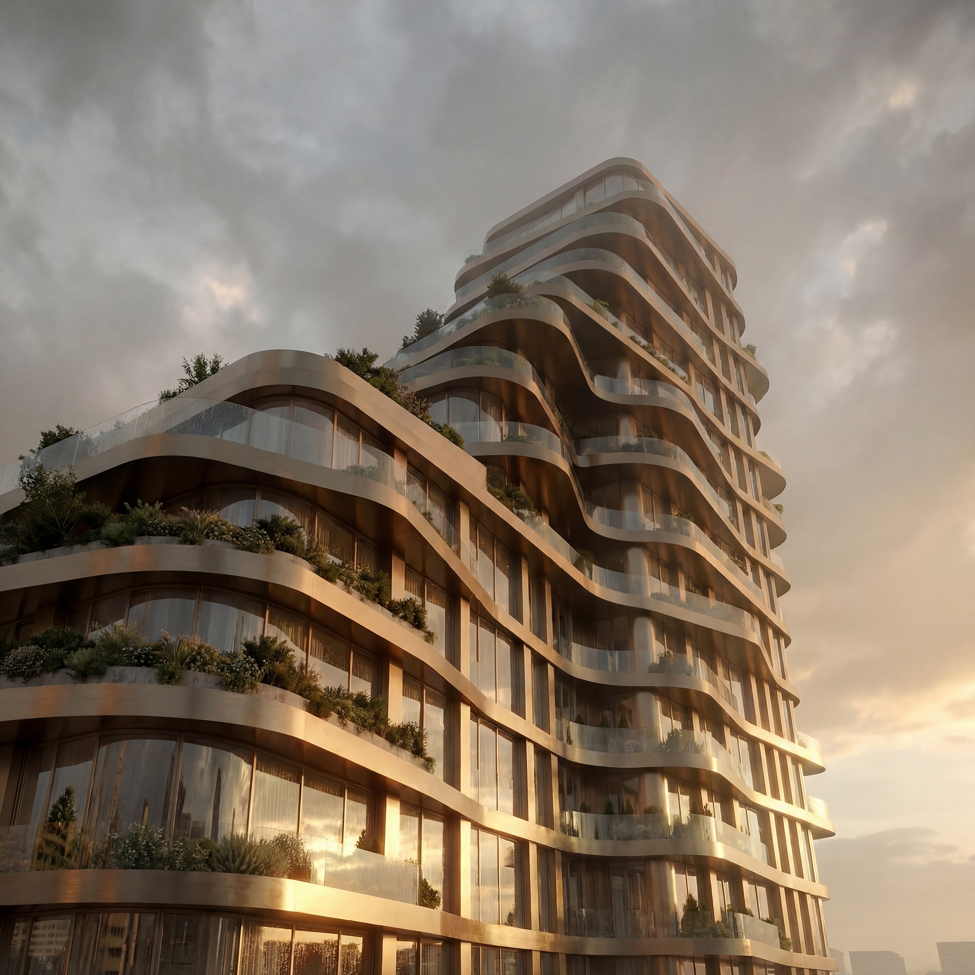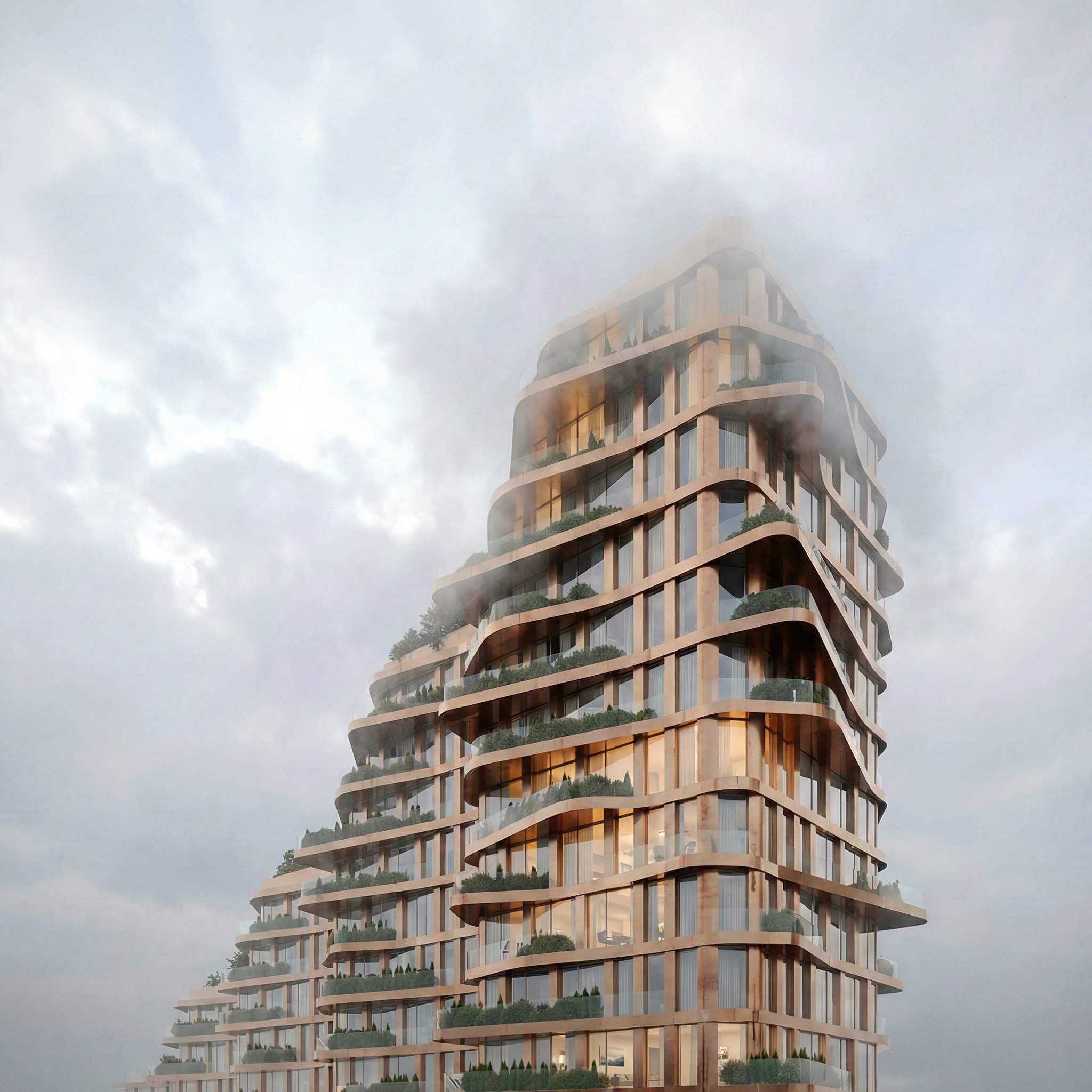 Layered balconies and terraces of varying depths create a perimeter of “eddies,” adding shadow and a lived-in rhythm while expanding outdoor life. The façade balances large-format glazing with denser ribbon-like spandrel bands. It reinforces continuity and the effect of light sliding across the surface.