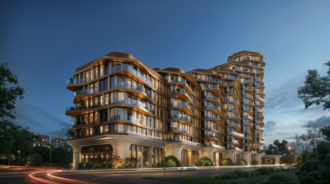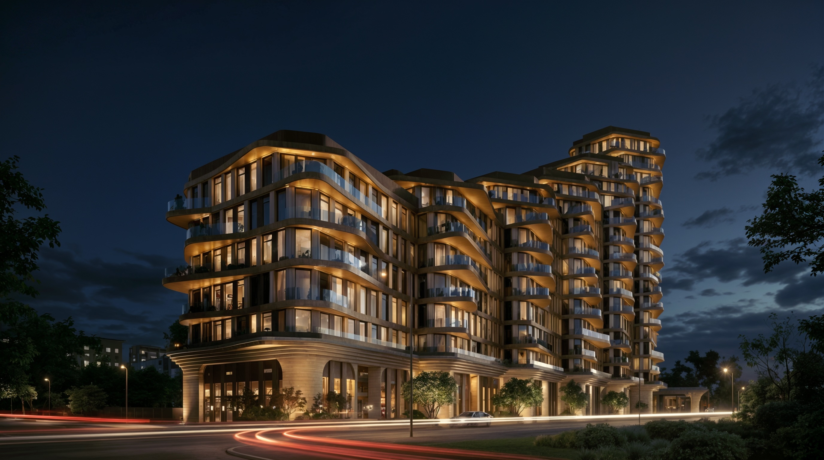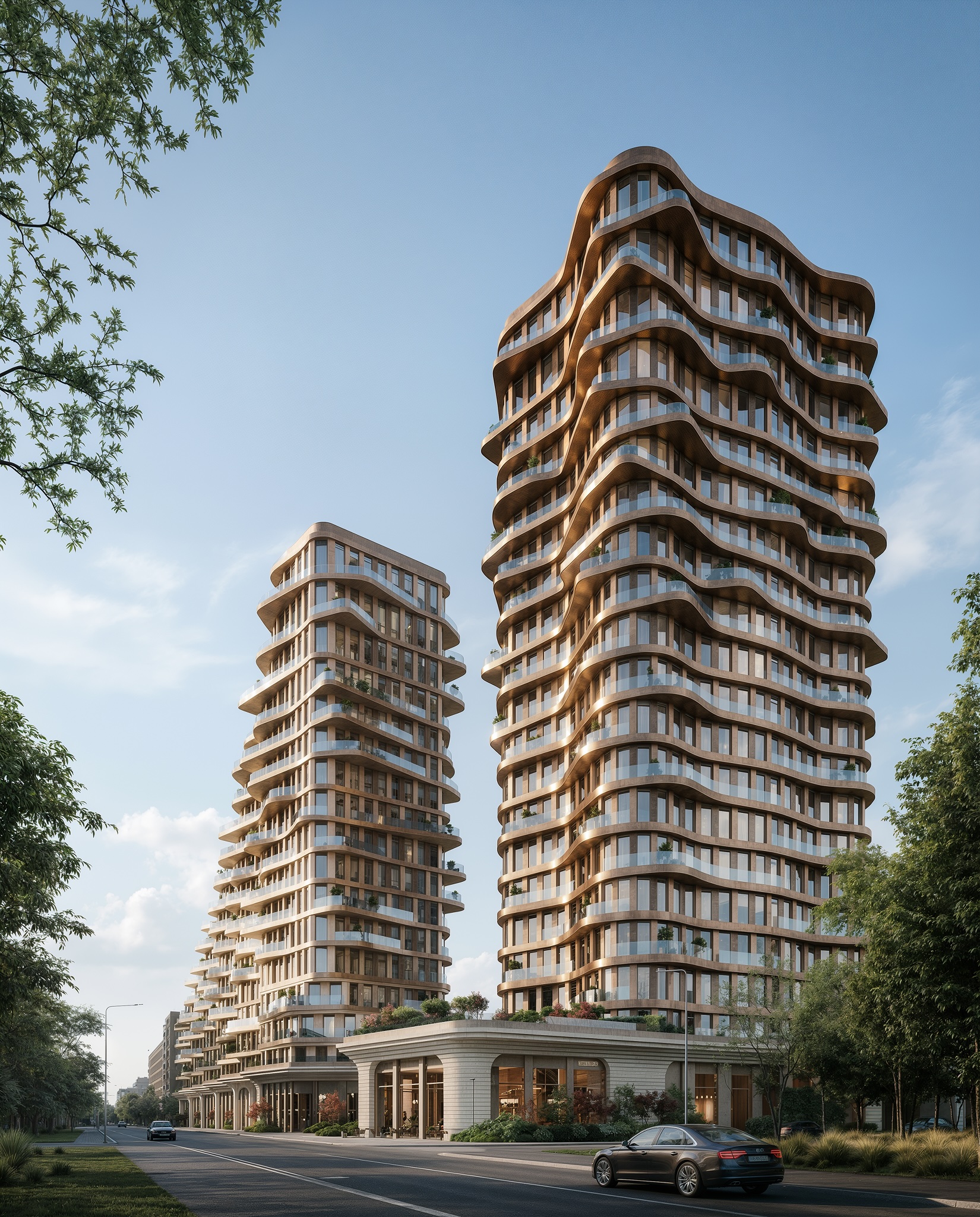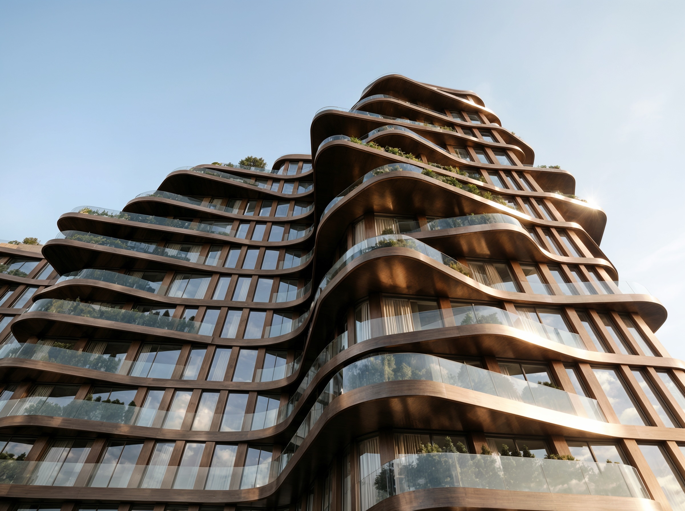 Layered balconies and terraces of varying depths create a perimeter of “eddies,” adding shadow and a lived-in rhythm while expanding outdoor life. The façade balances large-format glazing with denser ribbon-like spandrel bands. It reinforces continuity and the effect of light sliding across the surface.