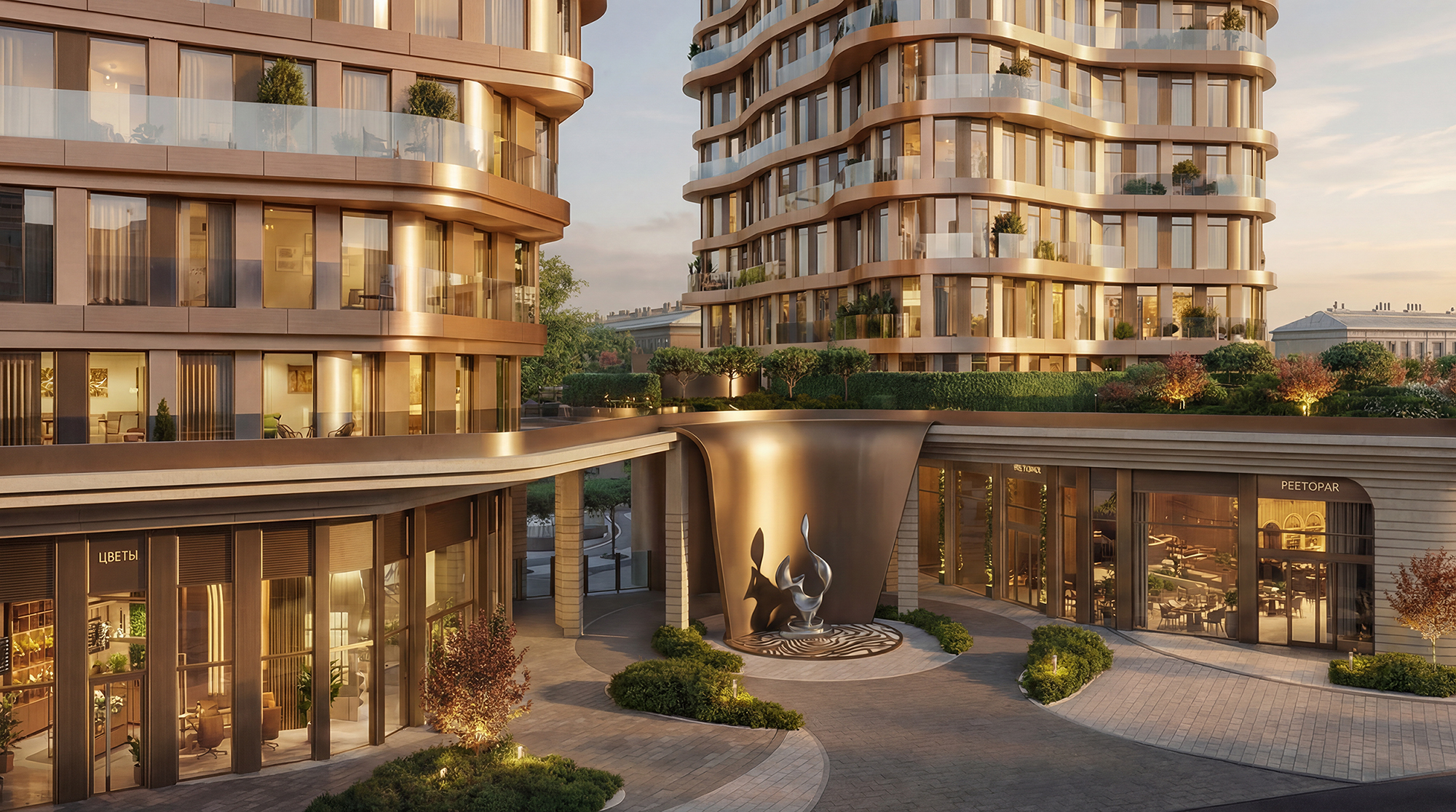 The Muse Residences is a premium residential ensemble proposed for Moscow’s Aeroport district. It is shaped as a contemporary, sculptural response to the area’s cultural memory, particularly the “artists’ town” around Verkhnyaya Maslovka street, where studios and everyday life have long shared the same address.