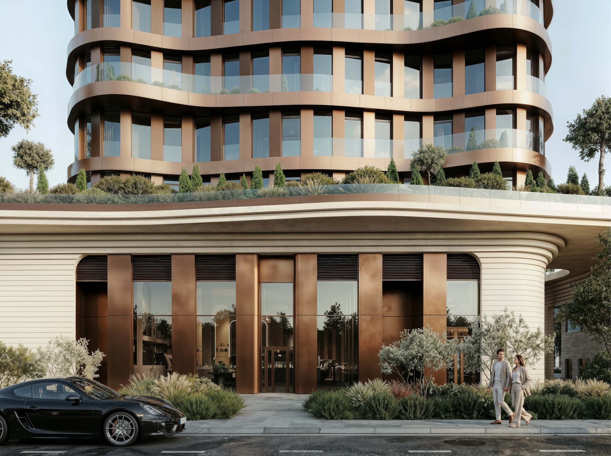 At street level, a robust, rusticated base with generous shopfront glazing and clear entrances extends the public realm, while the residential floors above remain calm and private. The material palette combines fibre-reinforced concrete panels with metal cladding to bridge tactile solidity and reflective lightness.