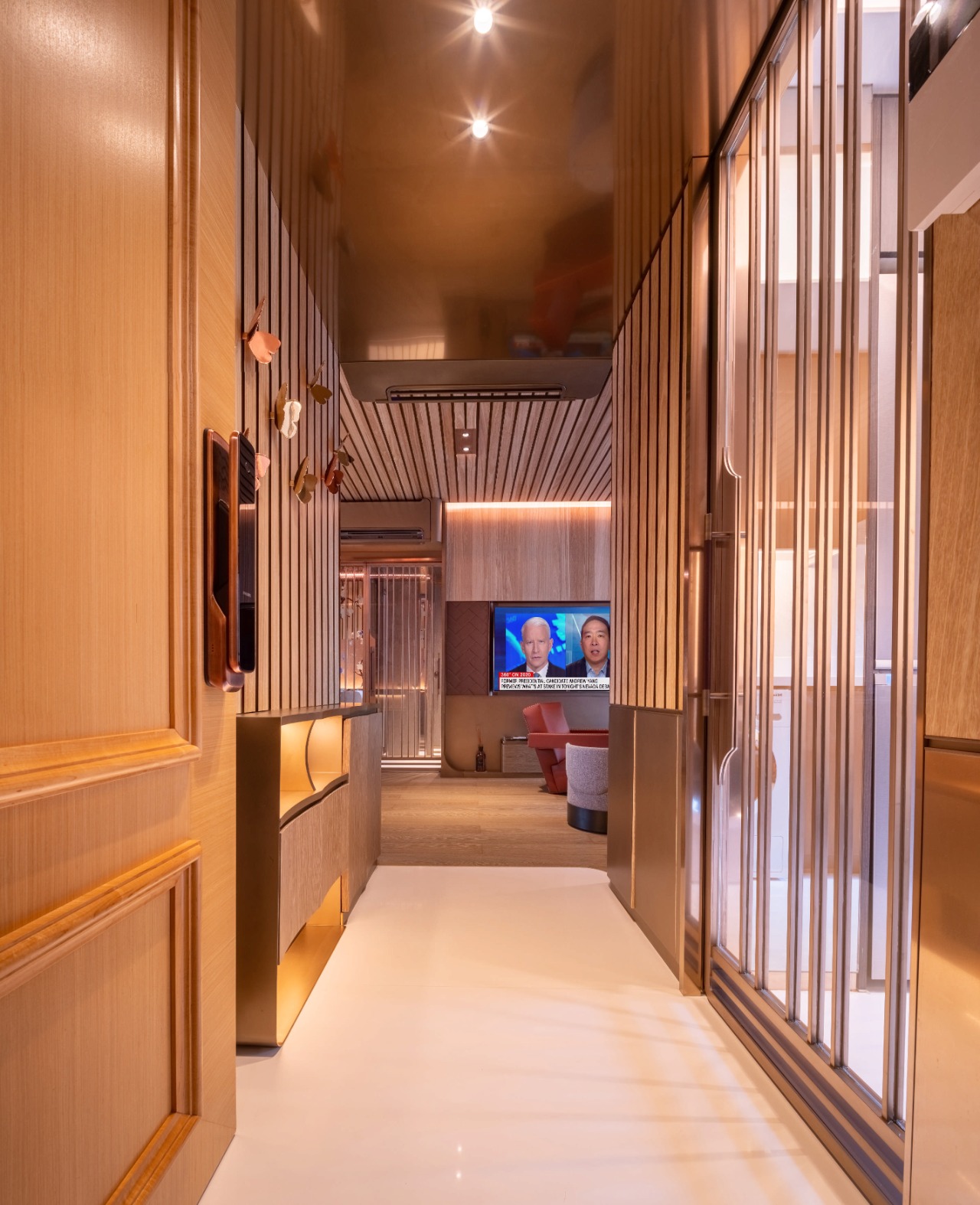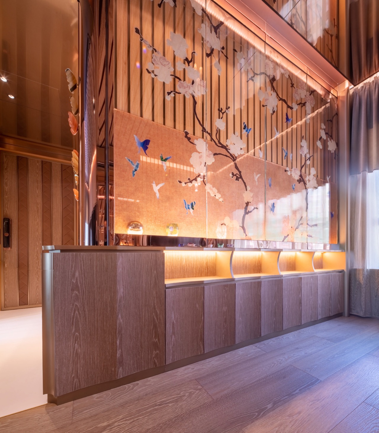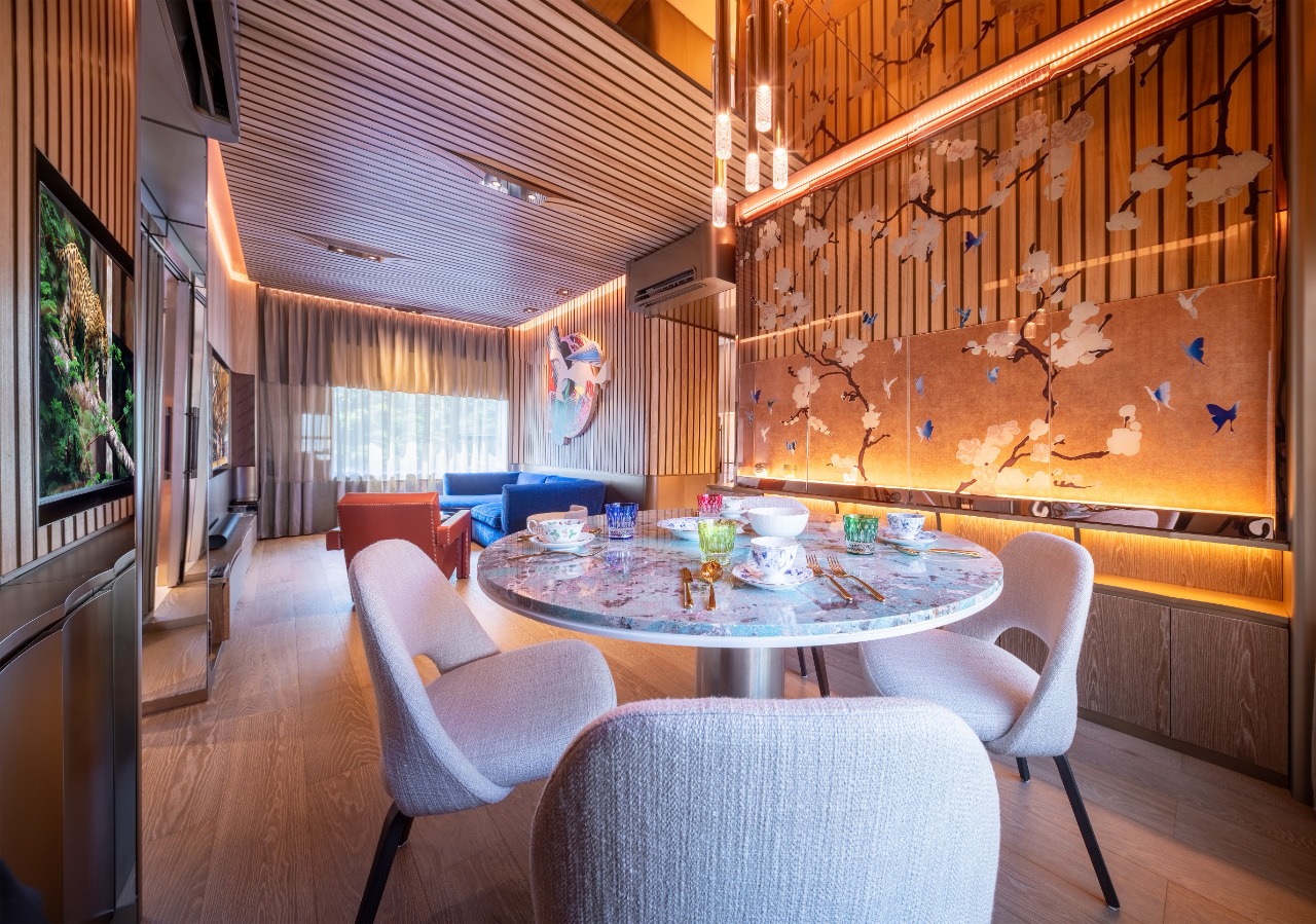 More colours with tactile sensations are provided by Italian Modern Furniture Icons like Cassina and Henge of Milan, with tailor-made coffee and dining tables inspired by ClassiCon and Tom Dixon respectively. As for materials of fixed furniture and others, nickel silver shimmers against amazon green marble and natural timber from Schotten & Hansen. Chandeliers at dining are created by Preciosa. Golden Butterfly coat hangers by Ghidini 1961 of Italy with lighting design and products are by Artemide.