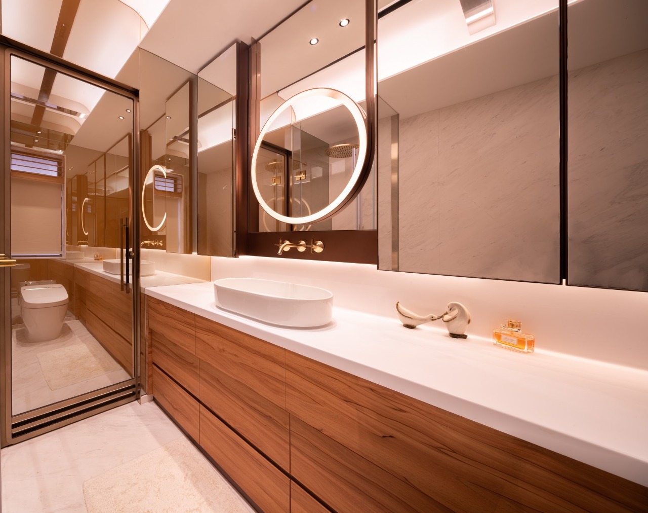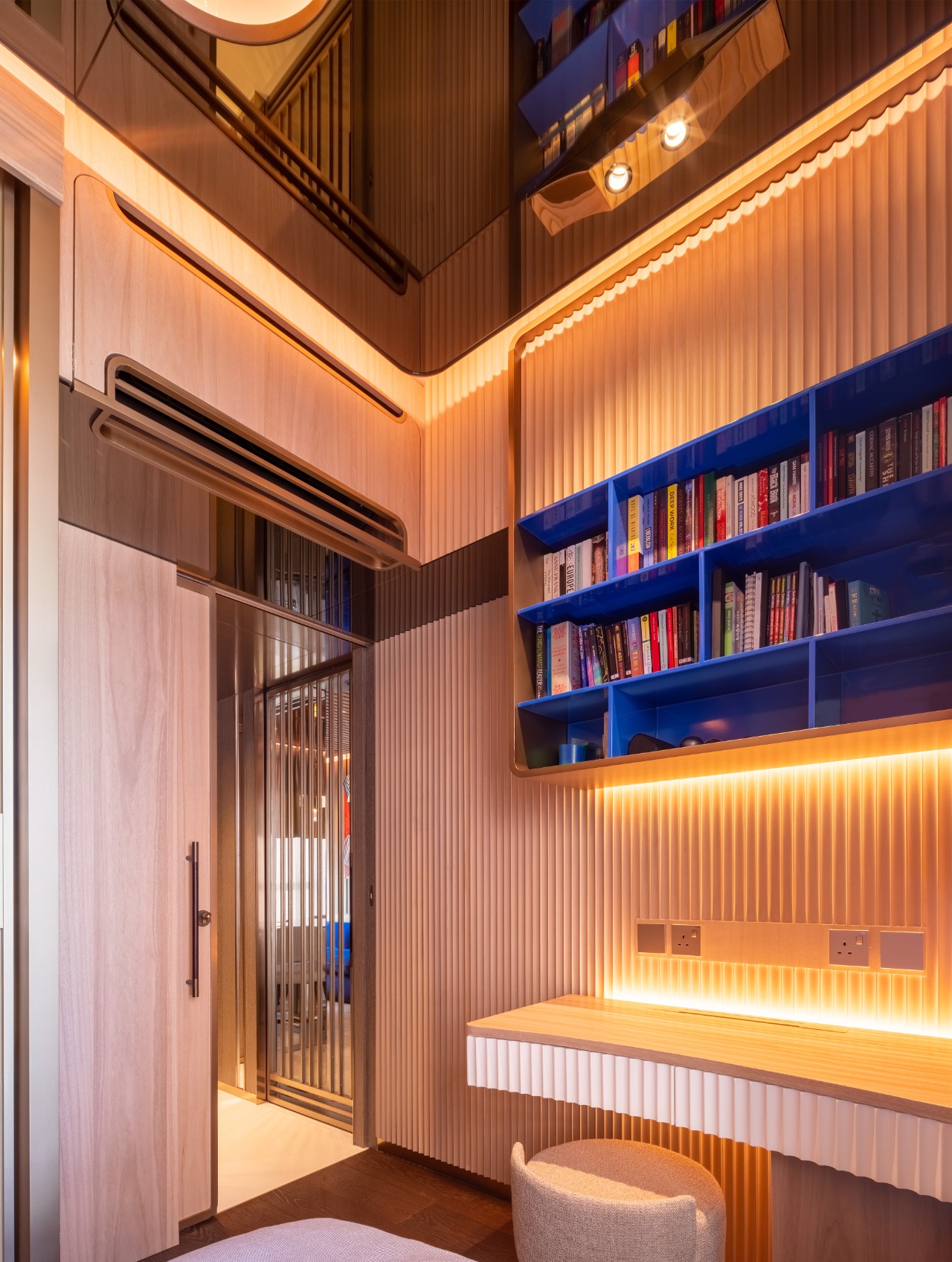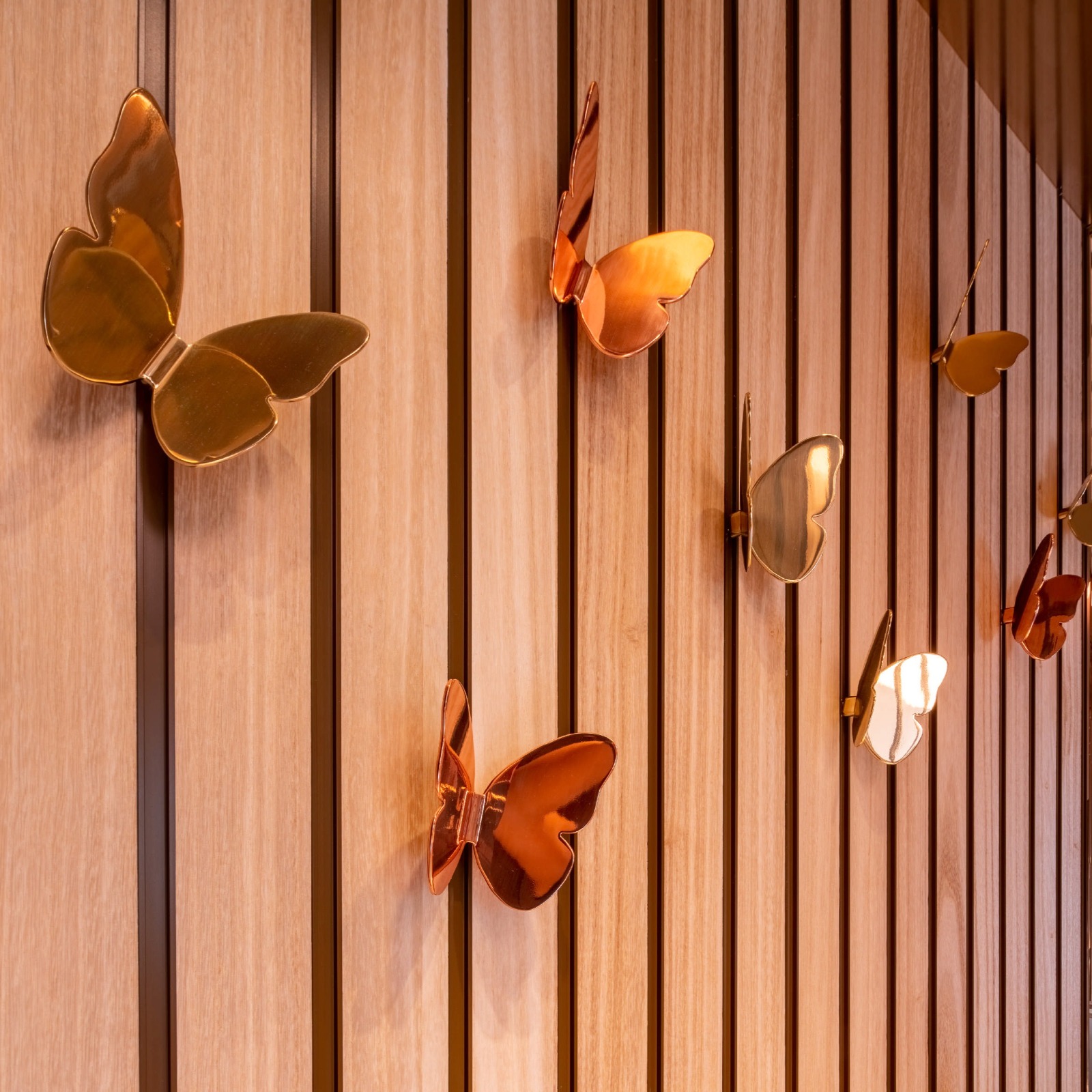 More colours with tactile sensations are provided by Italian Modern Furniture Icons like Cassina and Henge of Milan, with tailor-made coffee and dining tables inspired by ClassiCon and Tom Dixon respectively. As for materials of fixed furniture and others, nickel silver shimmers against amazon green marble and natural timber from Schotten & Hansen. Chandeliers at dining are created by Preciosa. Golden Butterfly coat hangers by Ghidini 1961 of Italy with lighting design and products are by Artemide.