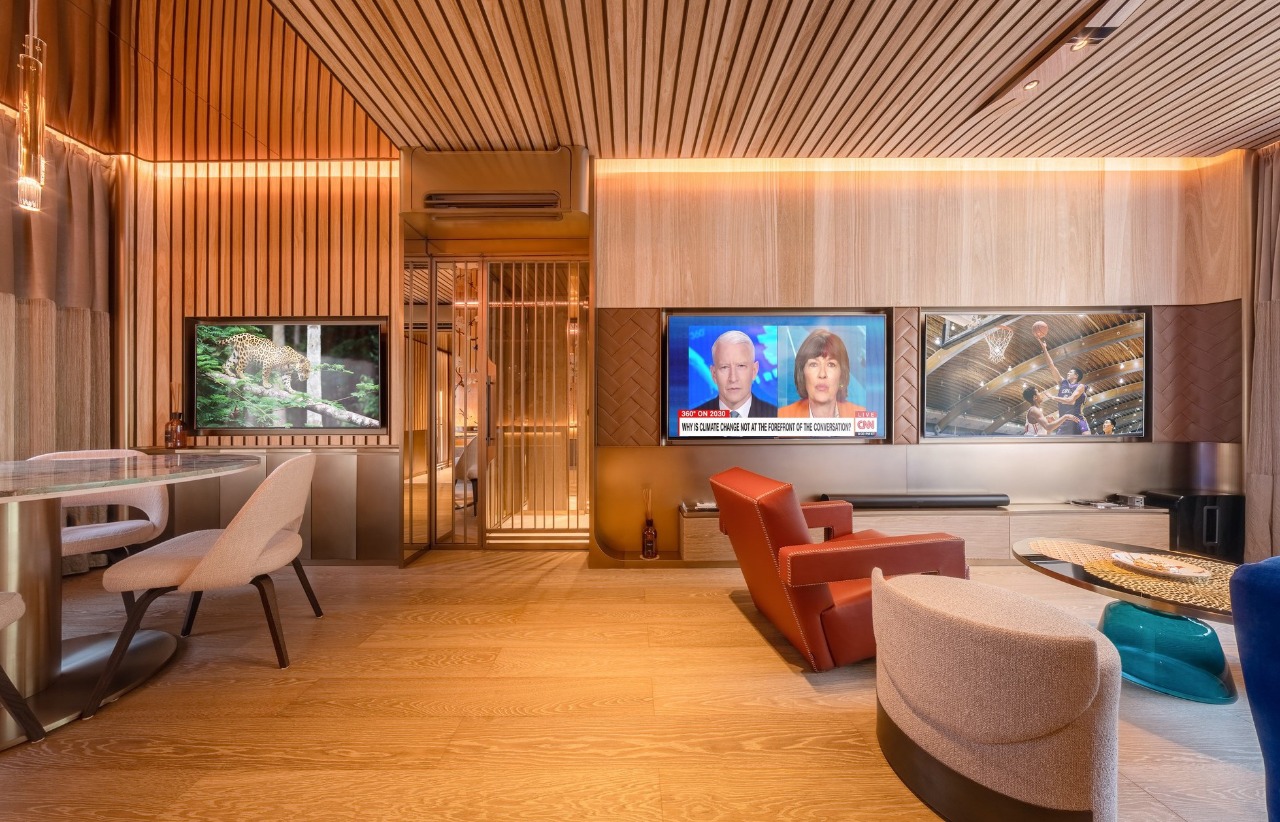 Yet, The Natura is far from living off the grid. It is totally connected to information and technology with no less than 3 LED TV displays boldly placed on the TV Ribbon Wall. The Screen is the interface between our realities (or soon to be Metaverse), so communications at any instant is of paramount significance.