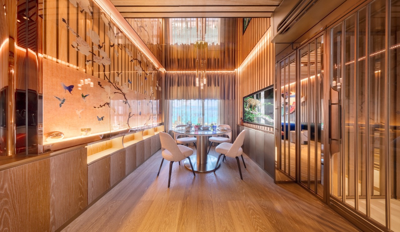 One of the principle inspirations is derived from Alvar Aalto’s Villa Mairea in Finland. Its unique ambience established by the wood grain timber walls, flooring and ceiling evokes a modern Scandinavian aesthetic that is calmly soothing and almost timeless. One is drawn more to living in the moment and less obsessed with material things, allowing us to initiate a closer connection with one’s body mind and soul, and also to better understand the spiritual side of our very own existence. Whether reading a novel whilst overlooking a deep green hill at one of the bay windows, or sipping a cup of chamomile tea under the chandeliers of crystal and gold at dining right next to a glass display called the “Crystal Garden”, these are the moments to appreciate the simple pleasures of life which are priceless.