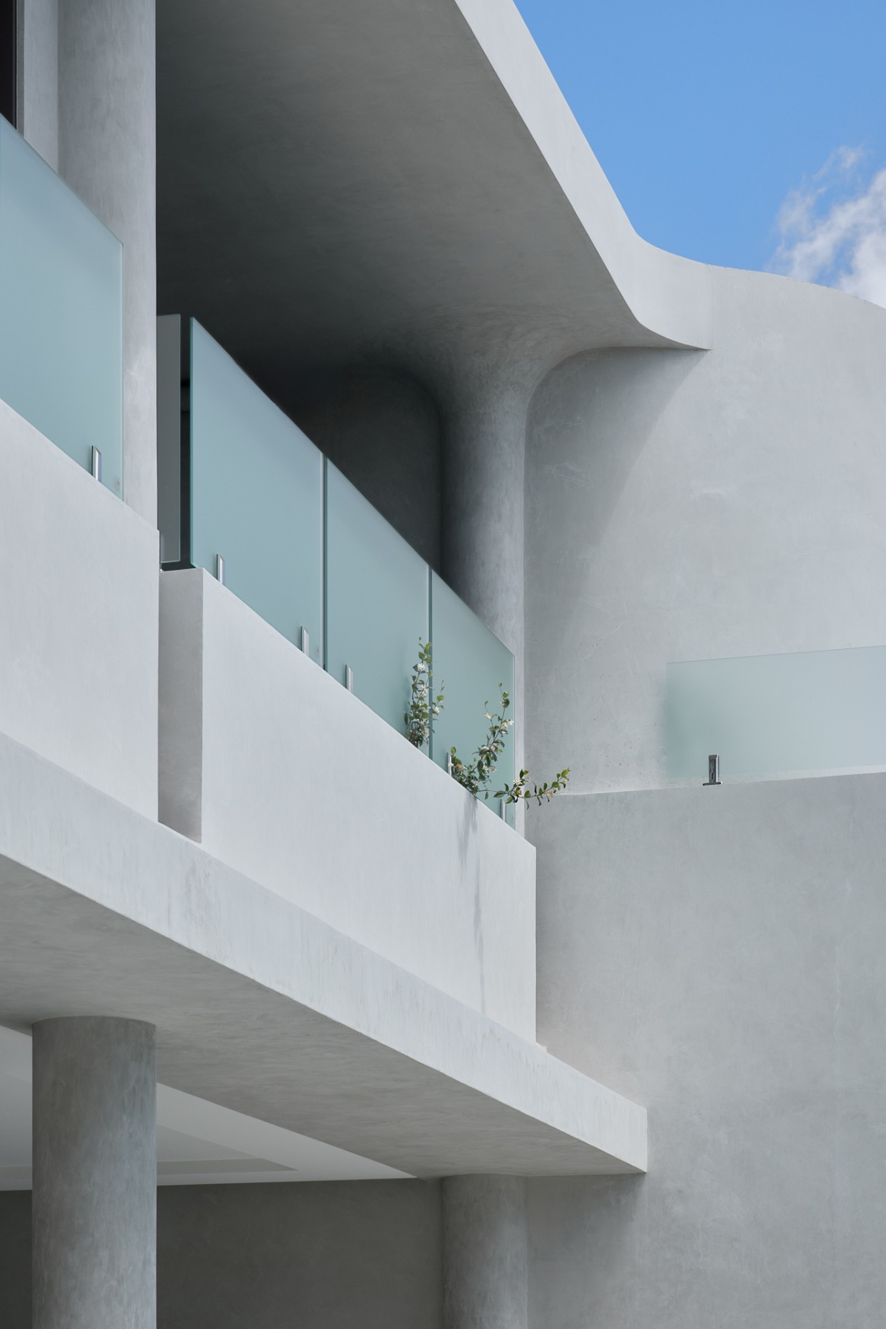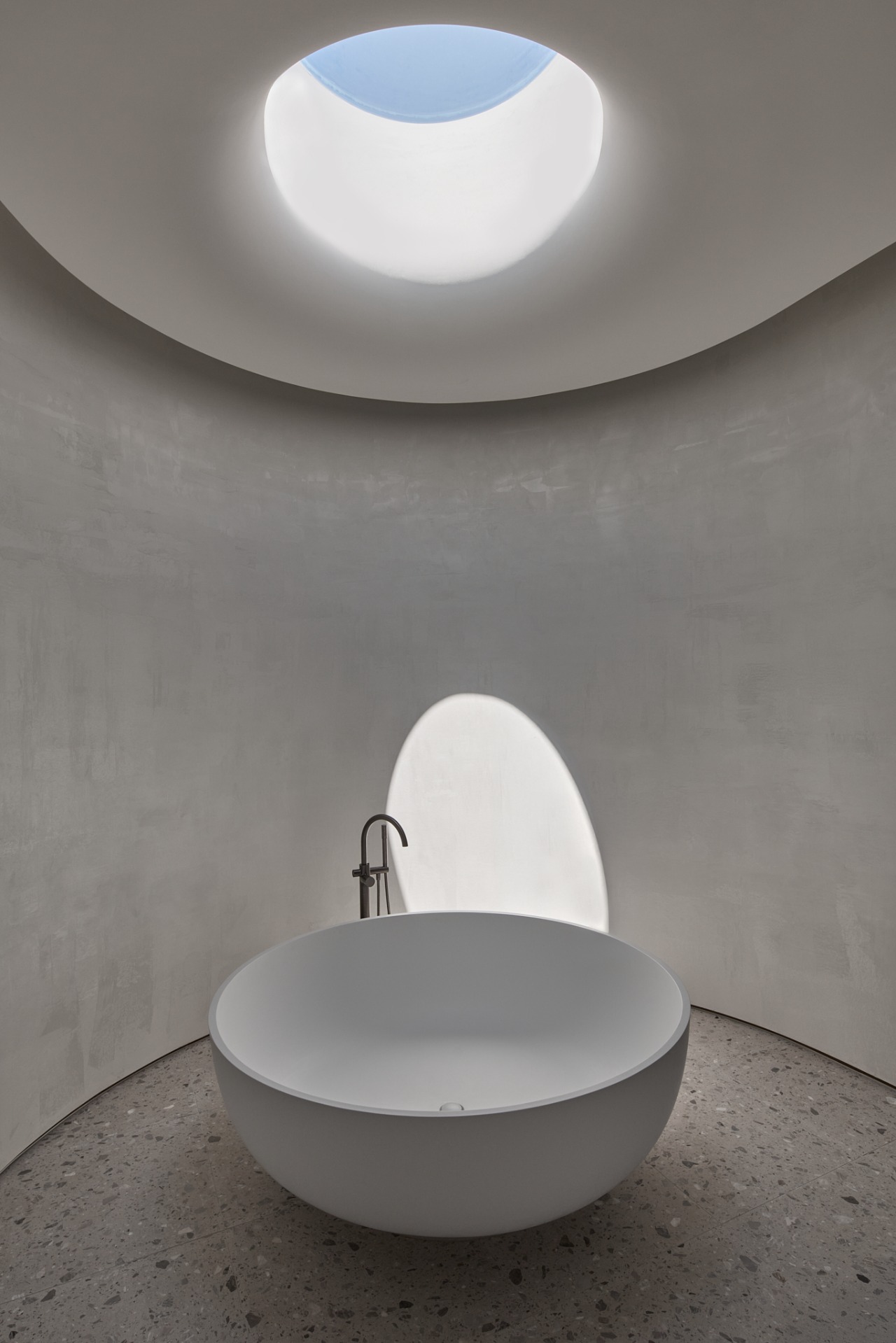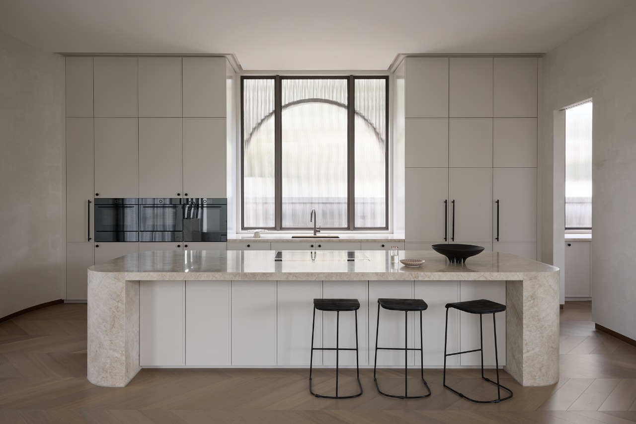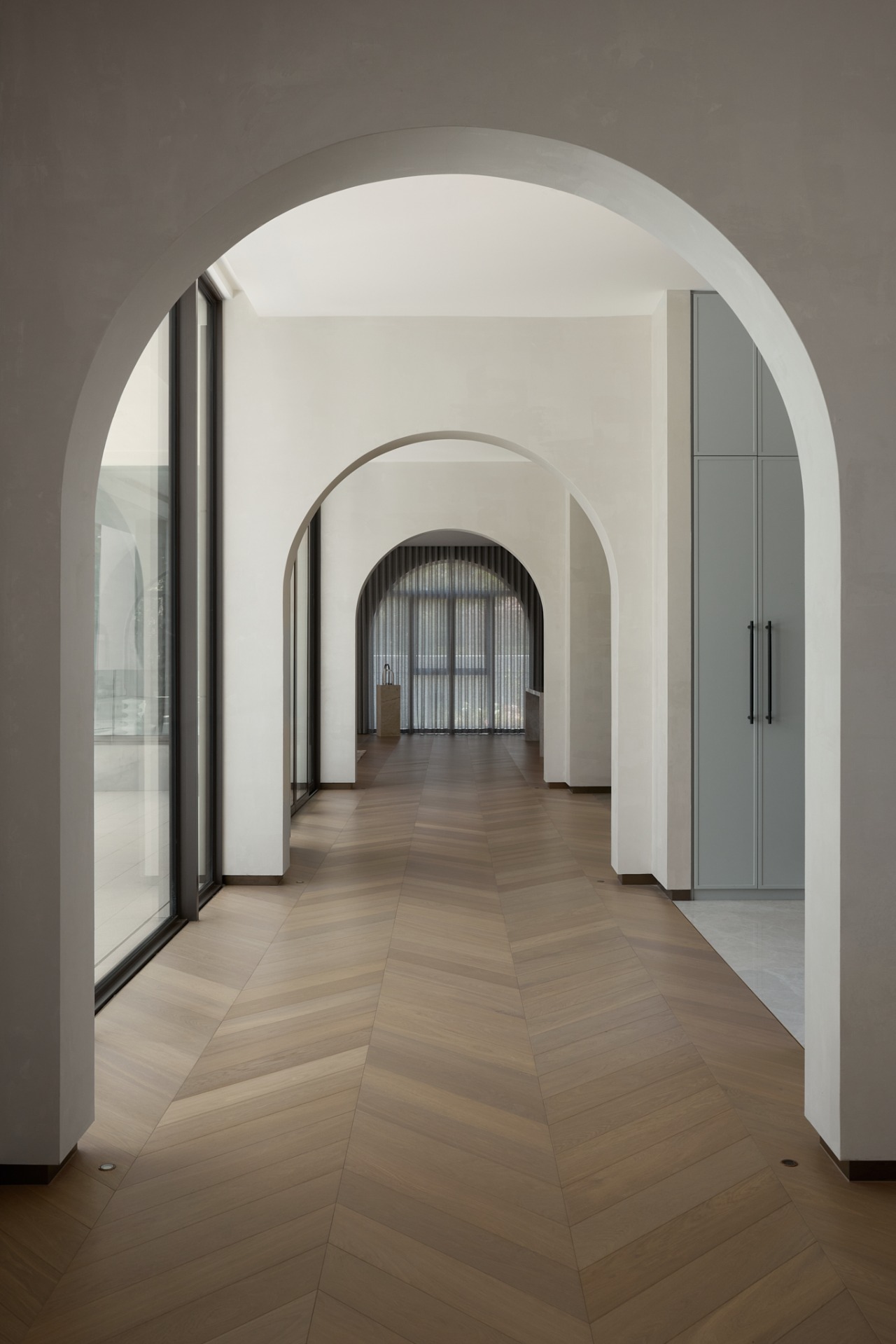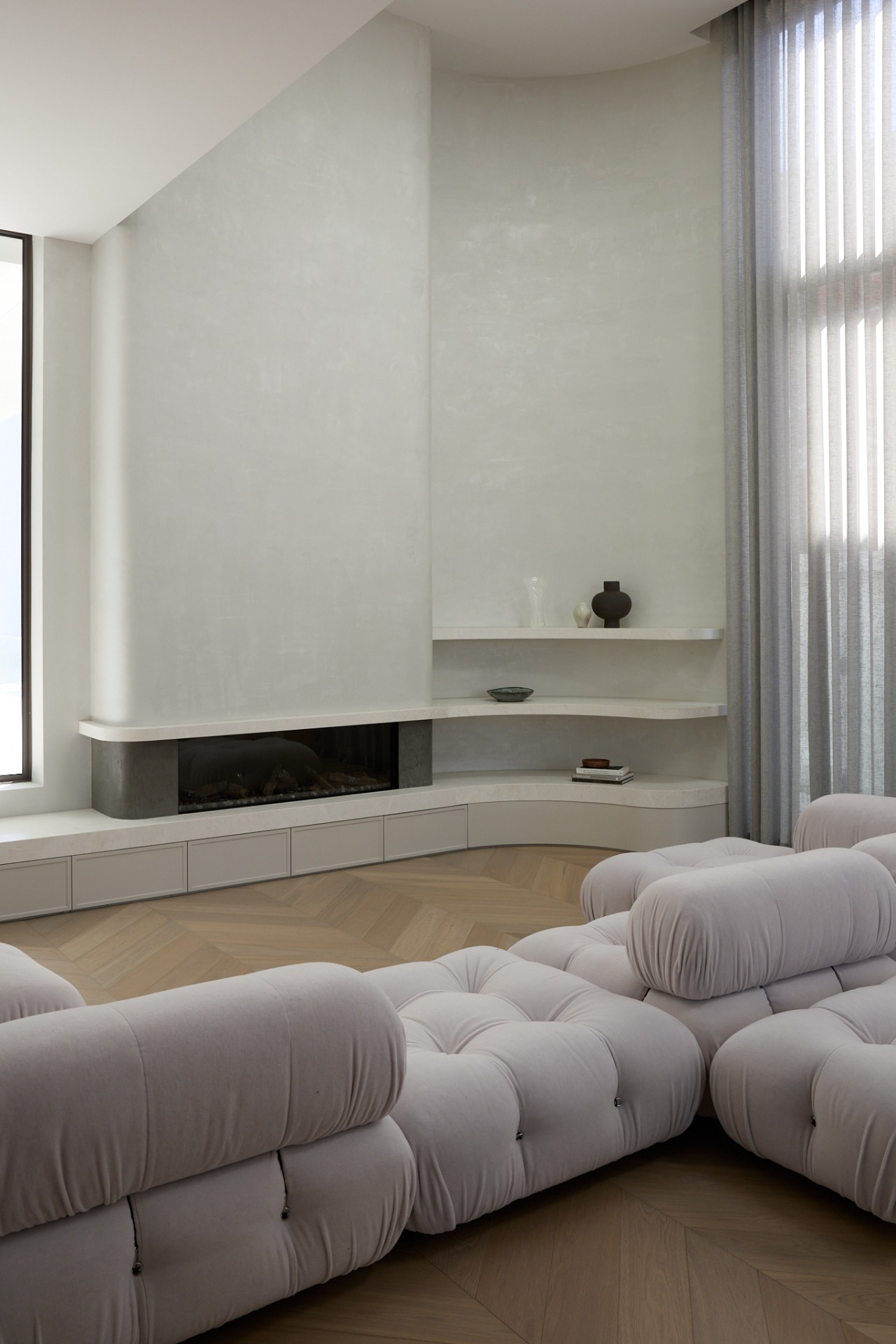 Curved forms organize movement through the plan, shaping spatial flow with a gentle continuity. Chevron timber floors, textured finishes, and fine joinery respond to the movement of daylight, allowing shadow, reflection, and weather to become part of the interior atmosphere. The house breathes outward, shaped by sun and the passing of the day.