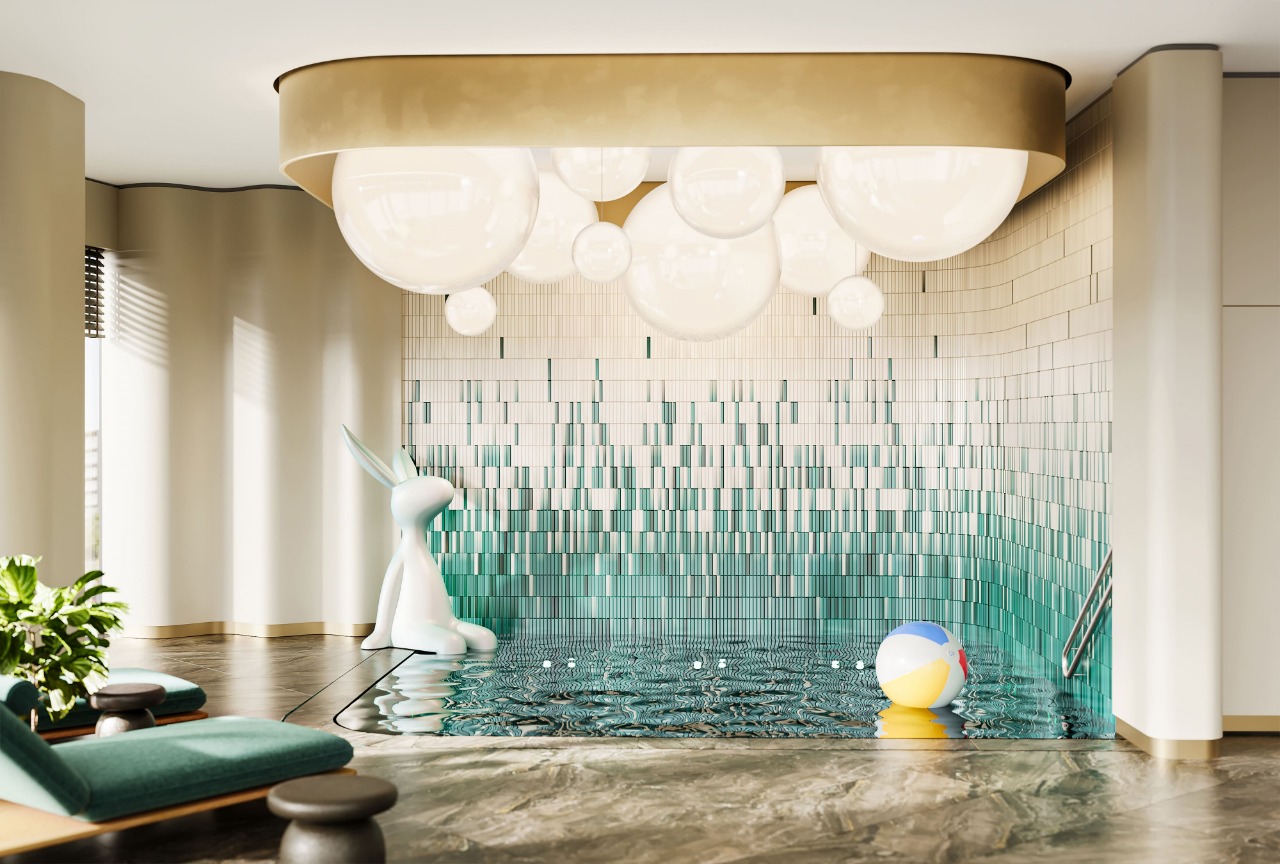 The Clubhouse features sports infrastructure created in accordance with the signature Fit Lab standard, intended exclusively for residents. The fitness area at Tishinskiy bulvar includes a 25-meter swimming pool with three lanes. The swimming space is filled with light streaming through stained-glass windows. One of the walls is decorated with a large-scale art piece in the form of a leaf made from exotic zebrano tree imported from Africa. In the children’s pool area, spherical light fixtures echo the lighting elements in the children’s room. There are also loungers and a rabbit-shaped art object.