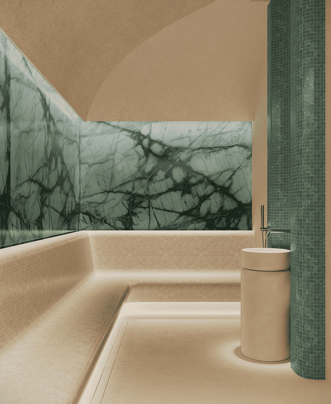 The spa area includes a sauna, a hot tub, and a hammam designed in turquoise shades and finished with marble and mosaic. The spacious gym is divided into zones for cardio, strength, and functional training. For residents’ comfort, there are showers, men’s, women’s, and family changing rooms. The spa area at Tishinskiy bulvar also includes a massage room with a stationary table, shower, and restroom. Residents may invite their own master here.