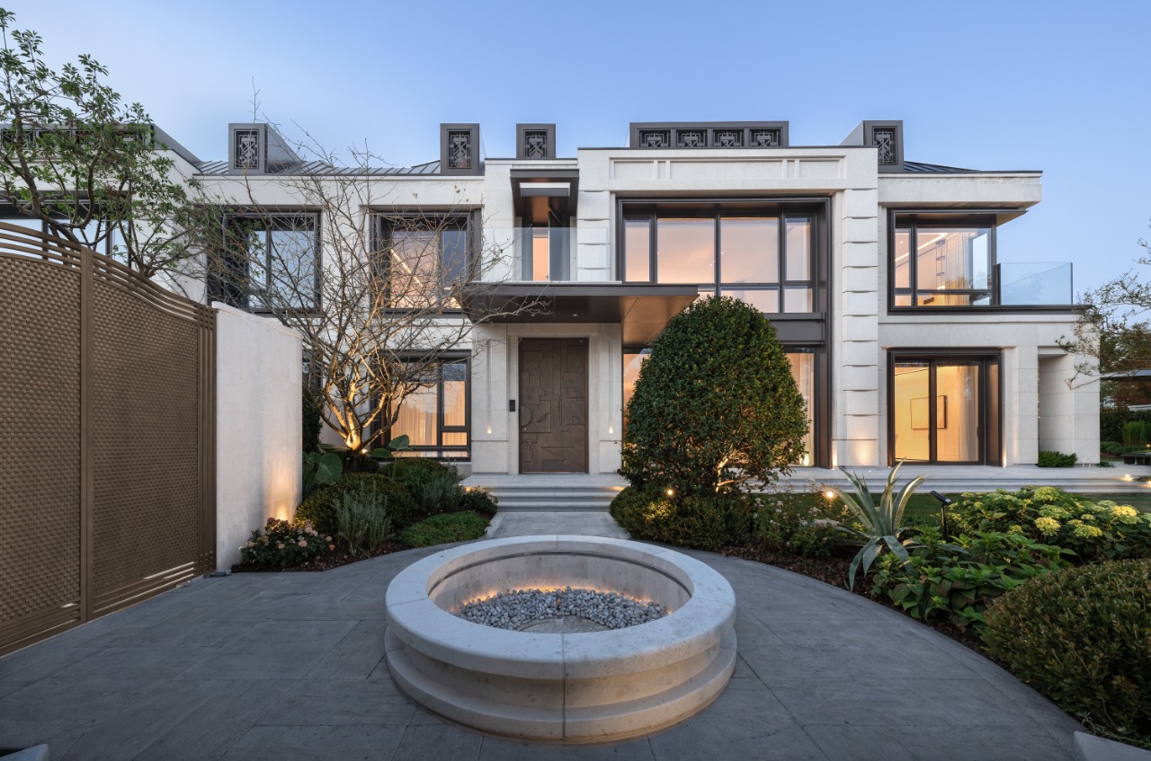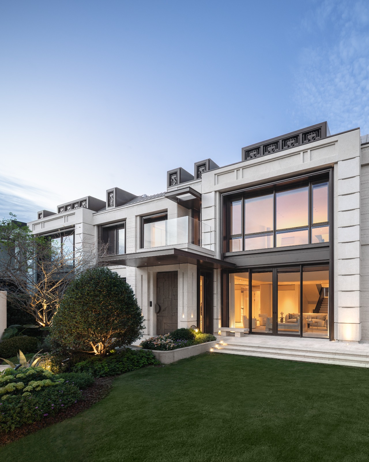 Clad in meticulously curated premium natural stone, the architectural facade boasts crisp, refined lines accented with bespoke bronze trim; the intricate entry detailing embodies subtle Art Deco ingenuity, with every finish and junction bearing the hallmark of meticulous craftsmanship.