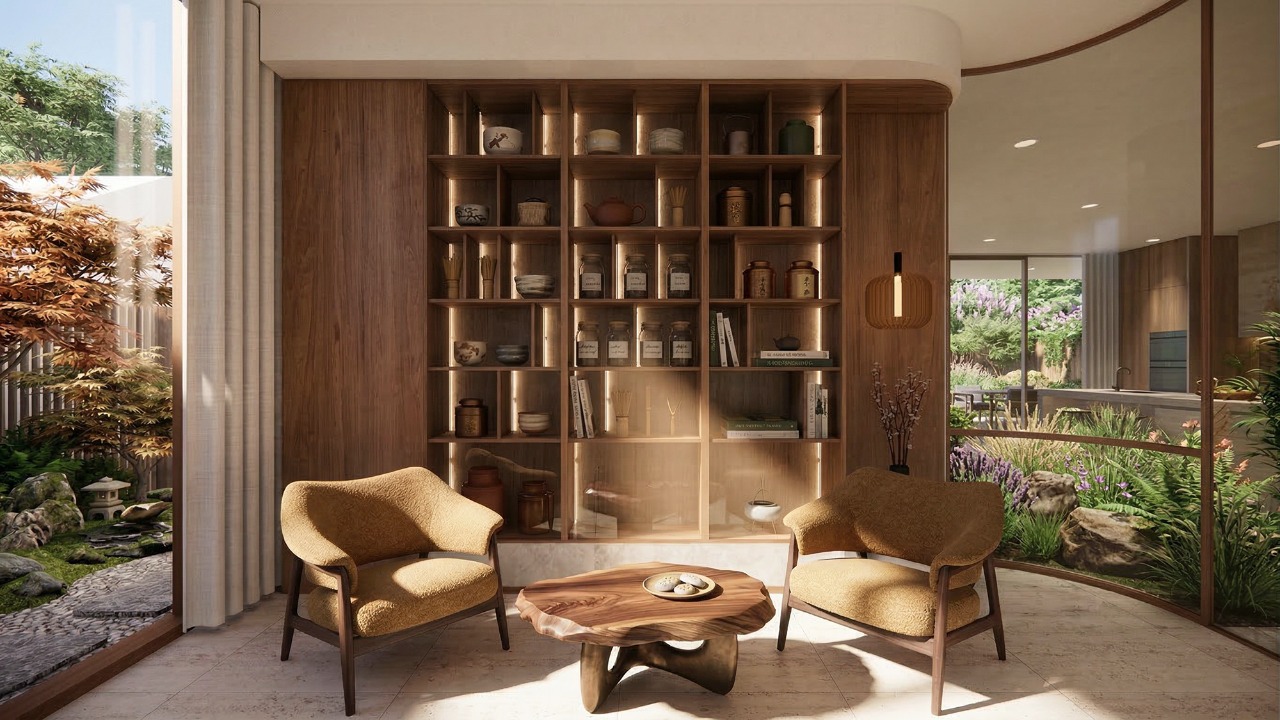 At the centre of the home, an inward-facing courtyard links directly to the tearoom, creating a serene space where the indoors and outdoors merge. Natural, tactile materials are paired with ambient lighting to cultivate a sense of softness and warmth, enriching the atmosphere and encouraging moments of pause and reflection. This careful layering of texture and light shapes a deeply sensory living experience.