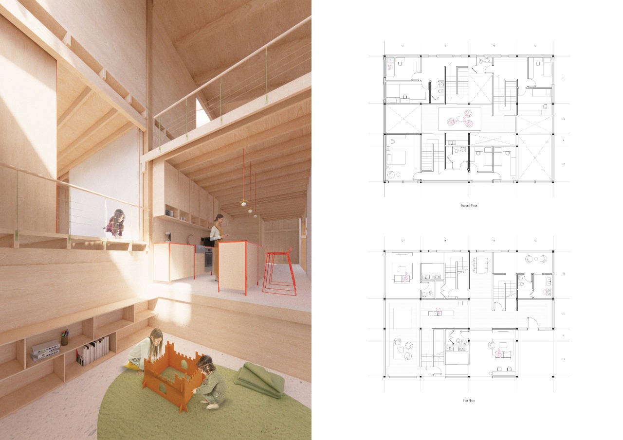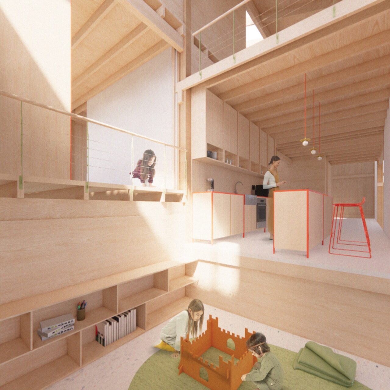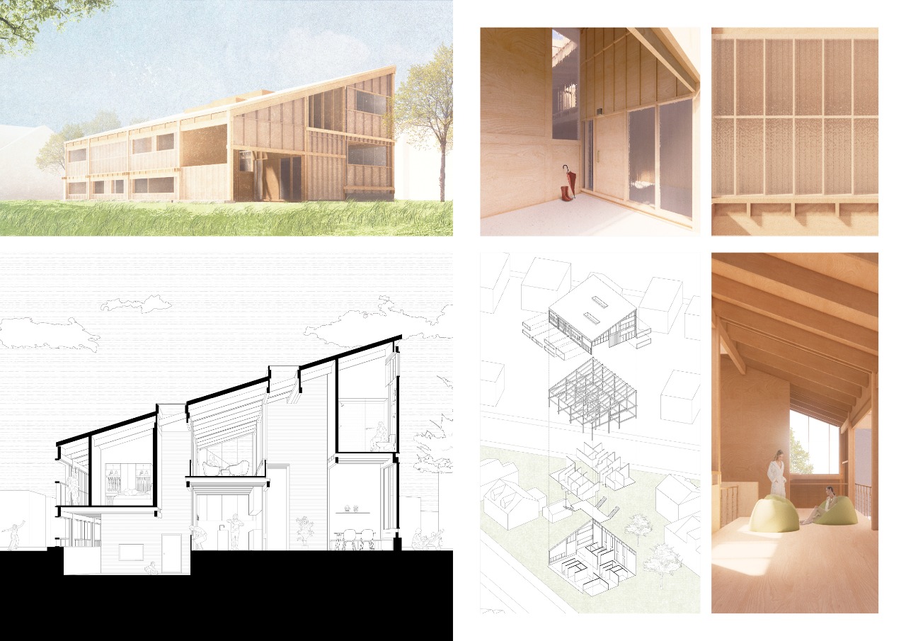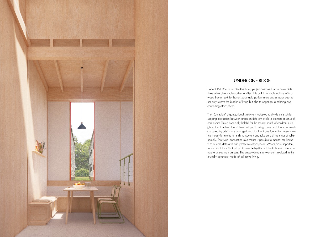 Under ONE Roof is a collective living project designed to accommodate three vulnerable single-mother families. It is built in a single volume with a wood frame, both for better sustainable performance and a lower cost, to not only relieve the burden of living but also engender a calming and comforting atmosphere.