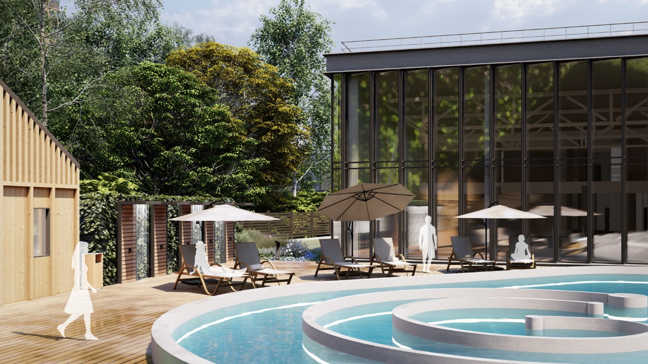 The architectural image is based on water motifs. The elegantly curved entrance group creates the impression of a sea wave that gradually fades away in the evacuation exit area. The facade of the building is decorated in a natural color scheme that harmoniously blends with the surrounding landscape. The chaotic and fragmented layout of the fibrocement panels on the facades refers to the layered and heterogeneous textures of rocks and shale, which is also in line with the theme of thermal complexes.