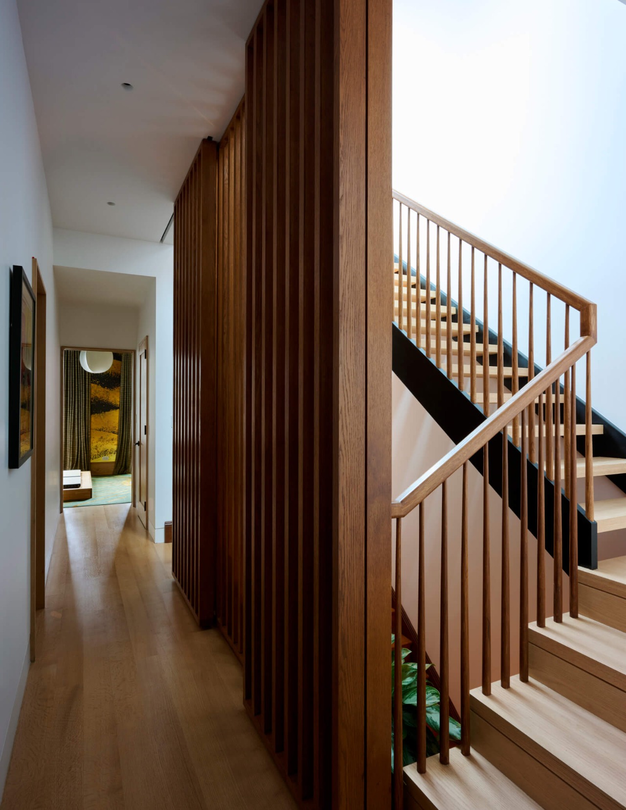 Other features include a climbing wall in the cellar gym illuminated by a walkable skylight. Another light shaft brings daylight to the vanity in the primary bathroom. This bathroom also features a cypress ofuro tub and a laundry chute for sending linens to the laundry room two floors below.