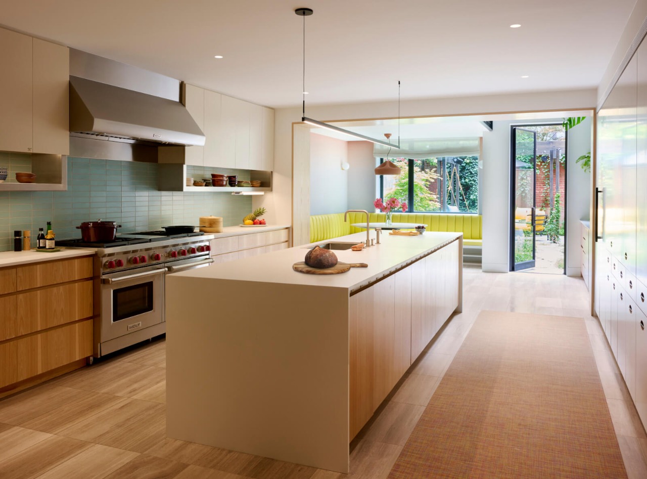 The kitchen in this Upper West Side brownstone is a cook’s paradise, with a 60″ Wolf range, a vacuum sealer, a meat dry ager, and a Roomba charging station. Since the wall of kitchen cabinets includes drawers, doors, and in-plane sliding panels, we needed a single recessed pull that could serve multiple functions. So we invented one: a bronze and hickory pull that unifies the whole wall.