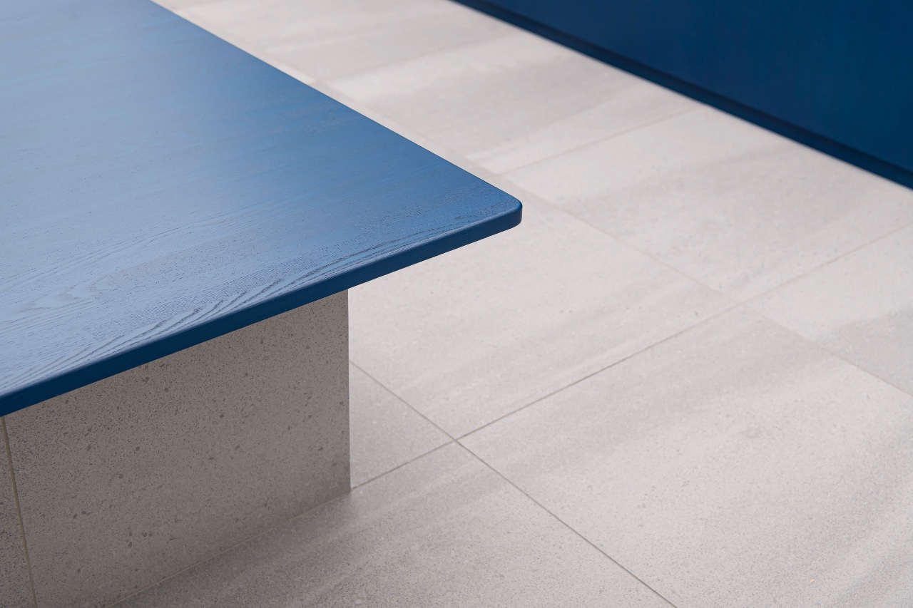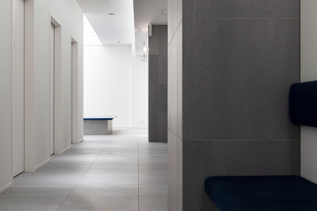 It took a long time to choose the material to use blue, as it was important to express the sea and water. Glass, stainless steel, stone, ceramic tile, fabric… Ultimately, we decided on wood, taking into consideration the hygiene and safety requirements of a clinic. We created over a dozen different wood dye samples and decided on the one that would work well with other materials, such as ceramic tile.