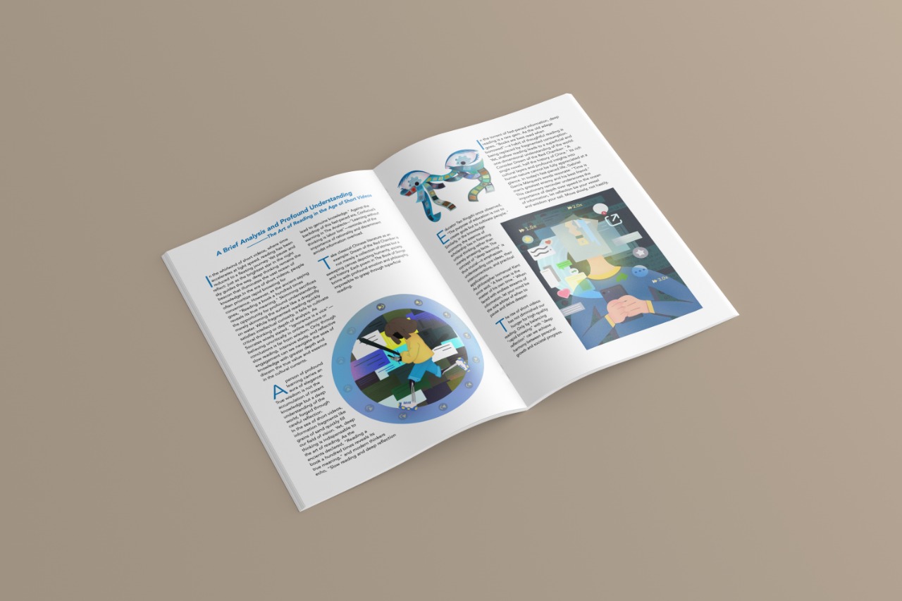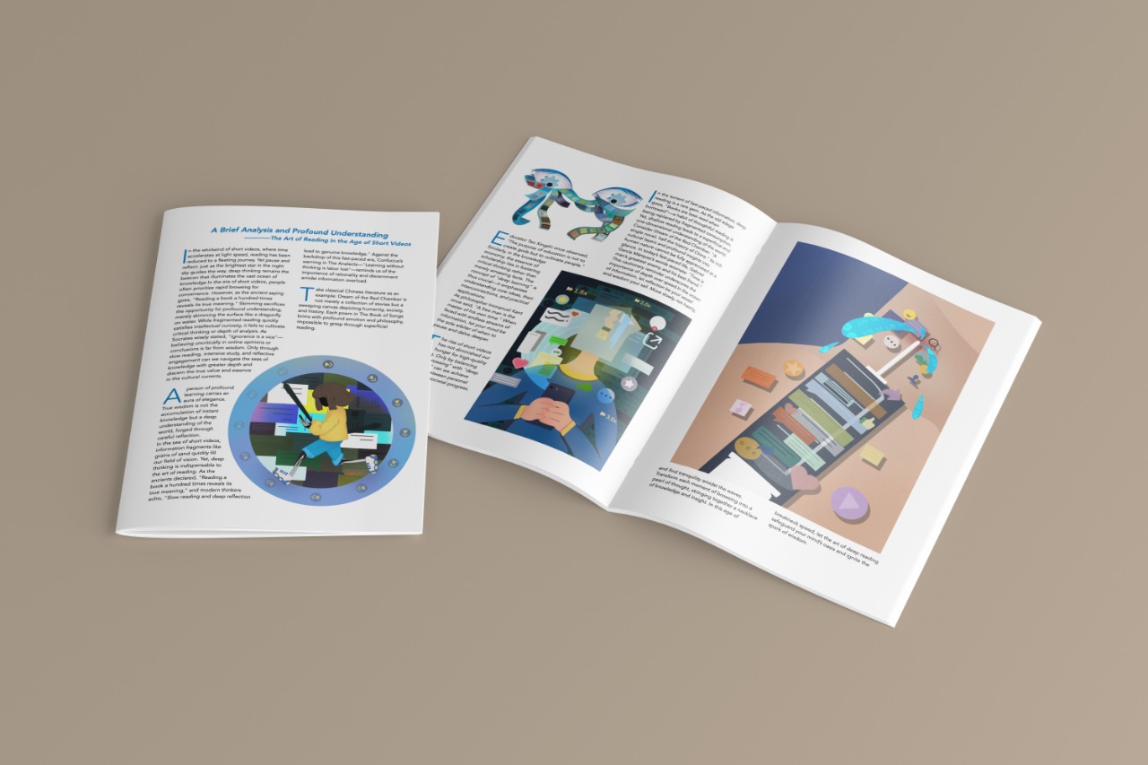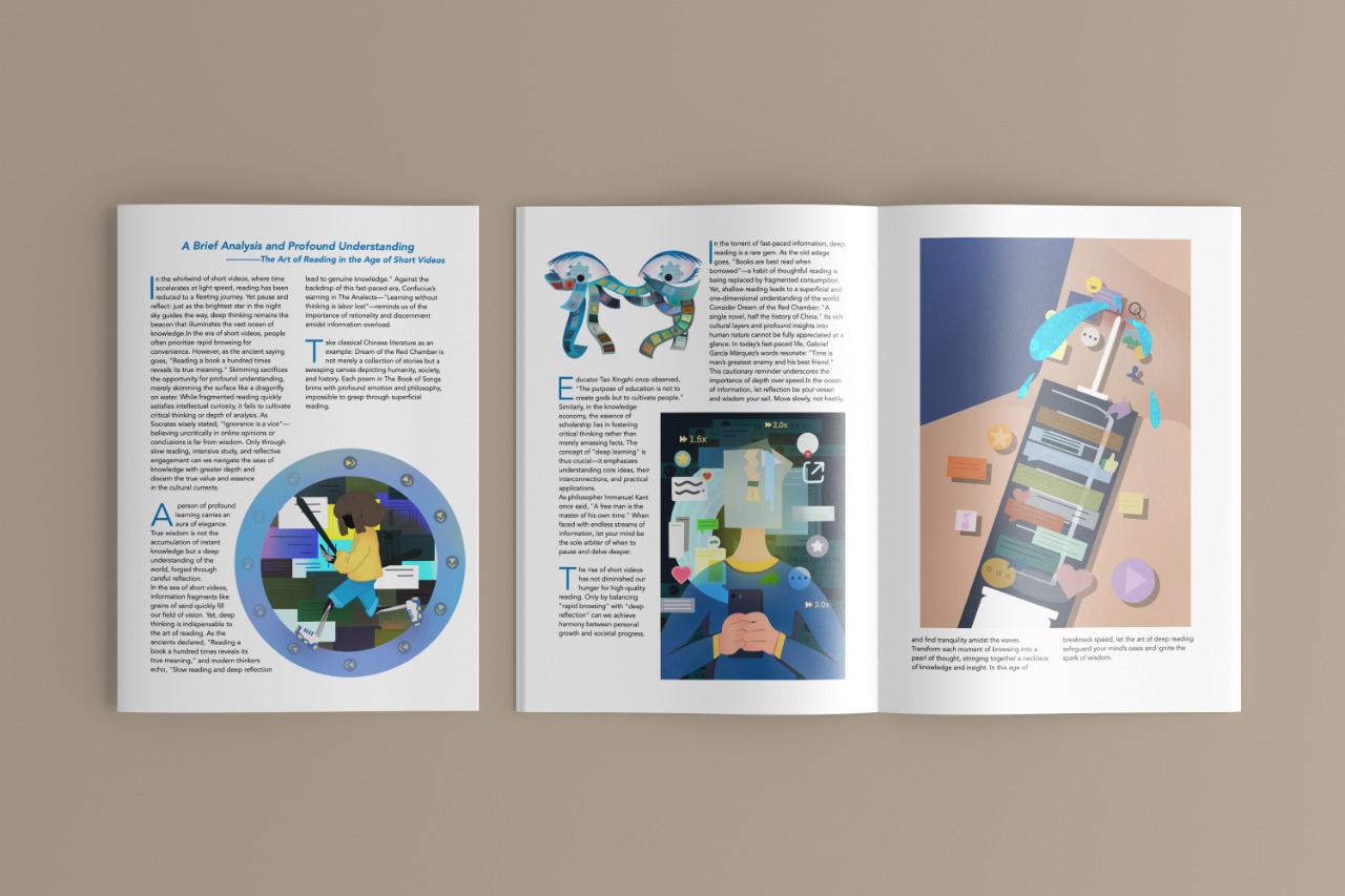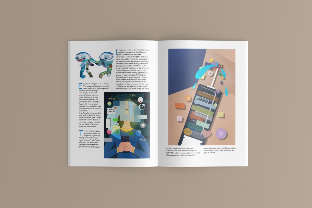 Rather than depicting reading in a literal manner, the illustrations translate abstract conditions—distraction, acceleration, immersion—into symbolic visual forms. Shifts in density, scale, and compositional balance guide viewers through different states of awareness, creating a gradual movement from visual noise to contemplative clarity. The project ultimately positions illustration as a tool for social observation, capturing the tension between fleeting consumption and meaningful engagement in the digital era.