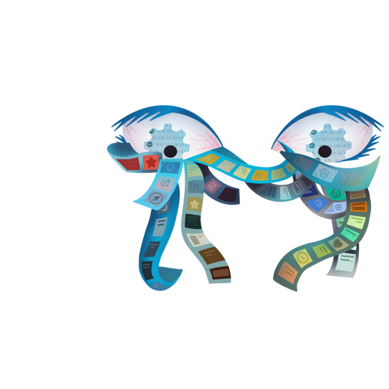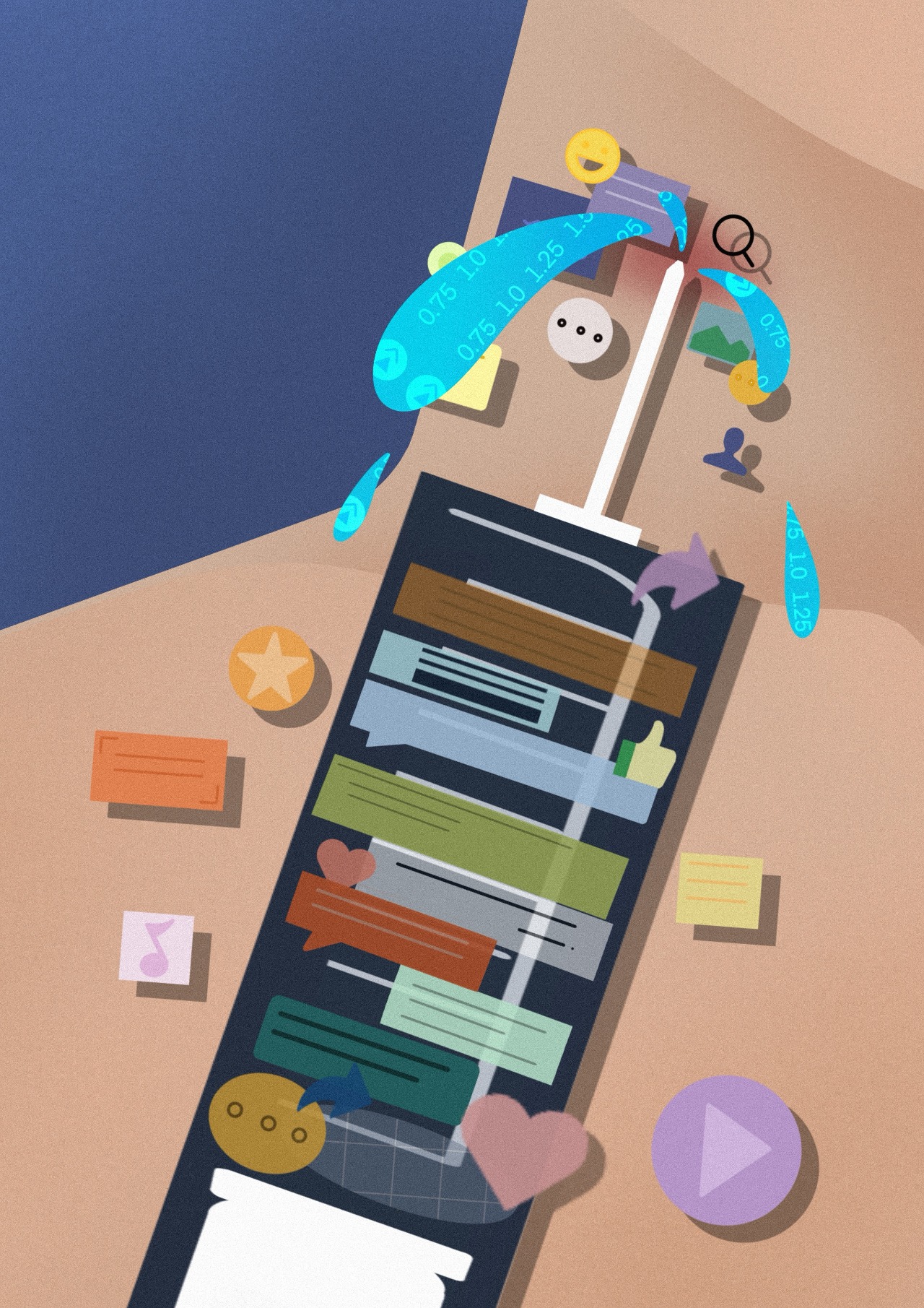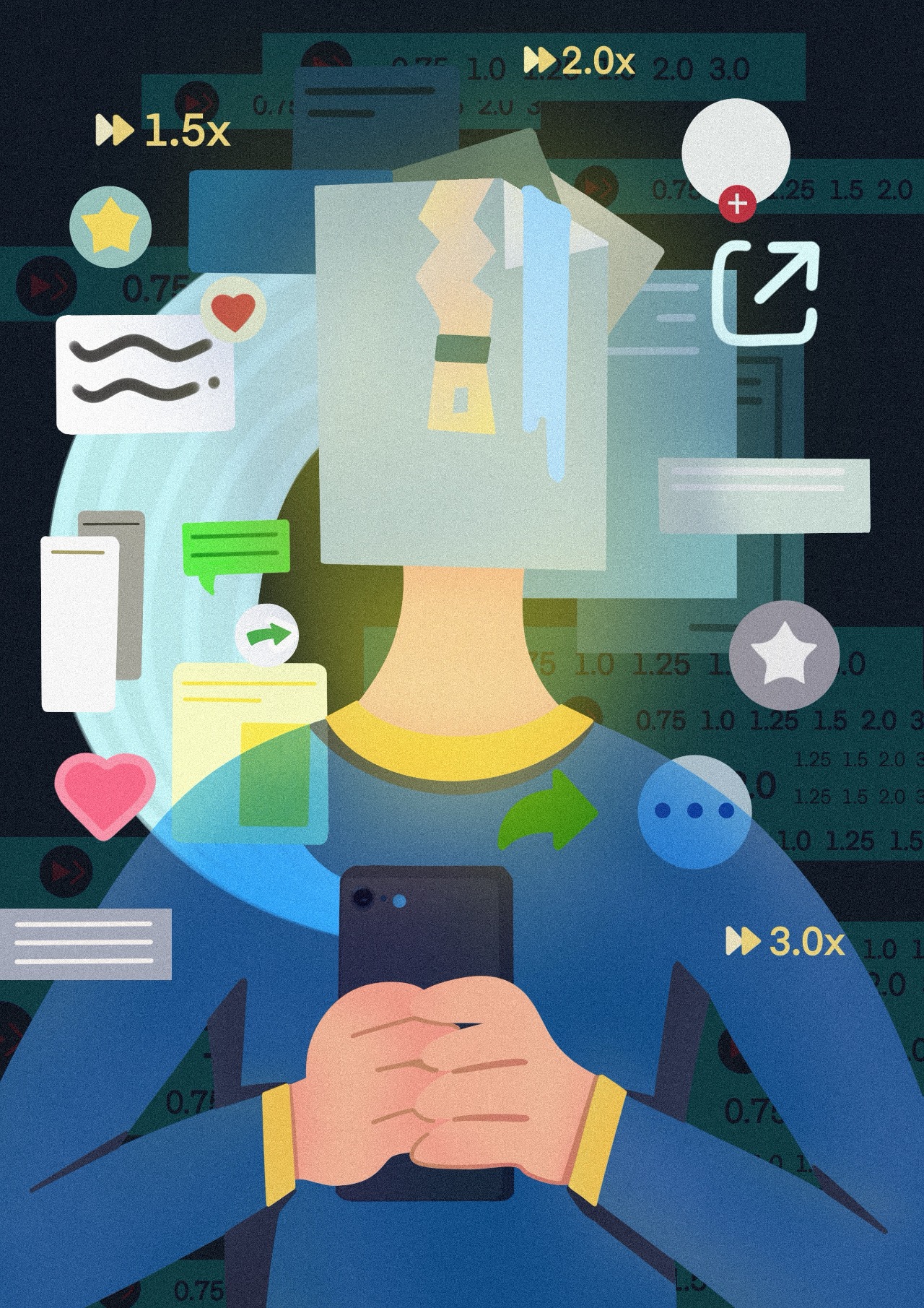 Rather than depicting reading in a literal manner, the illustrations translate abstract conditions—distraction, acceleration, immersion—into symbolic visual forms. Shifts in density, scale, and compositional balance guide viewers through different states of awareness, creating a gradual movement from visual noise to contemplative clarity. The project ultimately positions illustration as a tool for social observation, capturing the tension between fleeting consumption and meaningful engagement in the digital era.