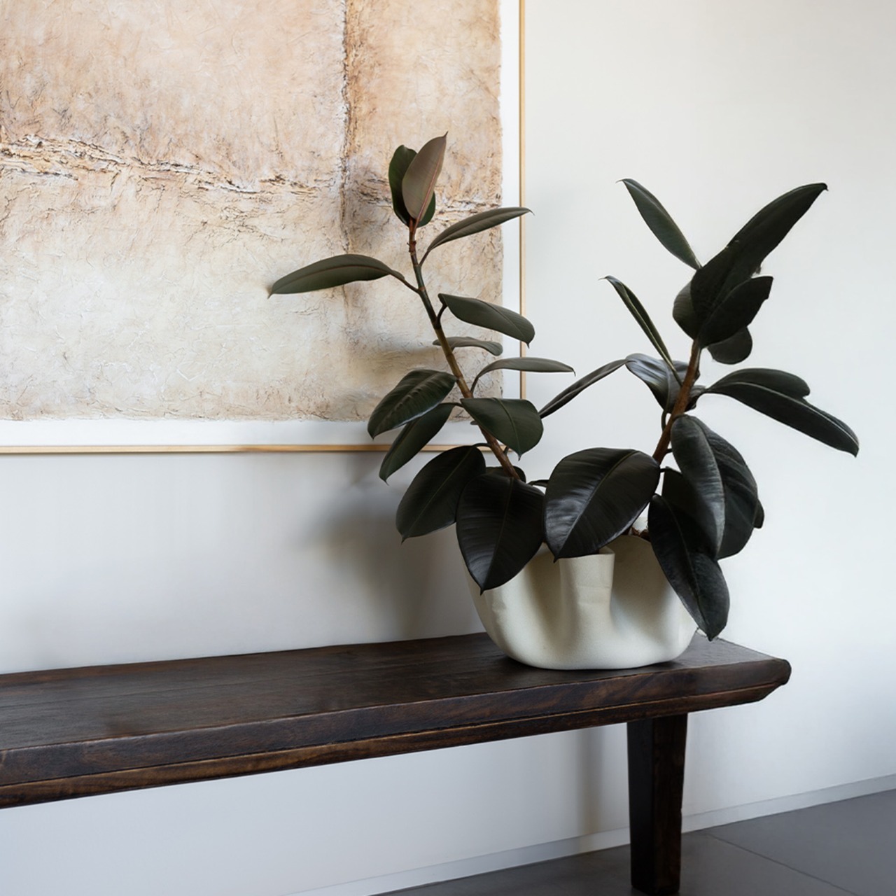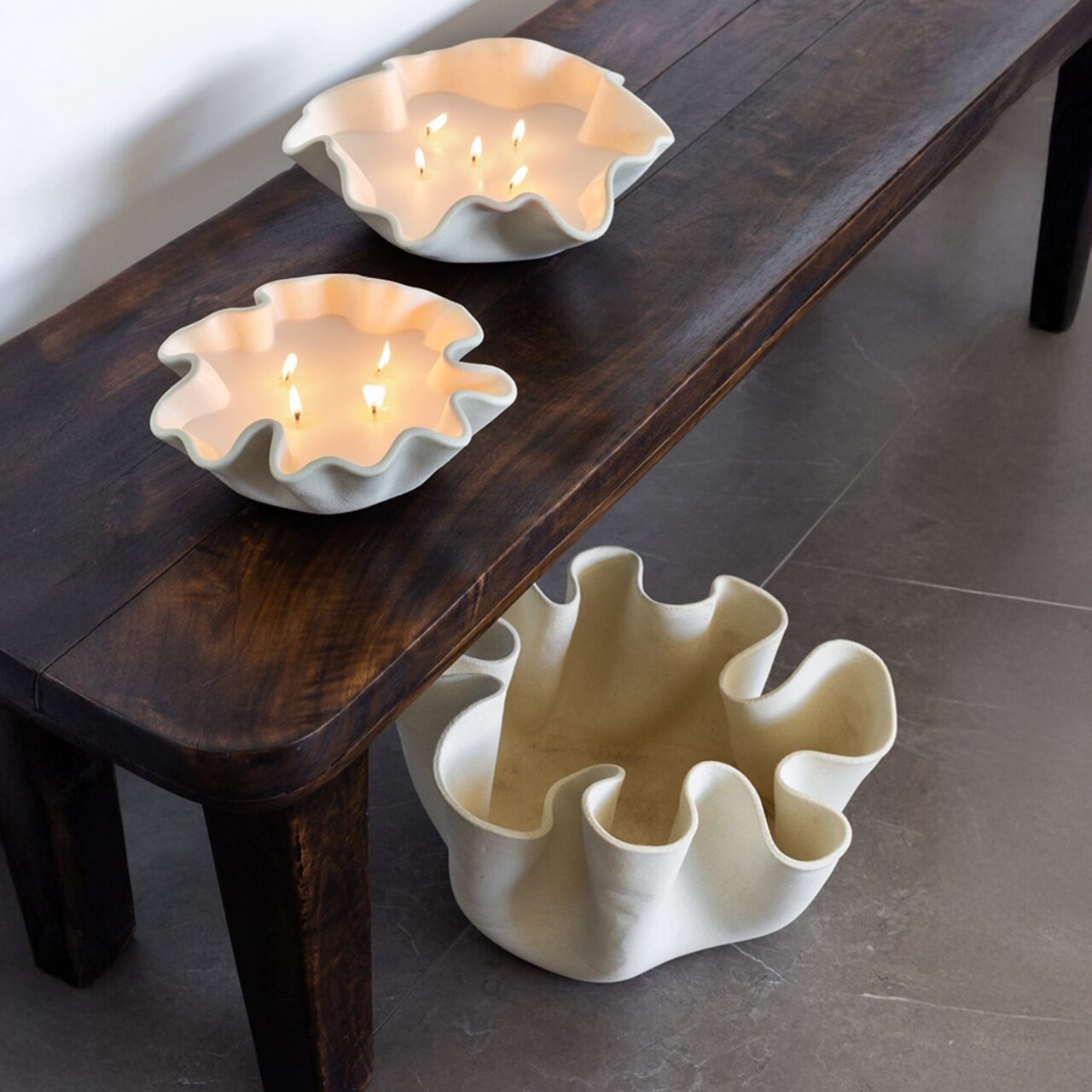 Characterised by its folded, wave-like rim, Veda Grande moves in a continuous rhythm of curves that rise and fall in fluid motion. The silhouette feels almost in movement, casting soft shadows that shift throughout the day. Elevated edges create volume and negative space, giving the piece presence from every angle.