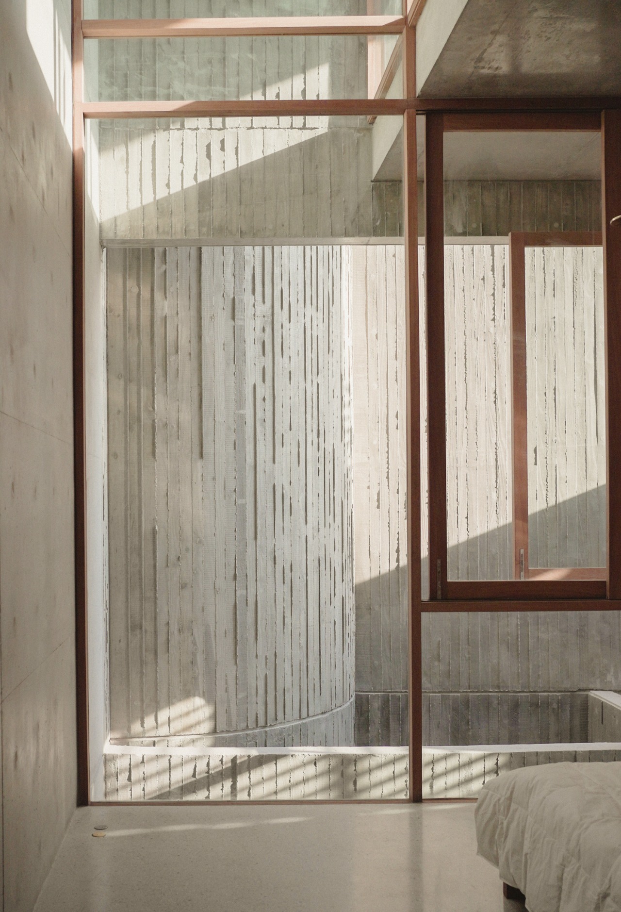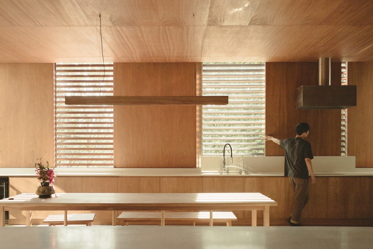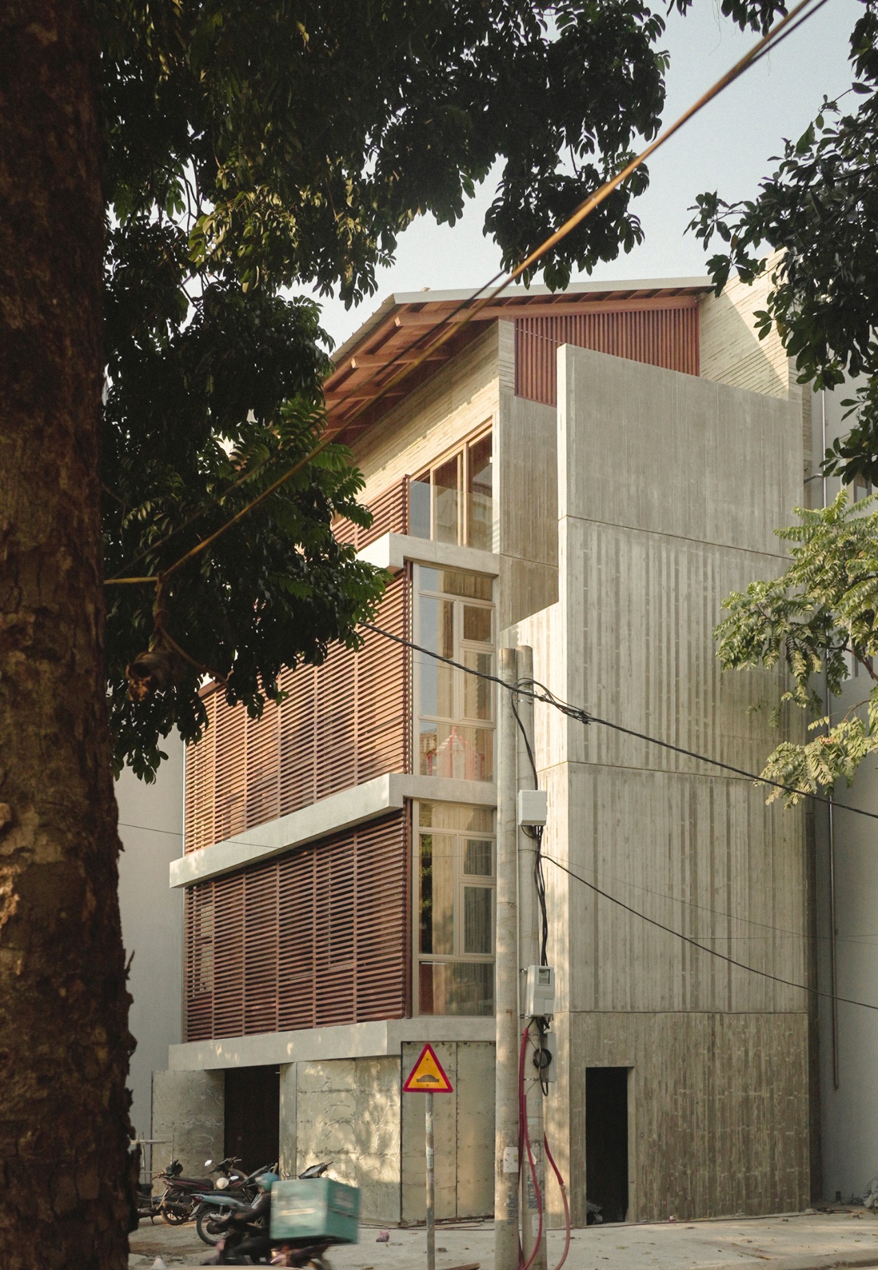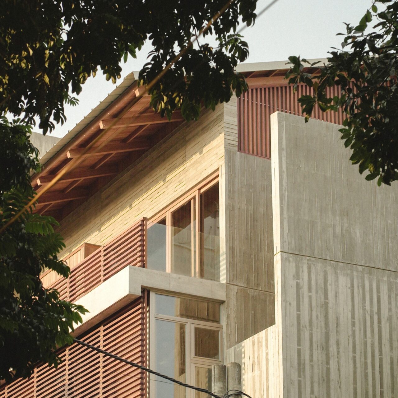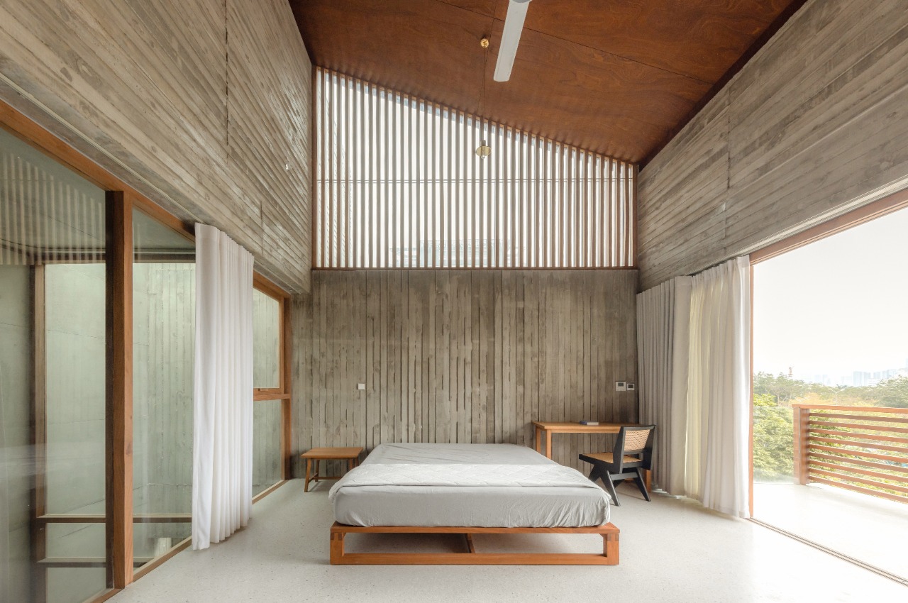 The house comprises two vertical cores anchoring opposite ends of the site, linked by a spanning slab. One core contains human and mechanical circulation. The other forms an open concrete tube channeling airflow and filtering light through a semi-exterior courtyard. These layered vertical voids generate natural ventilation throughout the living spaces. Western sun is modulated by louvered facades and hollow-core sliding shutters that open fully during cooler morning and evening hours to encourage cross-ventilation. While not aspiring to achieve a thermally optimal passive house, the design offers a regional approach to thermal comfort within the challenging constraints of a dense tropical urban block.