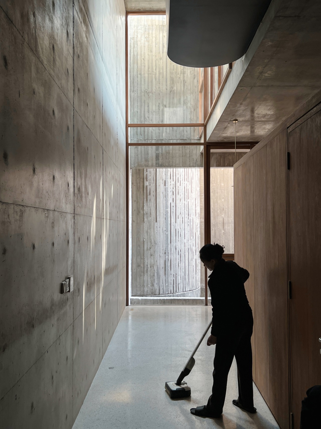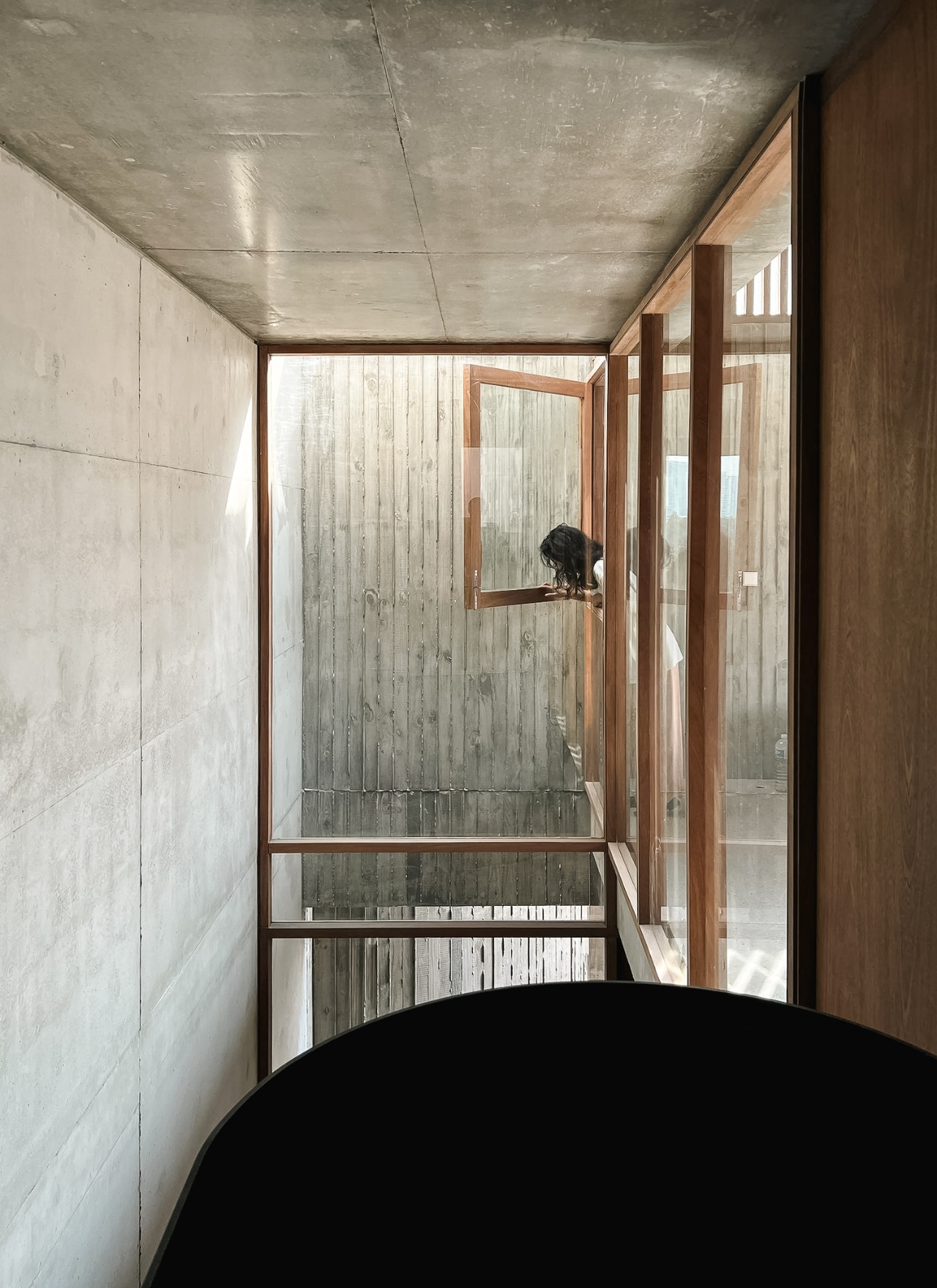 A long-married couple presented an unusual brief: accommodating fundamentally different daily rhythms. The husband rises early; the wife retires just as he awakens. Rather than forcing synchronization, the design maintains physical distance between their private spaces while creating multiple channels for sensing presence and enabling gentle communication. The most explicit connection is an interior balcony, a small platform suspended within a tall void that facilitates brief encounters. Their rooms connect vertically through two shared voids where light and sound travel at varying intensities. These same voids distribute cool air throughout the house, establishing not only thermal circulation but an intangible atmosphere of co-living that honors individual rhythms while sustaining connection.