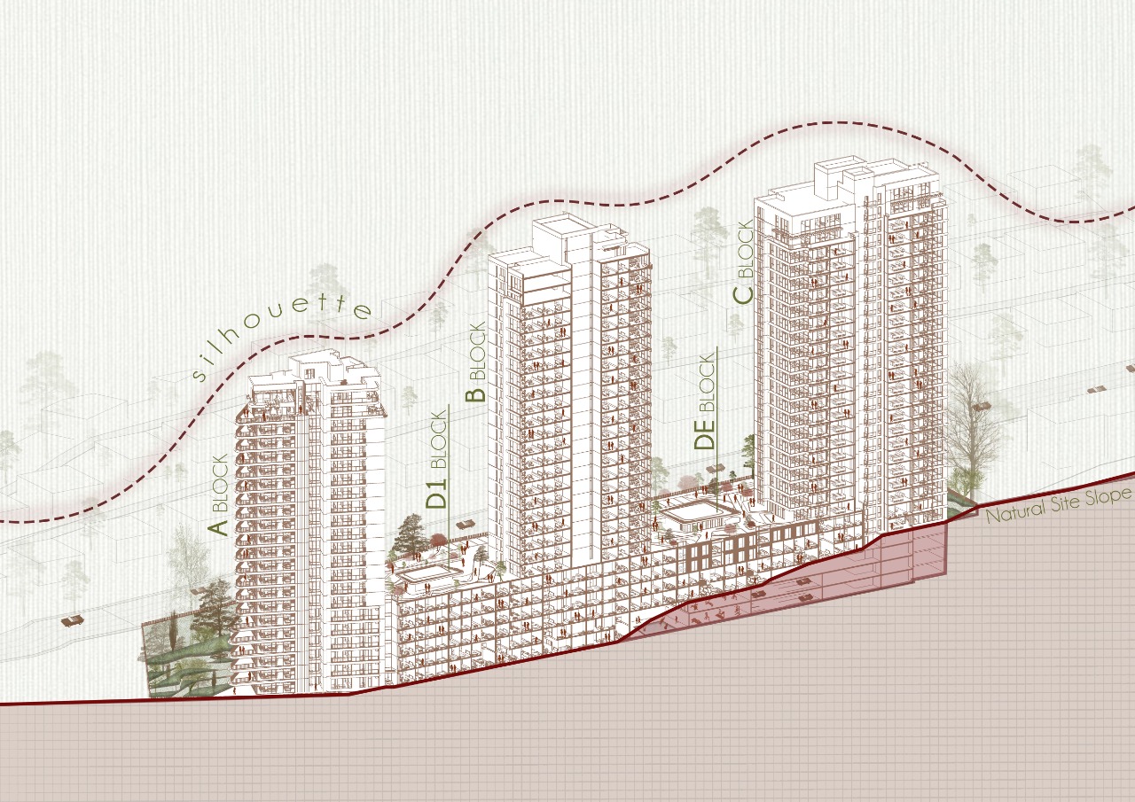 The sloping terrain is treated as a generative design parameter. The podium functions as a mediating layer between the topography and the residential volumes above, anchoring the project to the ground while accommodating base-level apartments. This relationship is reinforced through façade articulation, where balcony parapets gradually become darker and more opaque toward lower levels, emphasizing continuity with the slope.