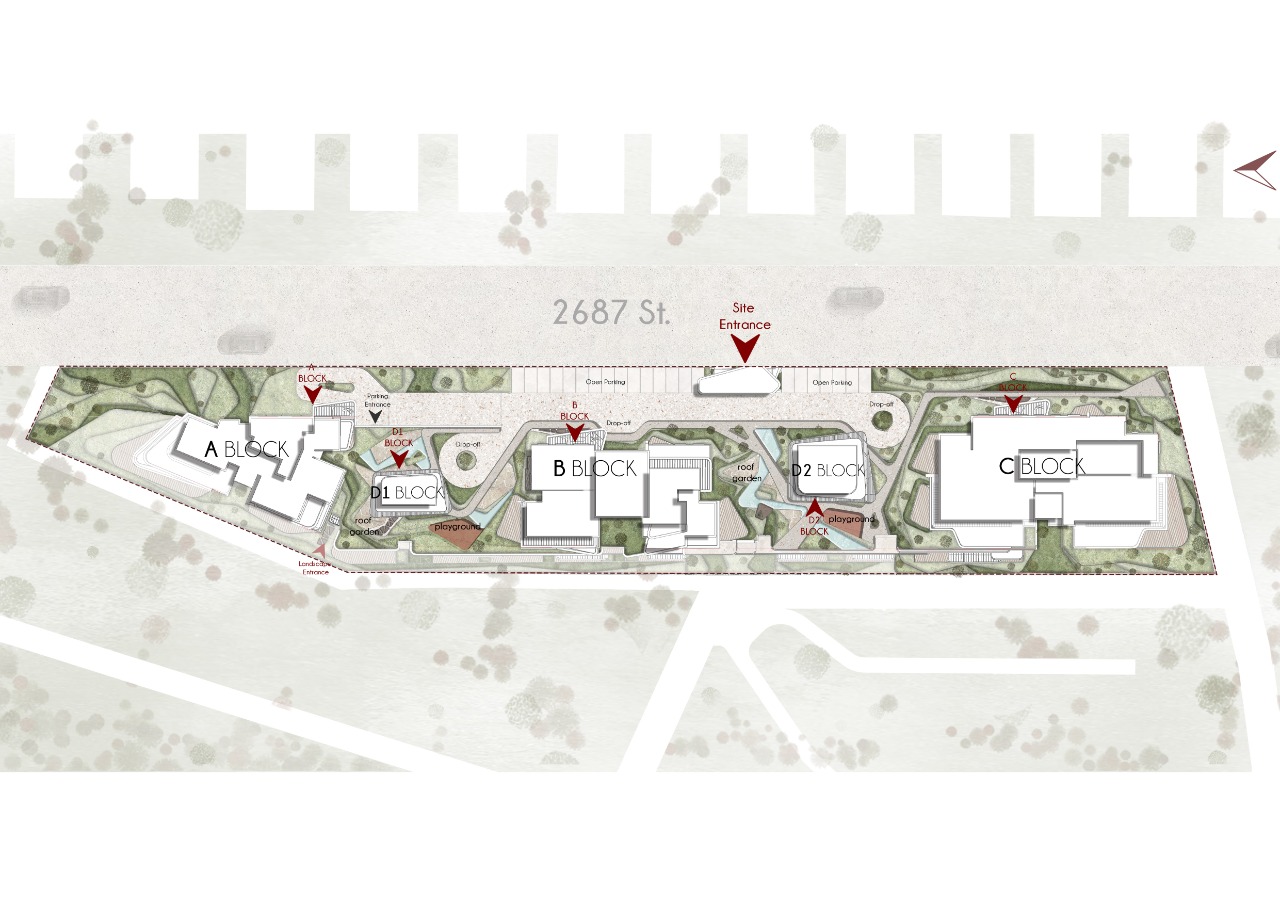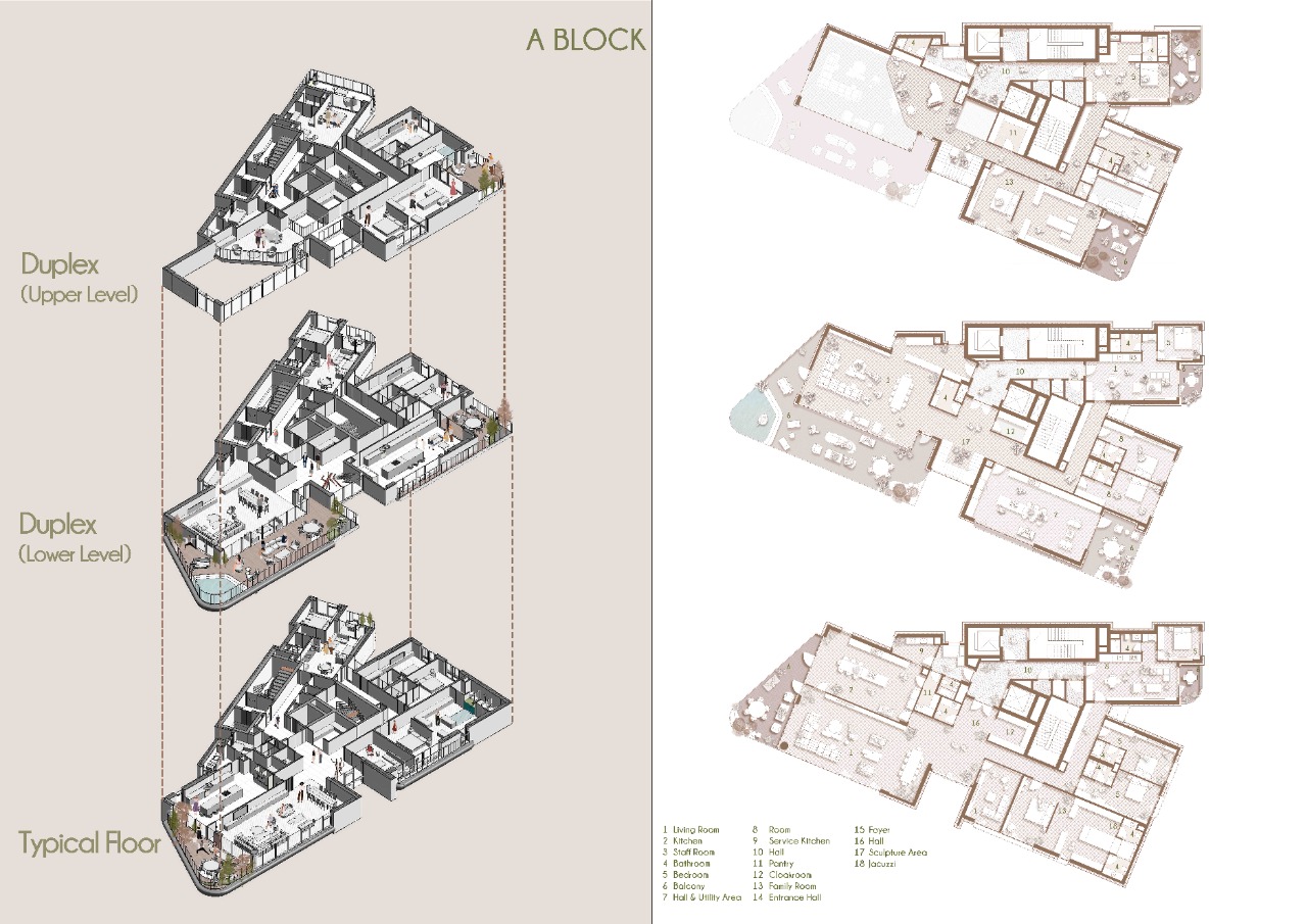 Located in Çayyolu, Ankara, the project is conceived as a prestigious residential development on a sloping and elongated site. The architectural approach is shaped by the site’s strong topographical character and its relationship with the surrounding landscape. Composed of three residential blocks resting on a continuous podium, the project positions itself within the luxury housing segment while questioning conventional residential models. The primary design intention is to redefine everyday domestic life through spatial flexibility, long-term usability, and a closer relationship between architecture, landscape, and user. Responding to the linear geometry of the plot, the massing is articulated into three distinct blocks to avoid a monolithic presence. This fragmentation introduces rhythm and movement into the urban silhouette, establishing a dialogue with the skyline. The composition balances openness and solidity, creating a cohesive architectural identity.