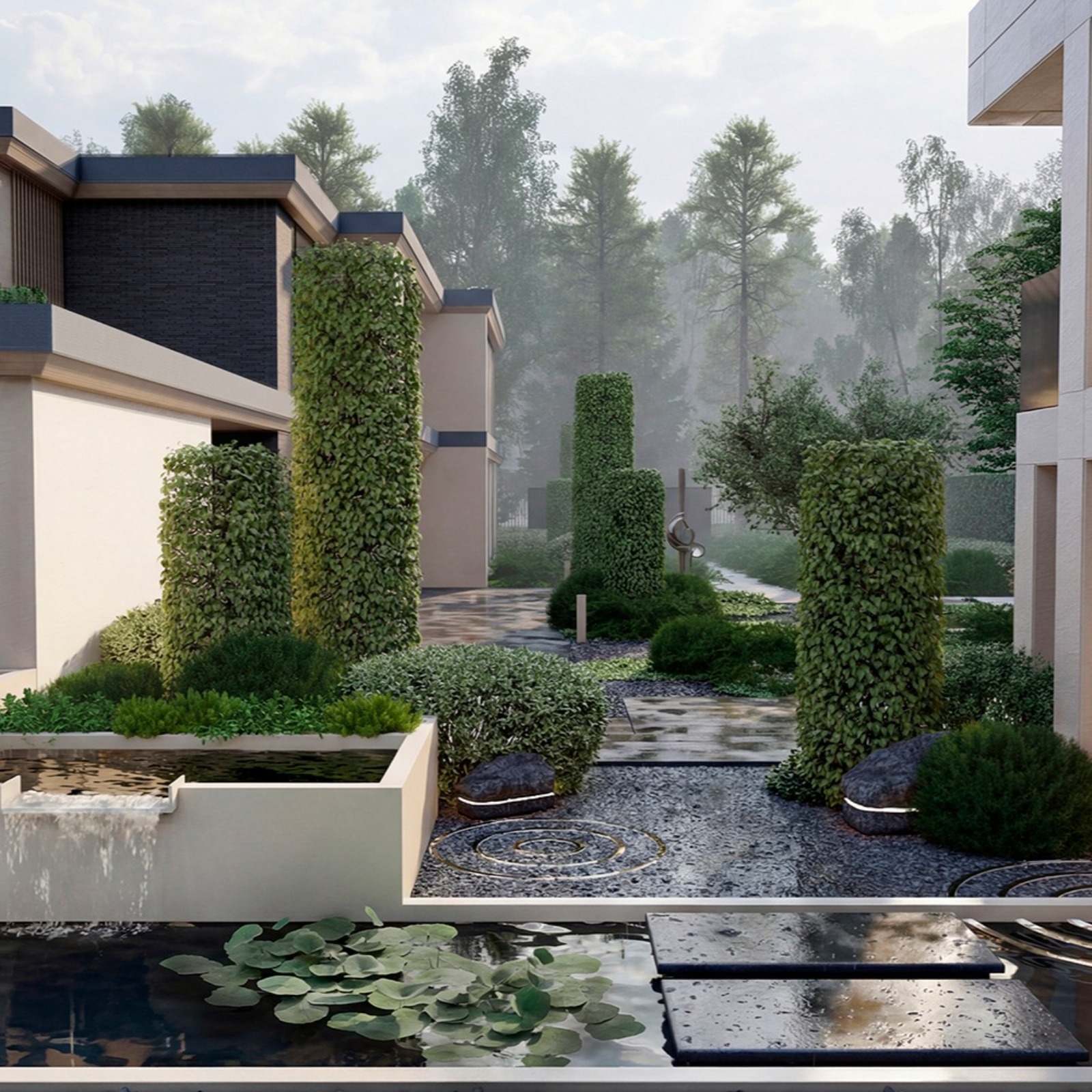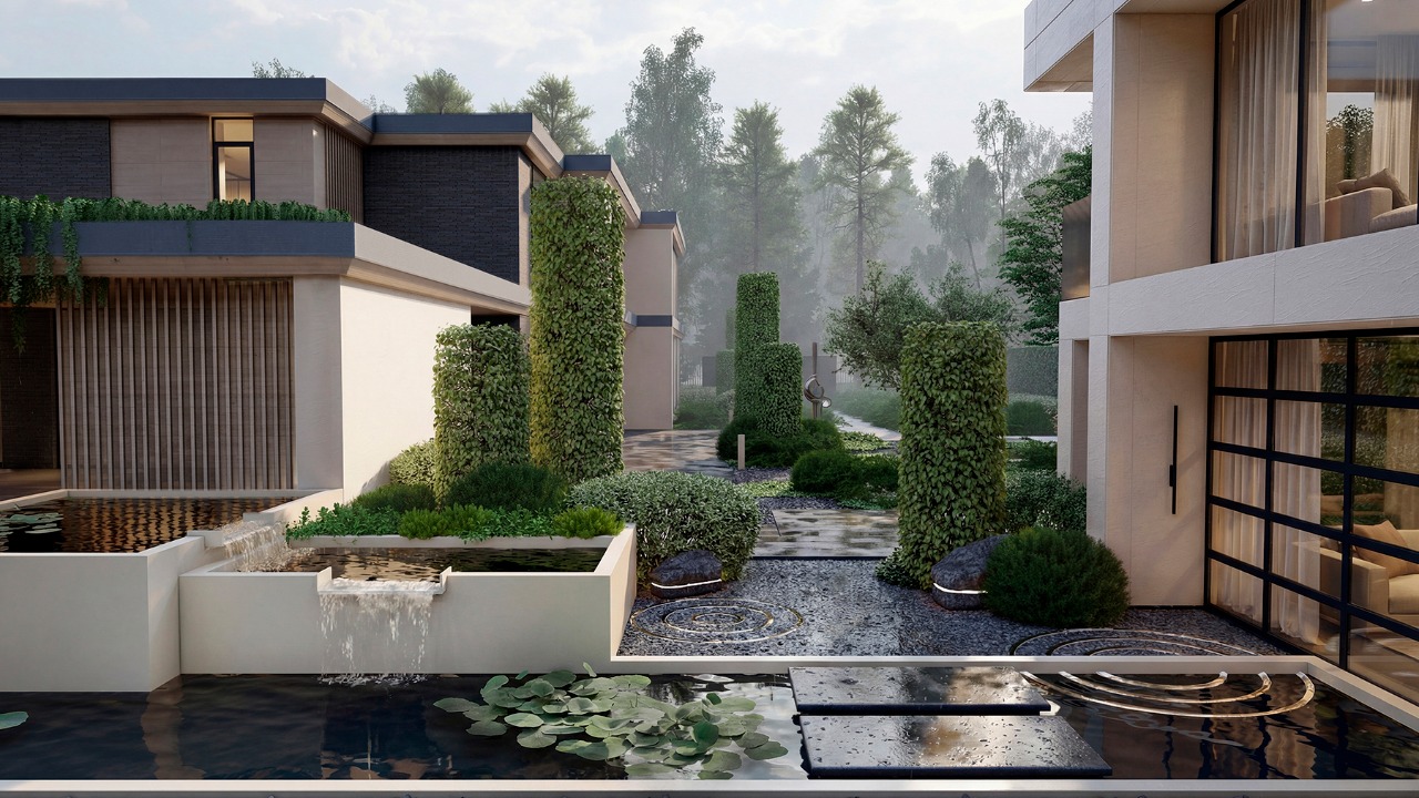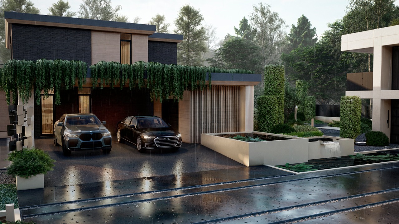 The parking lot is made of natural materials. There is a cascading waterfall here. The landscaping harmoniously complements the precise geometry of the architecture, acting as a delicate frame that supports the overall concept of the space.
