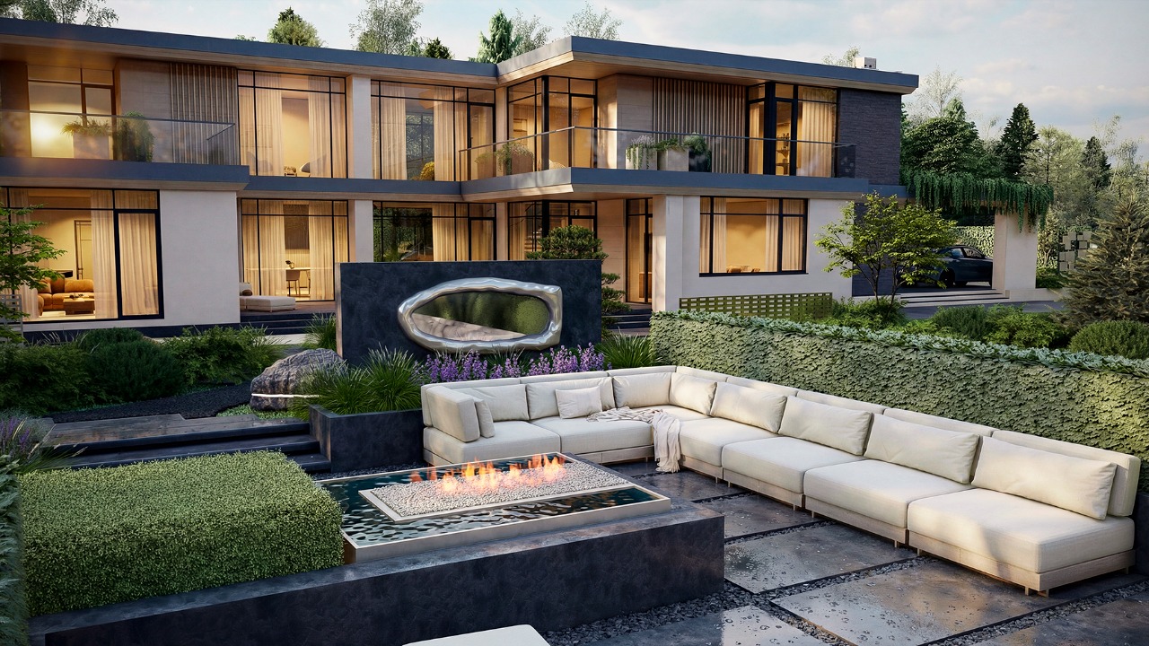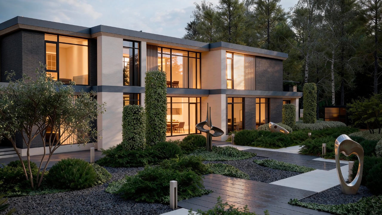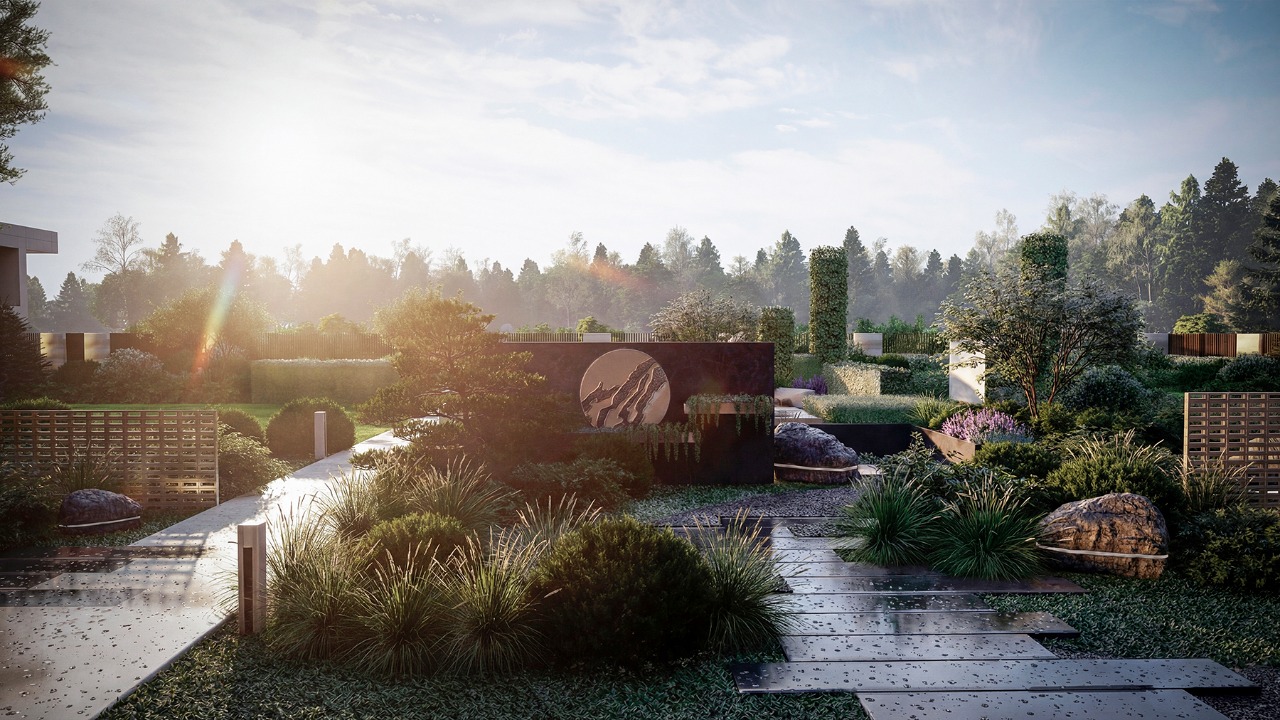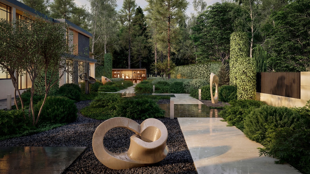 Two conceptual locations were created in the garden: the highest panoramic windows of the main house offer views of the sculpture garden and the Japanese garden. The soft lines of the mixed borders connect these two areas. The landscaping features trimmed hawthorn «Crataegus persimilis», masses of «Cornus alba», «Juniperus horizontalis», and locally «Pinus mugo» mountain pines, which add structure and naturalness to the area. The reception garden areas feature a unique collection of custom art objects created by the client. The layout is geometric, but it is softened by smooth, rounded lines of landscaping. Japanese garden: walls made of natural stone, decorative partitions, and metal planters with plants. A round bas-relief is a symbol of the cyclical nature of existence, and natural materials represent the unity of nature and humans. A nivaki is a symbol of antiquity and stability.