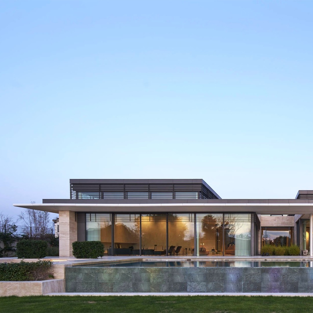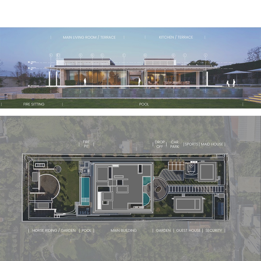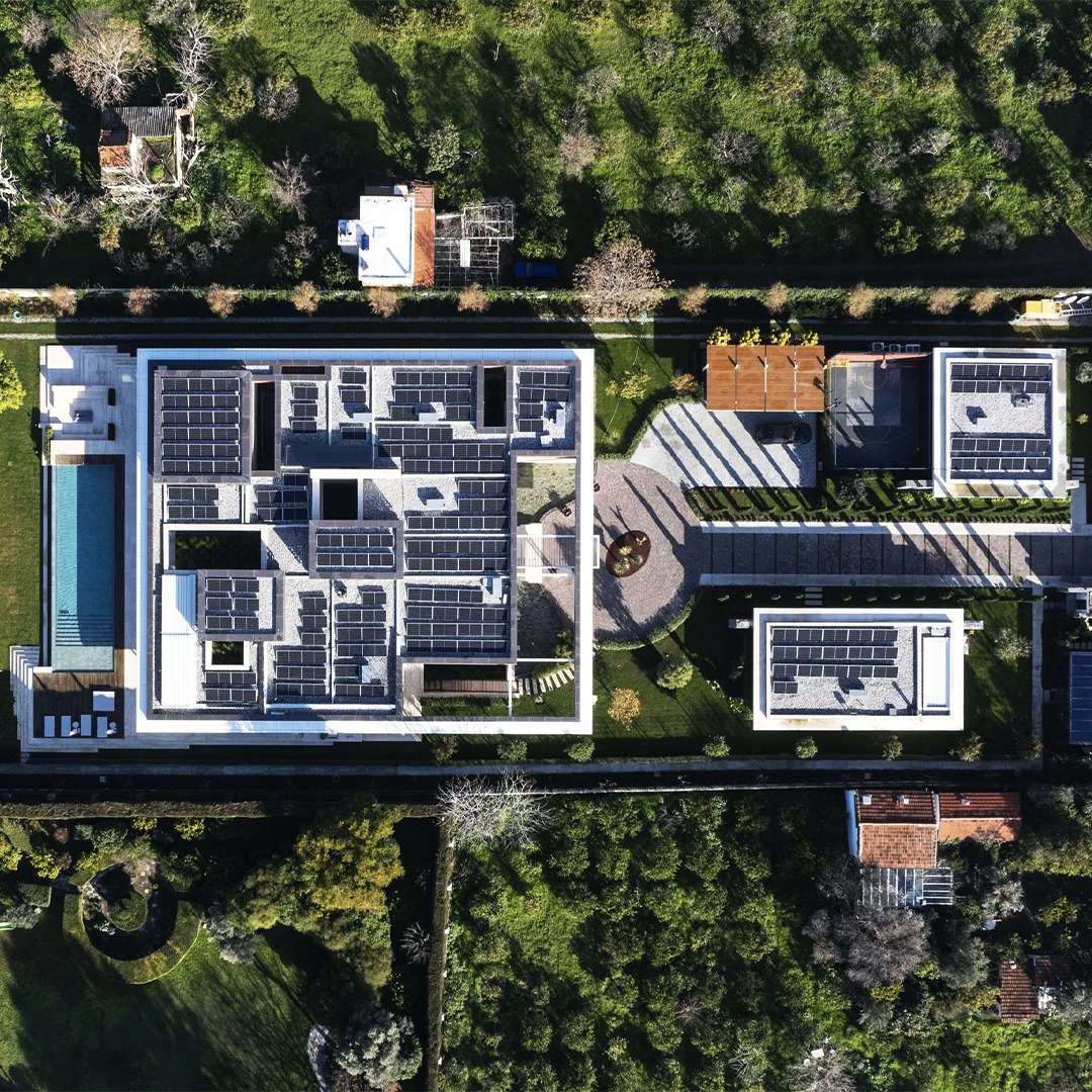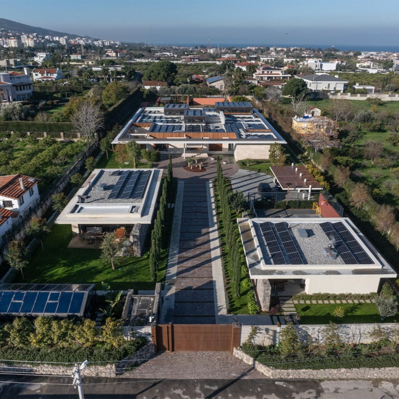 Located in Urla, formerly known by its Greek name Vourla and now called Urla, one of the most popular areas of Izmir in the Aegean region, this single-storey house with the highest ceilings (almost high enough to take a -mezzanine- together) offers its owners a life in touch with nature by combining functional use and sustainability. Located on a 6650 m² flat land, the group of buildings forms a holistic living space with the main building, guest house and outbuilding block. The project has a regular layout that organizes day and night use of the interior spaces into private and public areas. Designed for homeowners who are contemporary art collectors, the wide corridors, personalized solutions and comfortable living spaces create a gallery atmosphere.This distinguished building has a total floor area of 850 m² and includes an entrance hall, multi-purpose hall, dining room, kitchen, home office and three suite bedrooms. The partial basement of 413 m² includes a private spa, gym, utility rooms, technical and other functional areas. The corridor, which is placed on a straight axis from the entrance door, is 3.5 meters wide and 85 m² in area and also functions as an art gallery. The corridor-gallery ends with a window framing the pool and the garden directly opposite. This axis also creates a natural boundary separating the private living areas from the common/guest areas. On the right side of the corridor, there are two suite bedrooms with the master bedroom, and on the left side, there is a home office and a dining room with an open kitchen carefully equipped with today’s technological tools and appliances.Reaching 5 m ceiling height, the roof is flooded with daylight filtered through the ventilation windows or moonlight in the evening, warming the interior of the house with the energy brought by natural light and providing fresh air circulation. In addition, the staircase connection in the center of the building works like a courtyard, allowing natural light to reach the basement.The wide eaves surrounding the building serve as a canopy to add coolness (sea-breeze) in order not to be affected by the hot Aegean climate. Since there is a movable pergola in the parts where the eaves meet the interior space, it was made with the idea of optimizing natural lighting in different seasons and hours of sunlight.The guest house, which is more modest in size than the main building, consists of two suites and a living room and measures 145 m². The net floor height in this building is 2.90 meters. The stone wall along the road provides privacy and creates a visual integrity with the outbuilding opposite.In front of the terrace of the guest house overlooking the garden, there is a greenhouse and orchard area where the owners grow their own crops. Landscaping is in harmony with nature and supported by green areas.The 110 m² outbuilding is designed to provide a comfortable living space for the staff who take care of the garden and stables.