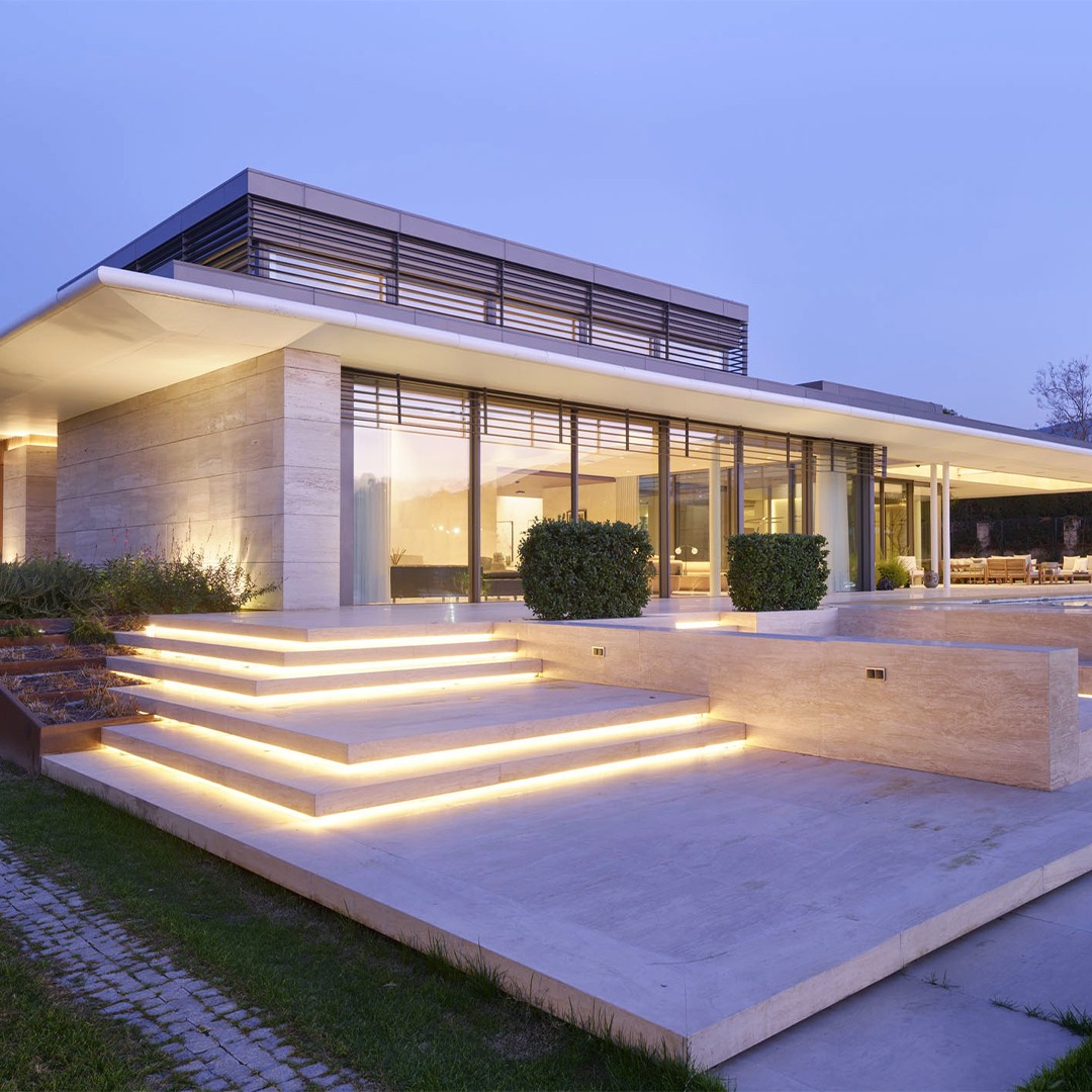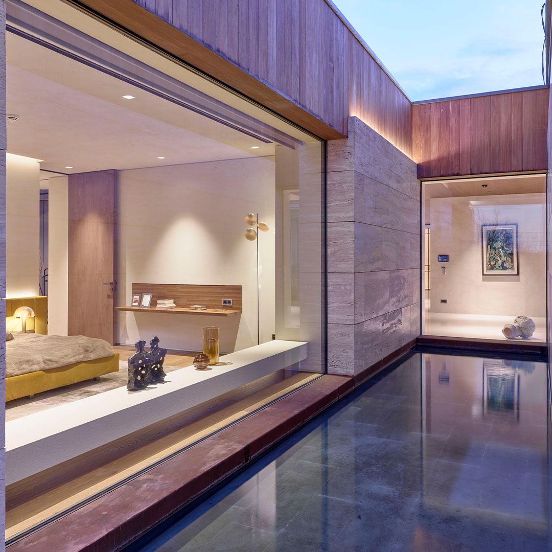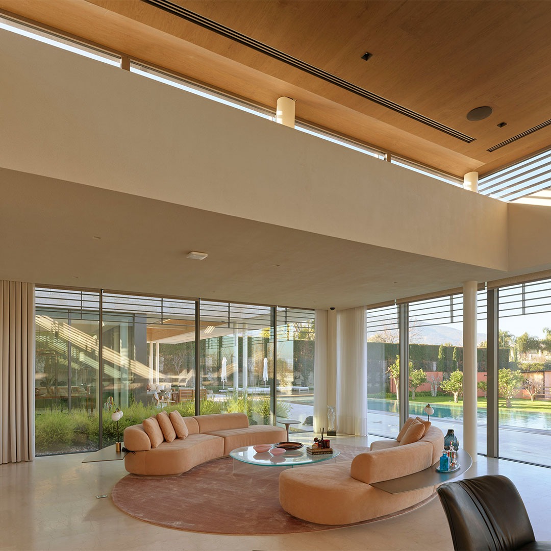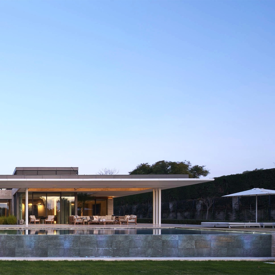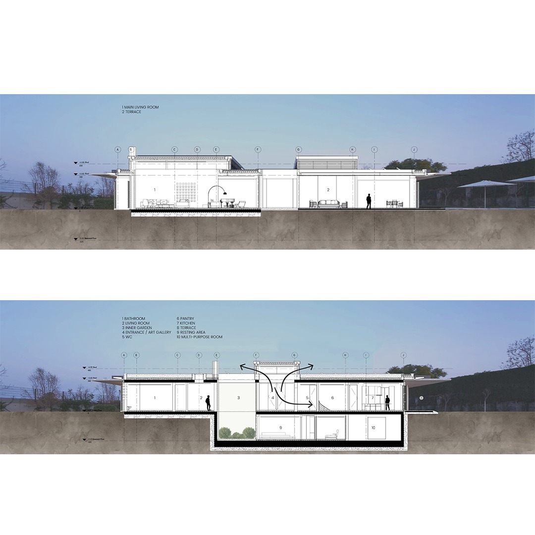 Located in Urla, formerly known by its Greek name Vourla and now called Urla, one of the most popular areas of Izmir in the Aegean region, this single-storey house with the highest ceilings (almost high enough to take a -mezzanine- together) offers its owners a life in touch with nature by combining functional use and sustainability. Located on a 6650 m² flat land, the group of buildings forms a holistic living space with the main building, guest house and outbuilding block. The project has a regular layout that organizes day and night use of the interior spaces into private and public areas. Designed for homeowners who are contemporary art collectors, the wide corridors, personalized solutions and comfortable living spaces create a gallery atmosphere.This distinguished building has a total floor area of 850 m² and includes an entrance hall, multi-purpose hall, dining room, kitchen, home office and three suite bedrooms. The partial basement of 413 m² includes a private spa, gym, utility rooms, technical and other functional areas. The corridor, which is placed on a straight axis from the entrance door, is 3.5 meters wide and 85 m² in area and also functions as an art gallery. The corridor-gallery ends with a window framing the pool and the garden directly opposite. This axis also creates a natural boundary separating the private living areas from the common/guest areas. On the right side of the corridor, there are two suite bedrooms with the master bedroom, and on the left side, there is a home office and a dining room with an open kitchen carefully equipped with today’s technological tools and appliances.Reaching 5 m ceiling height, the roof is flooded with daylight filtered through the ventilation windows or moonlight in the evening, warming the interior of the house with the energy brought by natural light and providing fresh air circulation. In addition, the staircase connection in the center of the building works like a courtyard, allowing natural light to reach the basement.The wide eaves surrounding the building serve as a canopy to add coolness (sea-breeze) in order not to be affected by the hot Aegean climate. Since there is a movable pergola in the parts where the eaves meet the interior space, it was made with the idea of optimizing natural lighting in different seasons and hours of sunlight.The guest house, which is more modest in size than the main building, consists of two suites and a living room and measures 145 m². The net floor height in this building is 2.90 meters. The stone wall along the road provides privacy and creates a visual integrity with the outbuilding opposite.In front of the terrace of the guest house overlooking the garden, there is a greenhouse and orchard area where the owners grow their own crops. Landscaping is in harmony with nature and supported by green areas.The 110 m² outbuilding is designed to provide a comfortable living space for the staff who take care of the garden and stables.