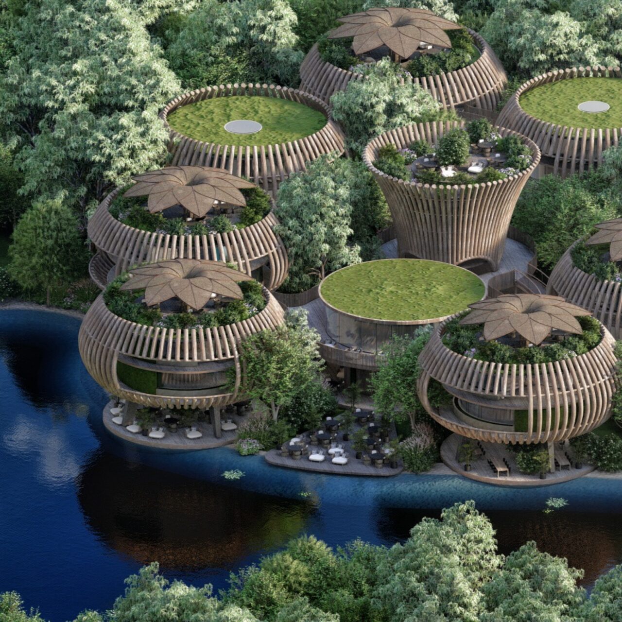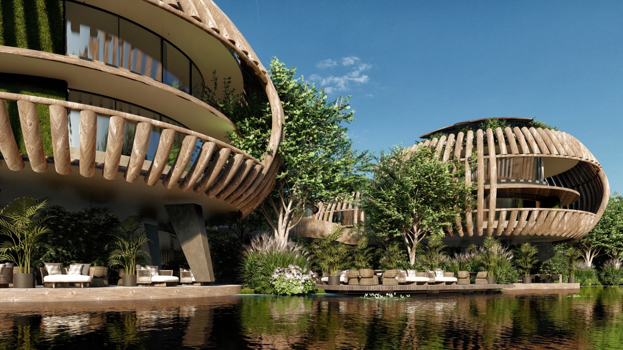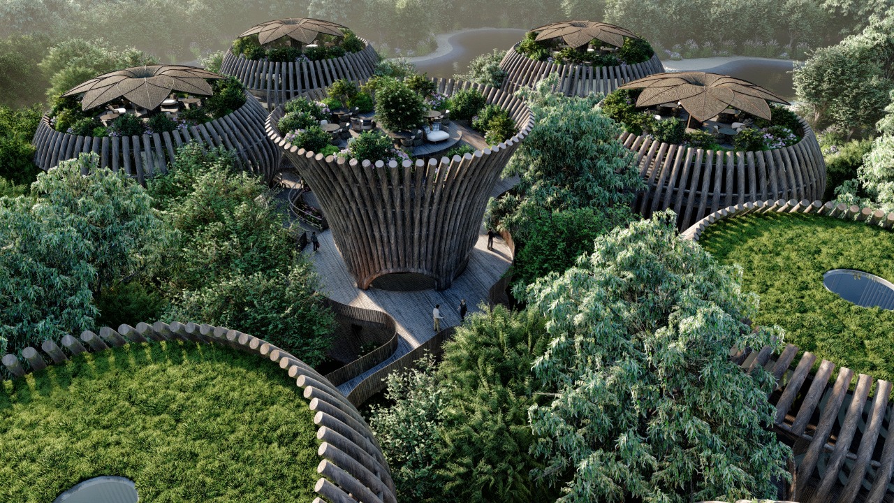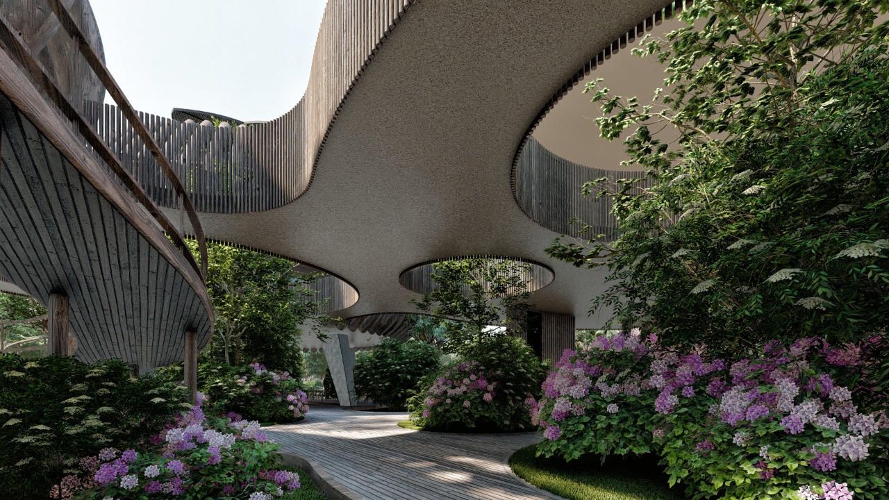 The Holistic Center is inspired by the nests of birds—forms that evoke shelter, protection, and harmony with the surroundings. Conceived as a sanctuary immersed in nature, the project blends organically into the landscape: its volumes appear to emerge from the trees, reinterpreting local handcrafted lamps as living structures that illuminate and embrace the space.